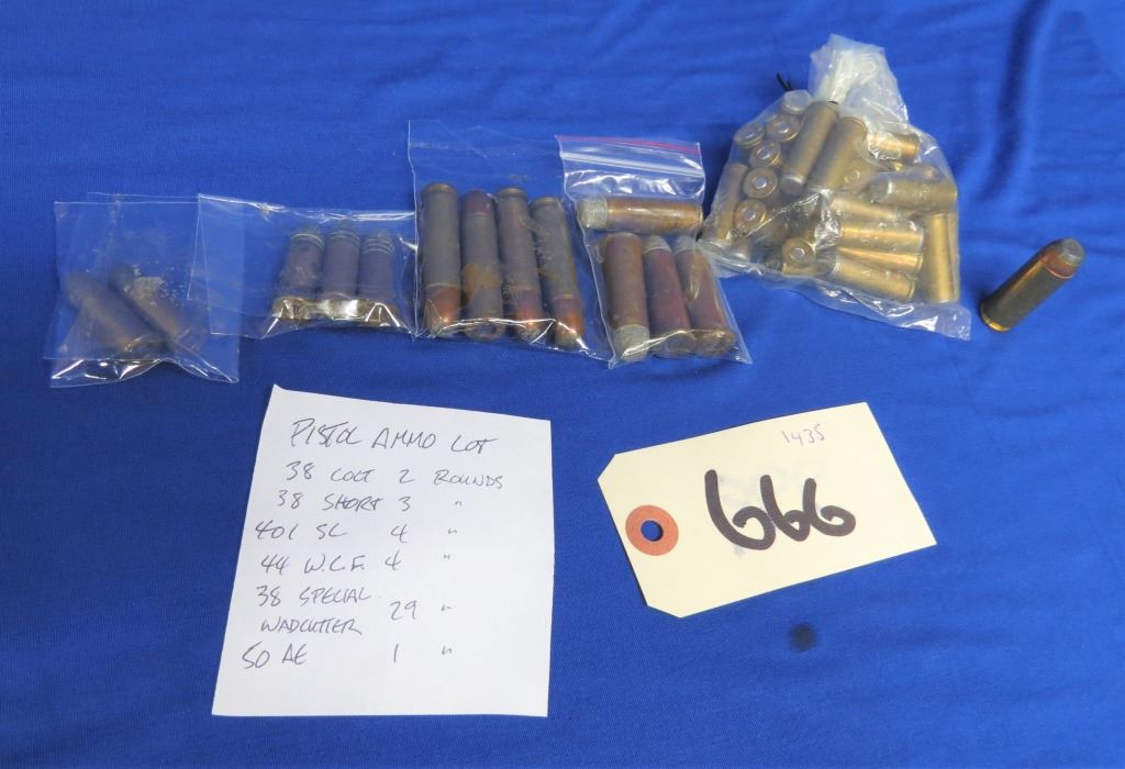 1) 38 Colt , 2 rounds 2) 38 short, 3 rounds 3) 401 SC, 4 rounds 4) 44 W.C.F., 4 rounds 5) 38 specia wadcutter, 29 rounds 6) 50 AE, 1 round