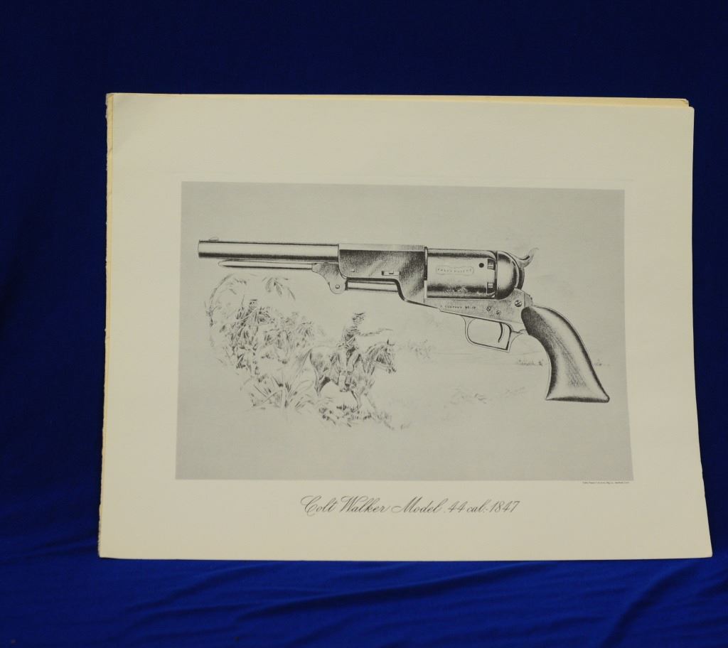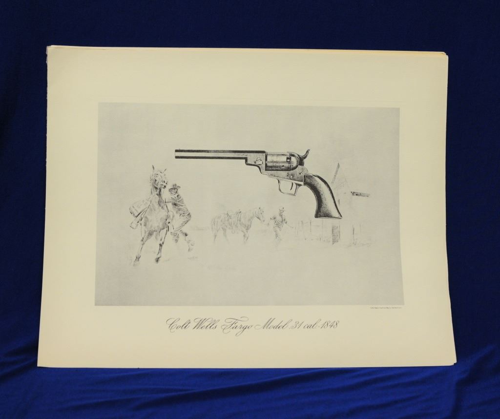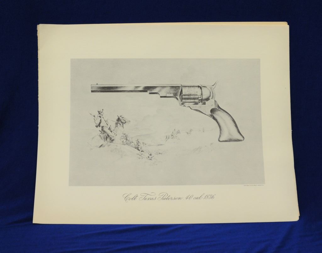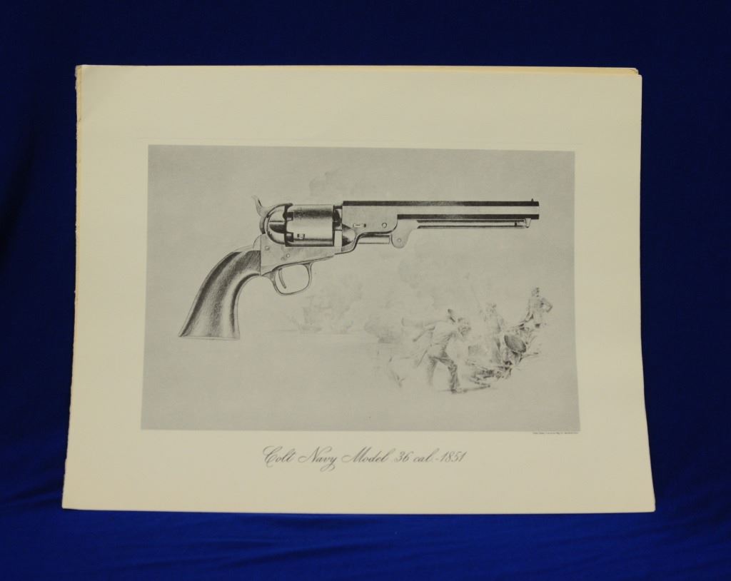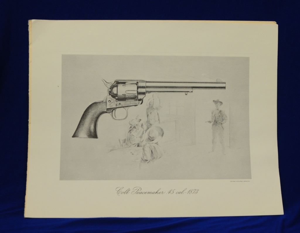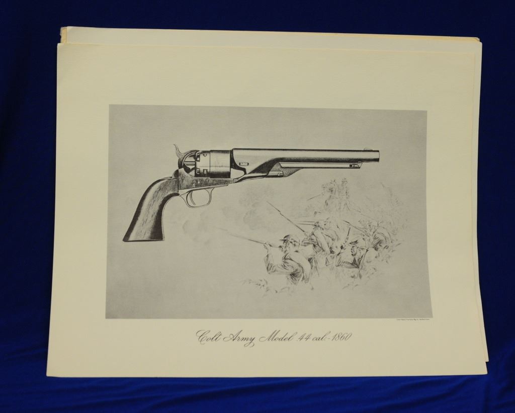Assorted Colt Literature, and Metal Sign, 1) The Colt Action Army Revolver book 2) Colt book 3) Colt Historical Prints set of 6 4) metal Law & Dis Order sign 5) 3 assorted gun pamphlets