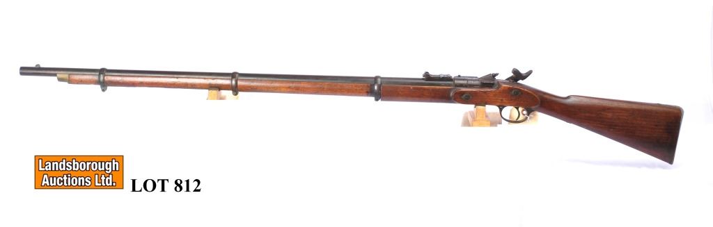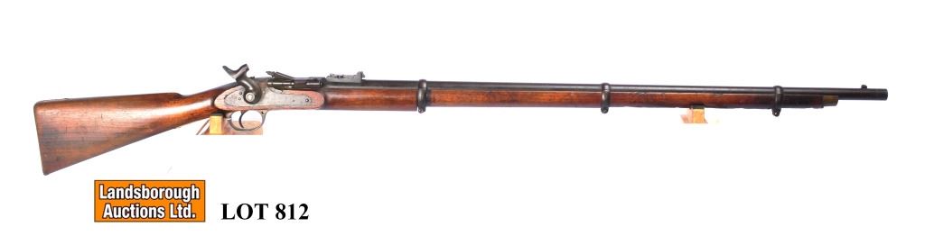 Non-restricted, single shot, 57 snider, 36" barrel, SN none, wood has light scratches and dints but is rough along the bottom of the front stock for about 14", bluing is brown, bore is pitted, one barrel band is missing the screw, one is loose, missing cleaning rod
