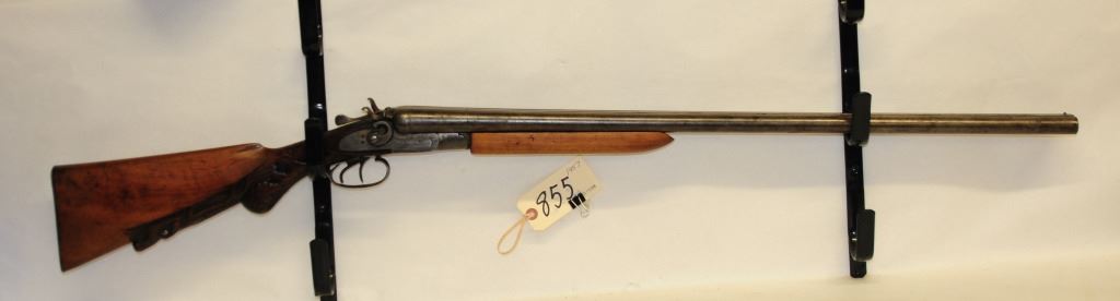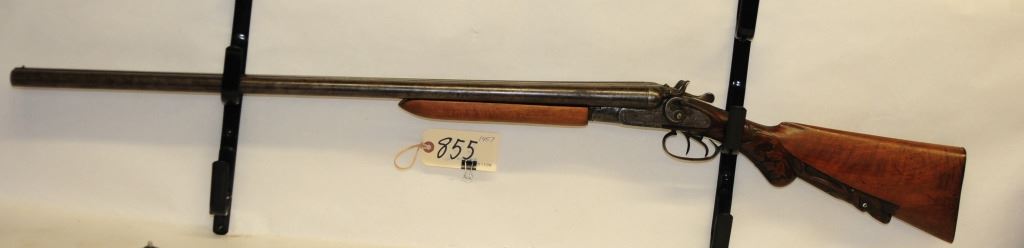 Non-restricted, s x s, 12 ga., 30" barrels, SN 9509, wood is fair has a carving of a deer/stag head on rear stock, bluing is brown/grey, bores have some scoring