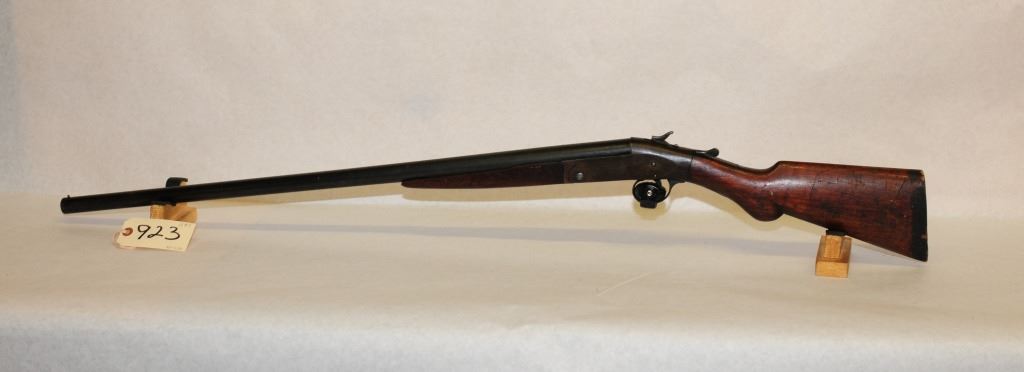 Non-Restricted, Single shot, 12GA, 30" barrel with fixed full choke, SN 114682. Wood forearm has large chip, crack behind upper tang, numerous dents and marks, bluing is brown on receiver, barrel has pitting all over, bore pitted. Missing butt plate.