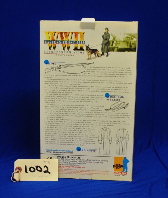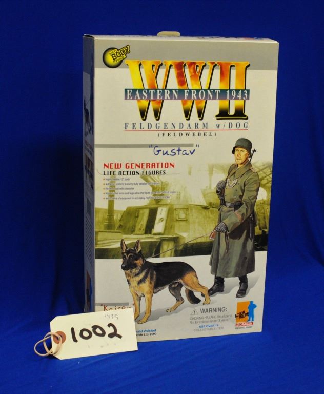 WWII Live Action Figures 1/6th Scale, Gustav and Kaiser - Feldgendarm w/Dog - Feldwebel. Accurately reproduced, 12-inch body, life-like head, triple-jointed arms and legs for posing, authentic detailed uniforms. Made by Dragon Models.
