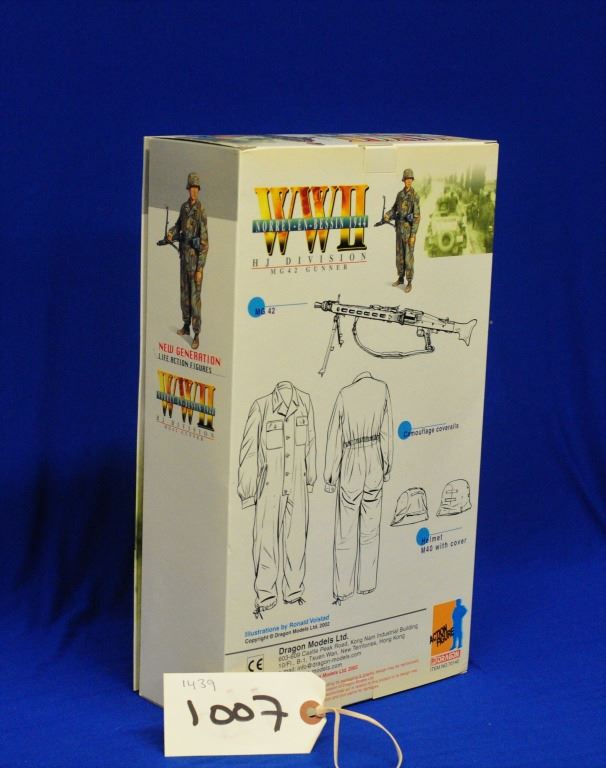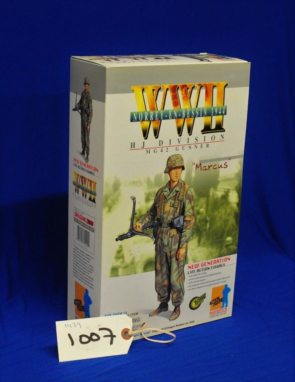WWII Live Action Figures 1/6 th Scale, Marcus - HJ Division MG42 Gunner. Accurately reproduced, 12-inch body, life-like head, triple-jointed arms and legs for posing, authentic detailed uniforms. Made by Dragon Models.