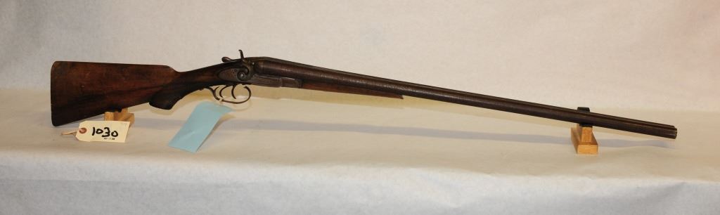 Non Restricted, double shot 12 ga, with full choke, S/N 44630, wood has marks and scratches, bluing is poor, brown, pitted and rusted, bore is poor, missing a hammer.