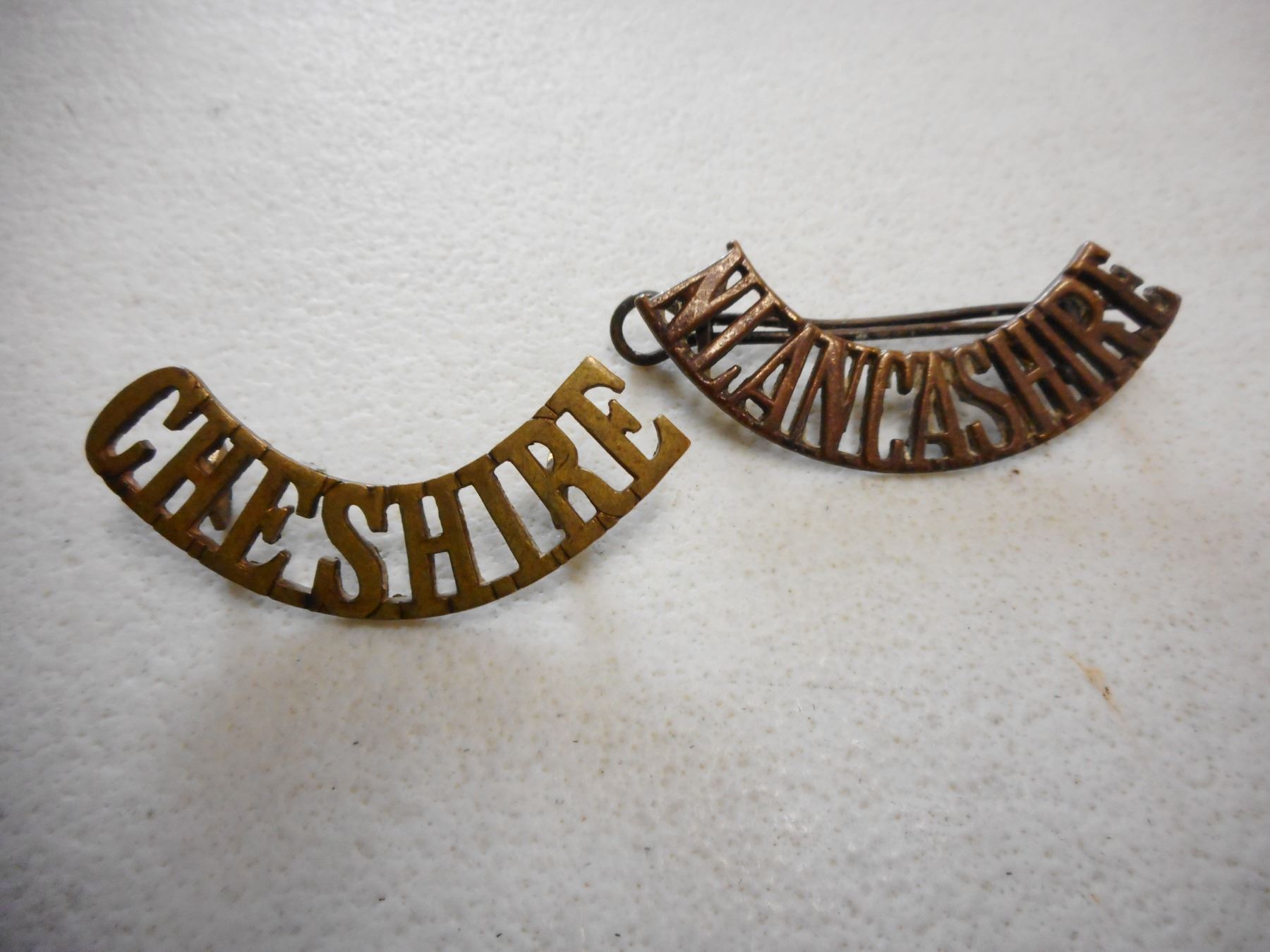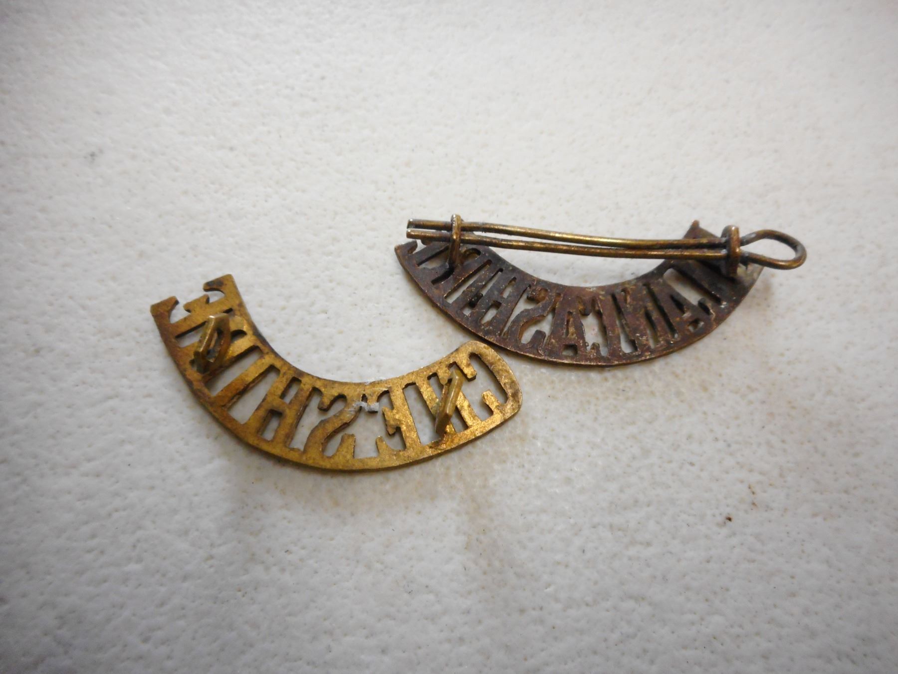 BRITISH WWI/II BRASS SHOULDER TITLES , (1) CHESHIRE NO PIN, (1) NORTH LANCASHIRE LUG BACK WITH PIN, LOT OF 2