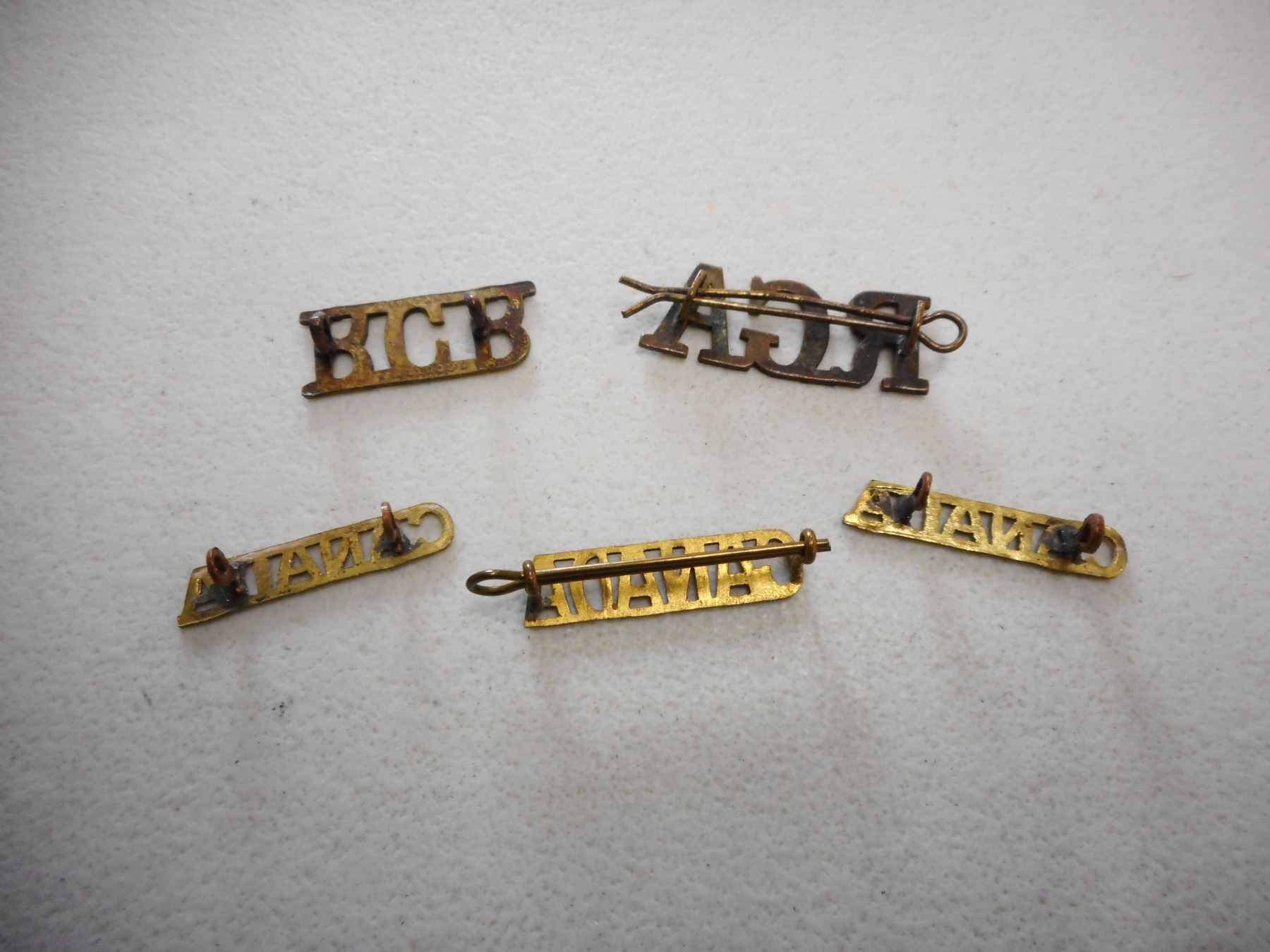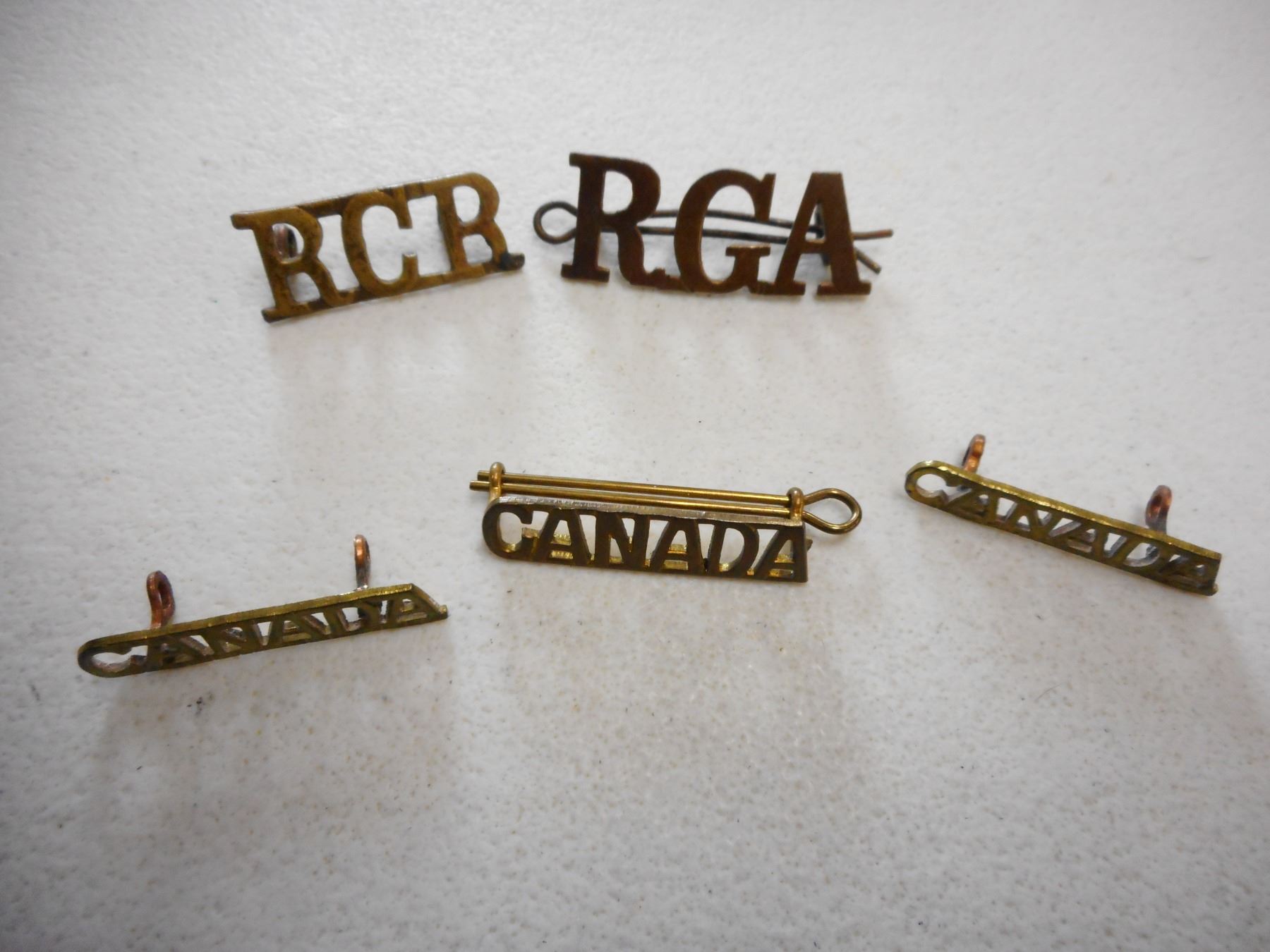 CANADIAN BRASS SHOULDER TITLES , (3) CANADA LUG BACK (1) PIN), (1) R.C.R. LUG BACK NO PIN, (1) R.G.A. LUG BACK WITH PIN, LOT OF 5