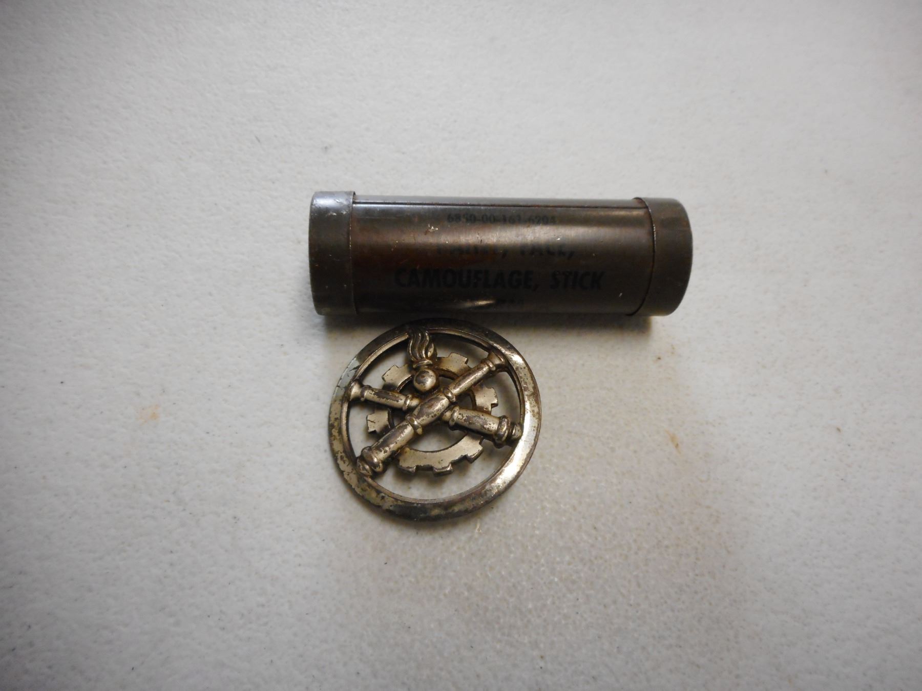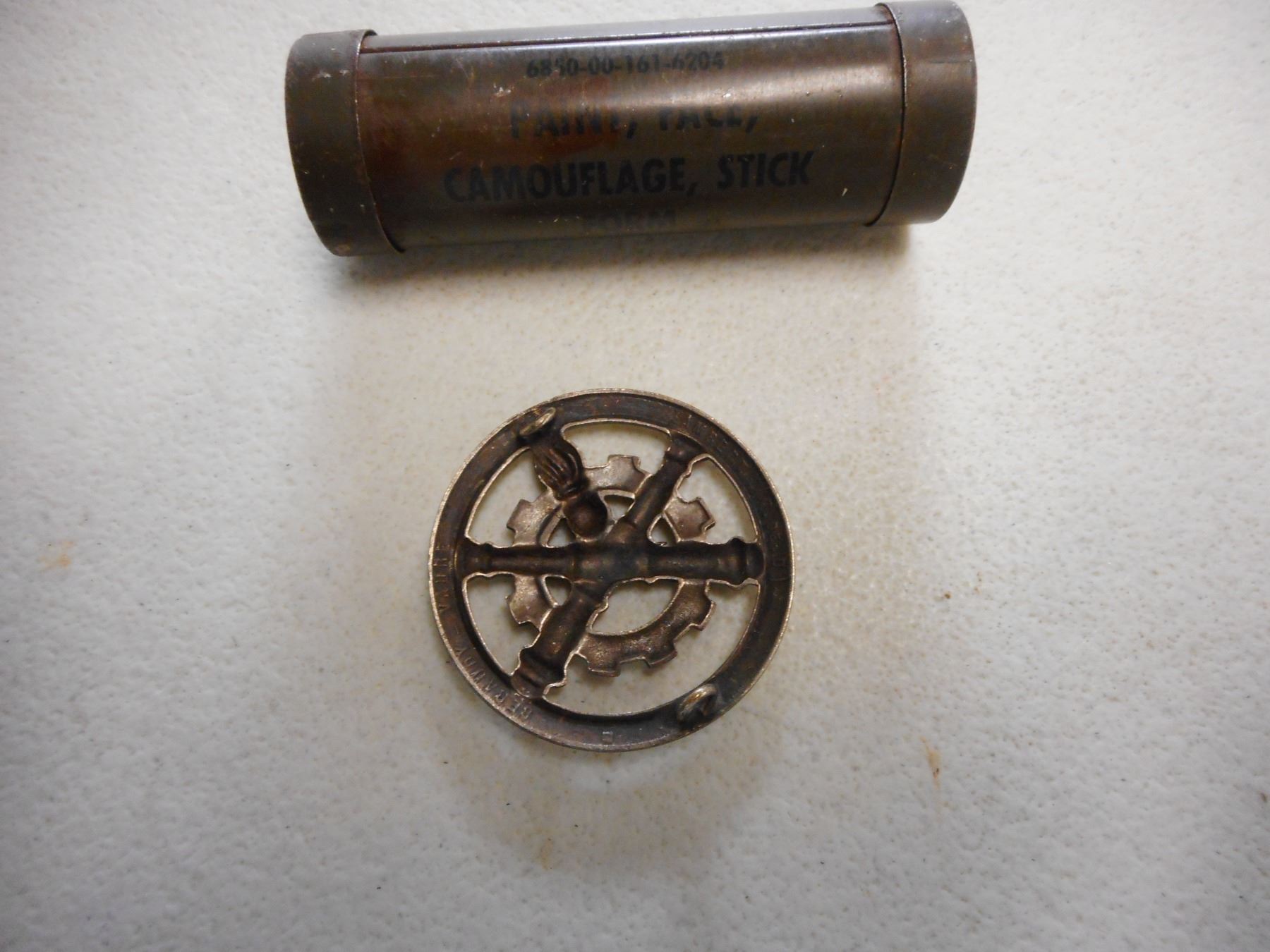 FRENCH HAT BADGE & U.S. CAMOUFLAGE STICK FORM, (1) FRENCH INDOCHINA ARTILLERY HAT BADGE REVER MARKED BERAUDY-VAURE, AMBERT (P. DE.D), (1) PAINT, FACE, CAMOUFLAGE, STICK FORM COLOURS- LIGHT GREEN AND LOAM