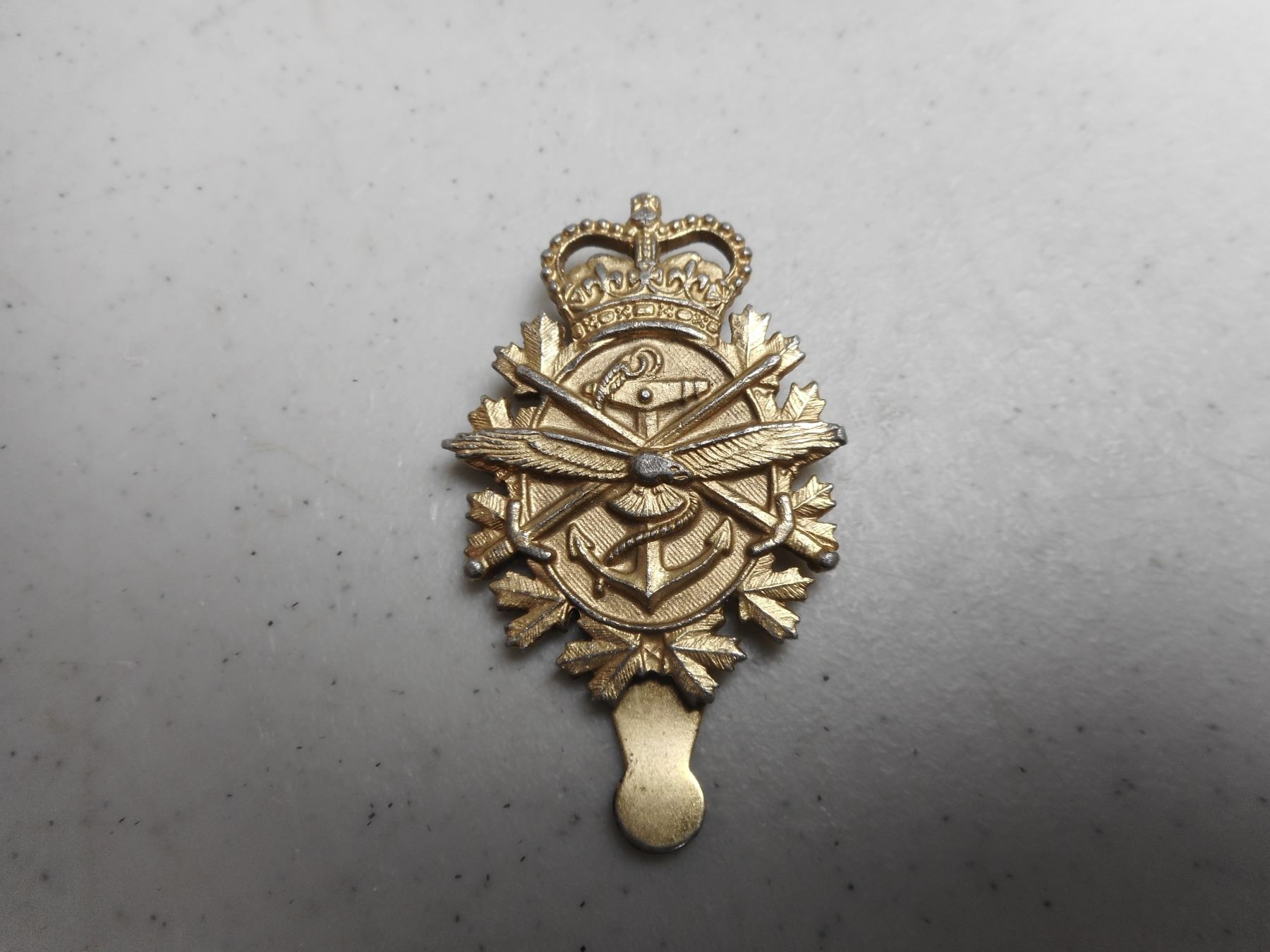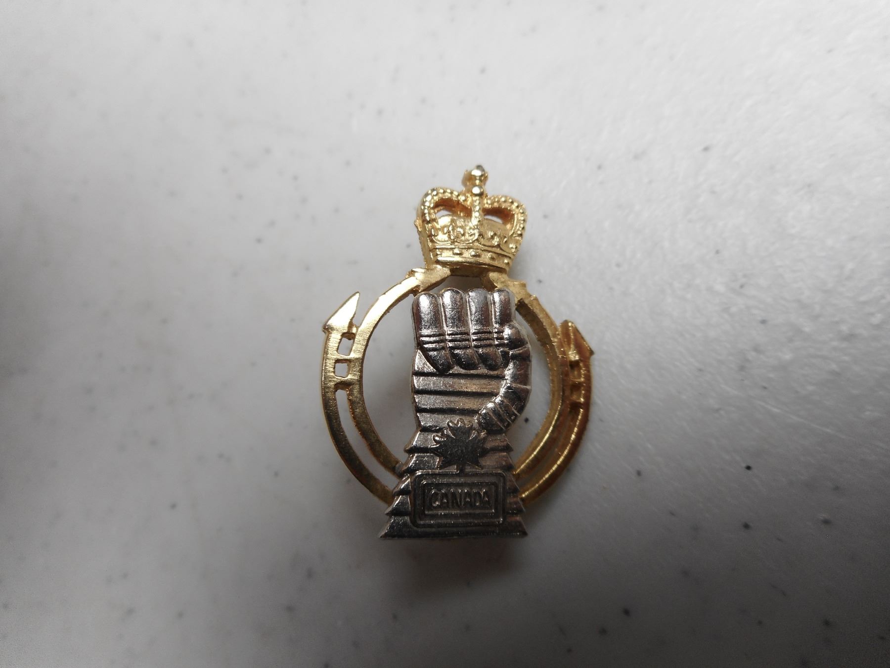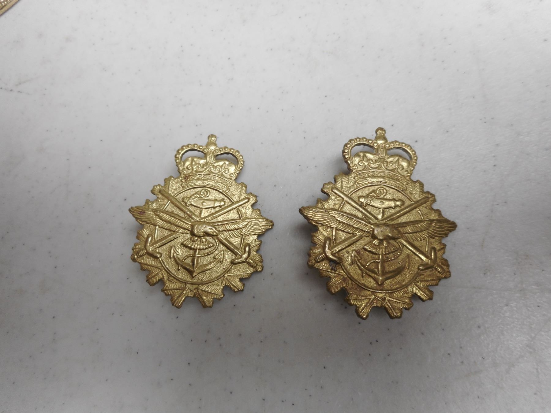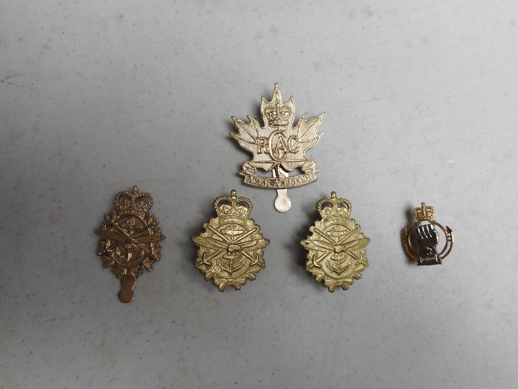 ROYAL CANADIAN ARMY CADET CAP/COLLAR BADGES, (2) SLIDE FASTENERS, (2) SCREW BACK WITH QUEEN'S CROWN NO STOPPER, (1) PIN