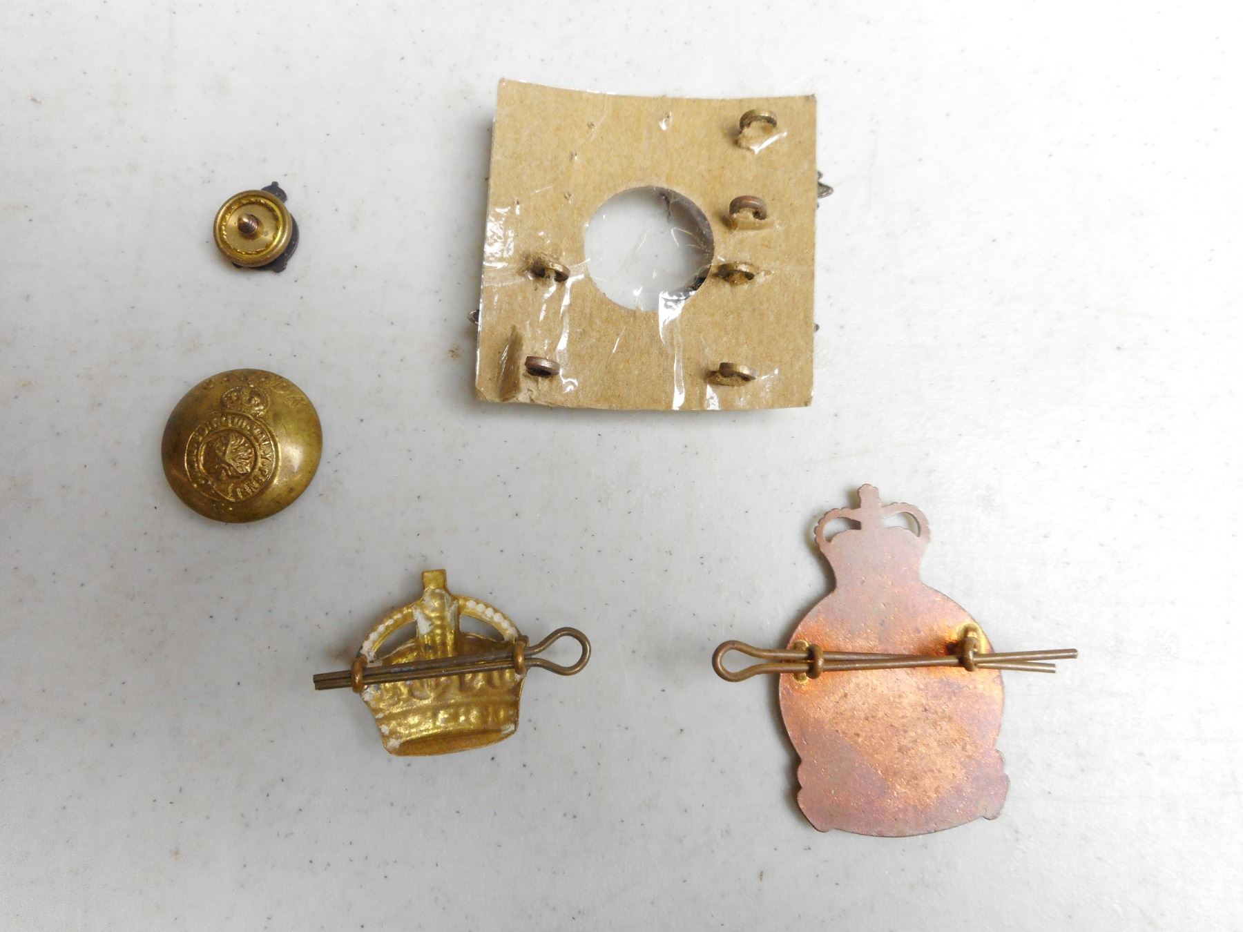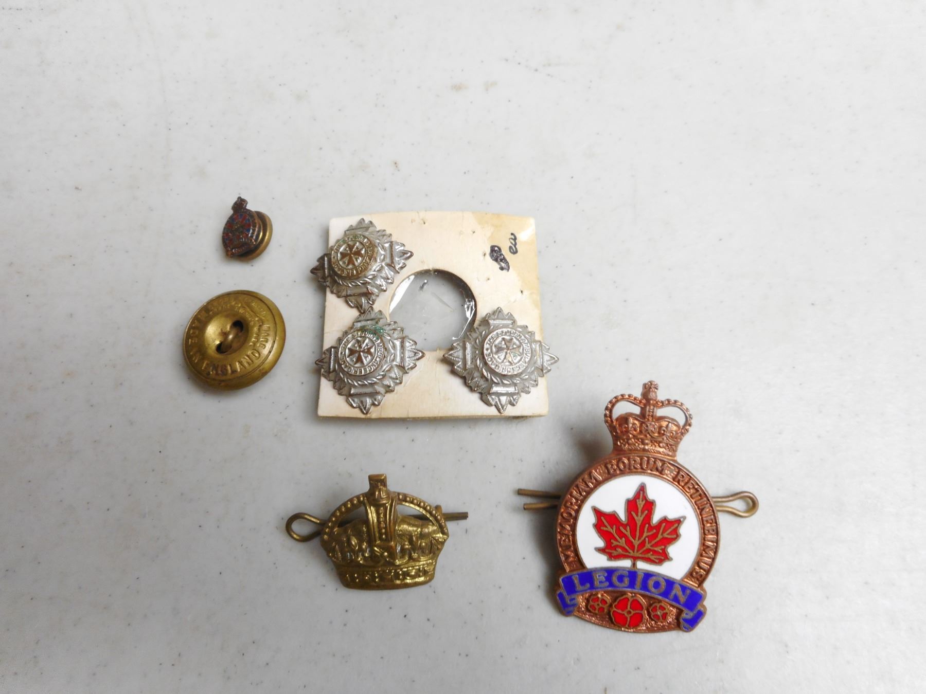 CANADIAN LEGION CAP BADGE, ASSORTED BUTTONS PIN & PIPS, (1) BRONZE CANANDIAN LEGION HAT BADGE LUG BACK WITH PIN & COLLAR PIN (3) PIPS (1) KING'S CROWN PIN LUG BACK WITH PIN, (1) CANADA BUTTON
