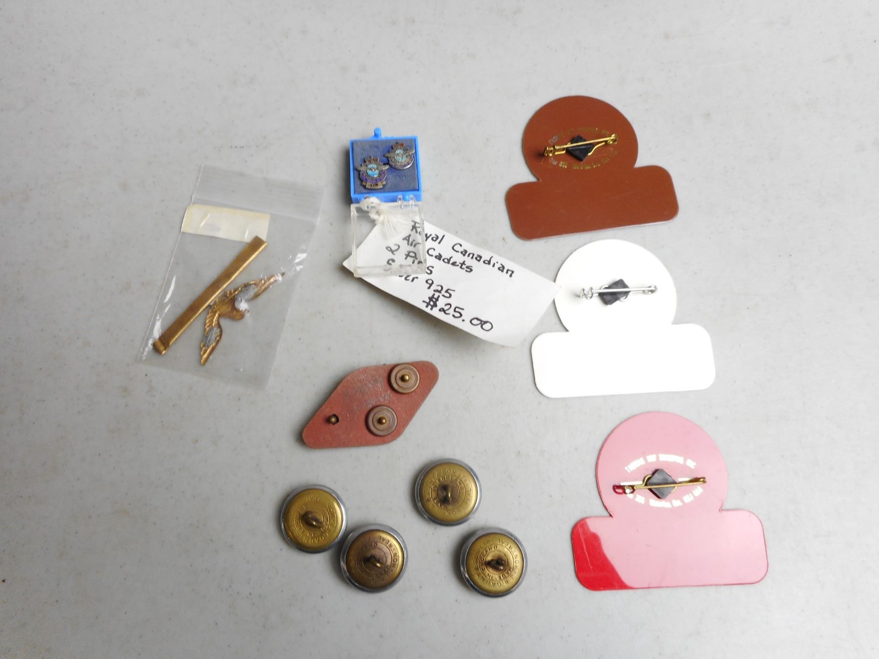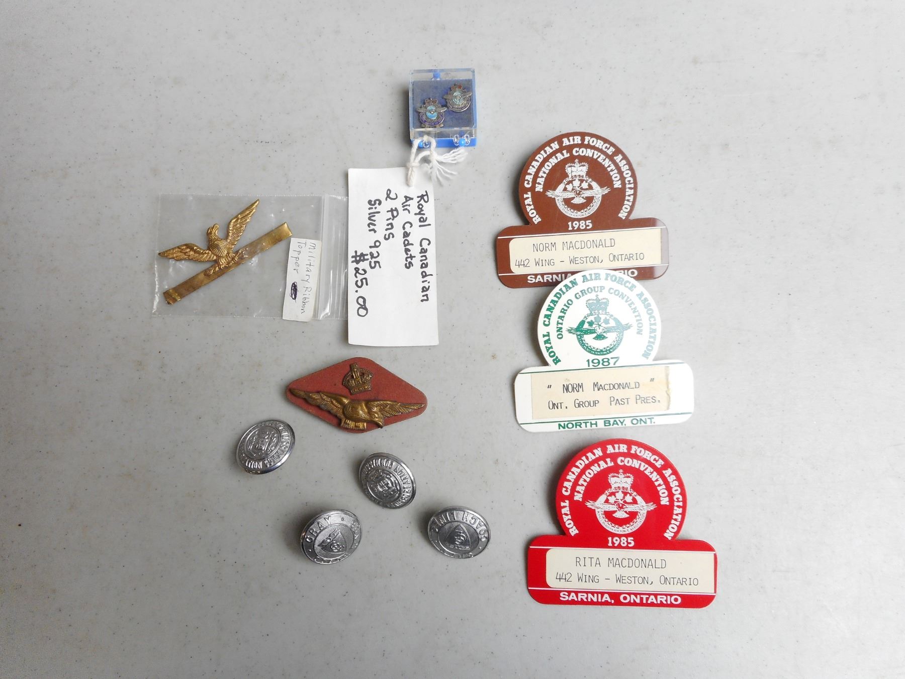 ASSORTED MILITARY WWI/II PINS & BUTTONS, R.C.A.F. HAT BADGE & ASSOCIATION PINS, ROYAL CANADIAN AIR CADET SILVER PINS, U.S. MILITARY RIBBON TOPPER, (4) BUTTON FROM GREY COACH LINE