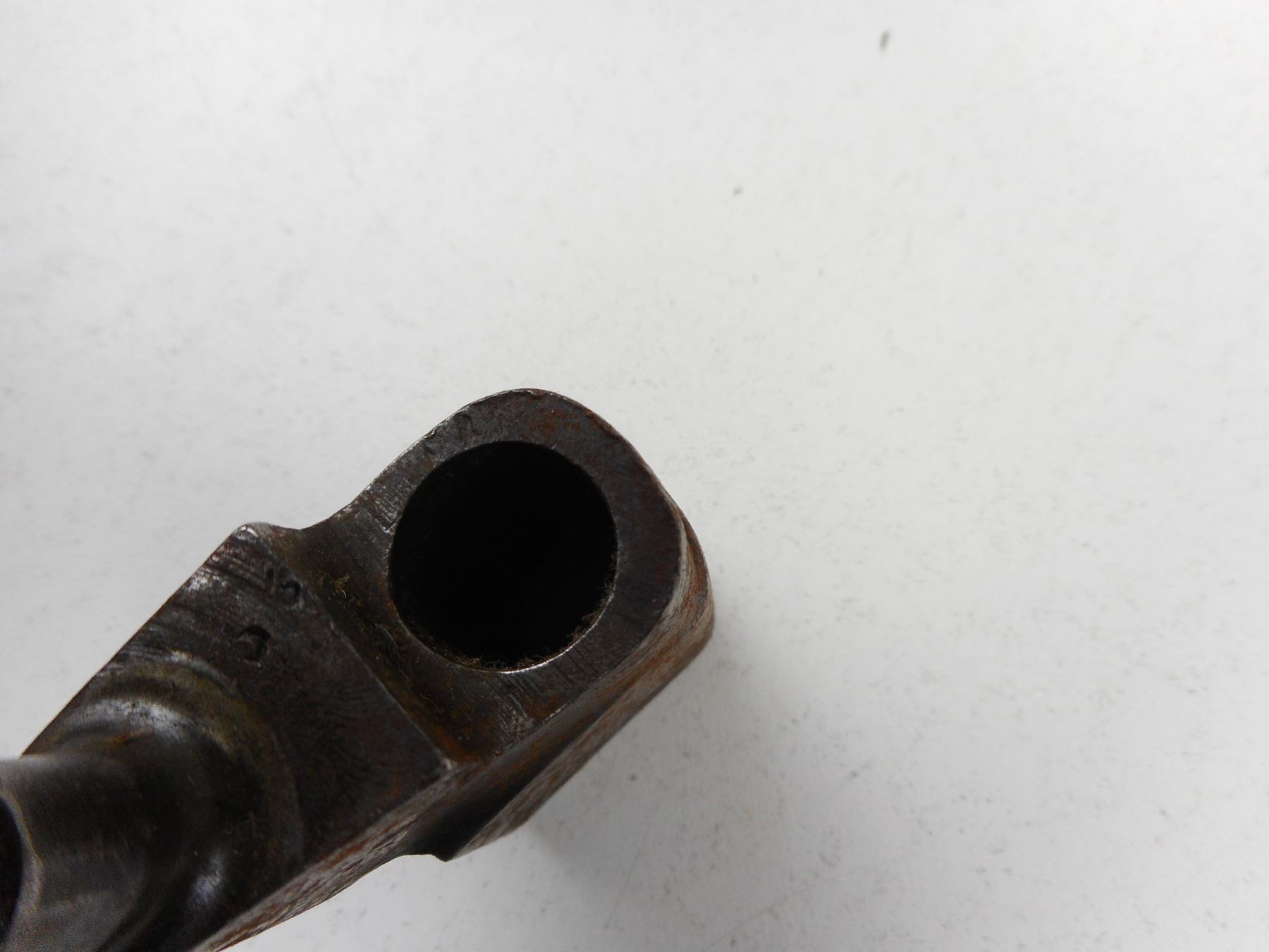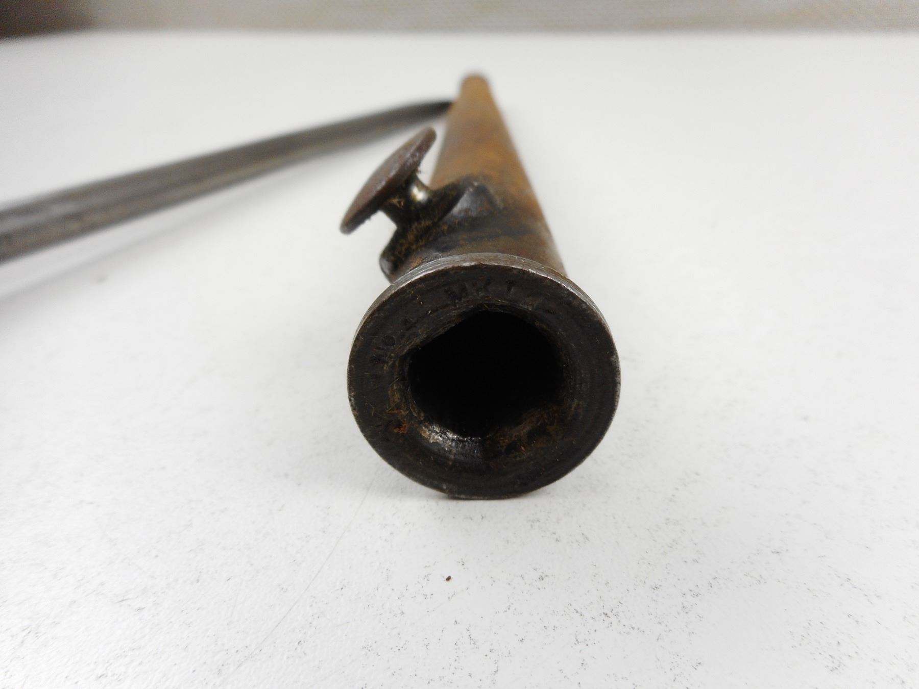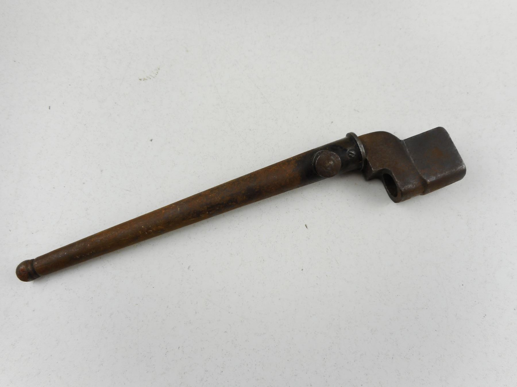 ENFIELD SPIKE BAYONET WITH SCABBARD, VERY FAINTLY MARKED ON SOCKET NO 4 MK II WITH BROAD ARROW MARK & SOLD OUT OF SERVICE MARK, SCABBARD MARKED NO 4 MKI WITH BROAD ARROW MARK