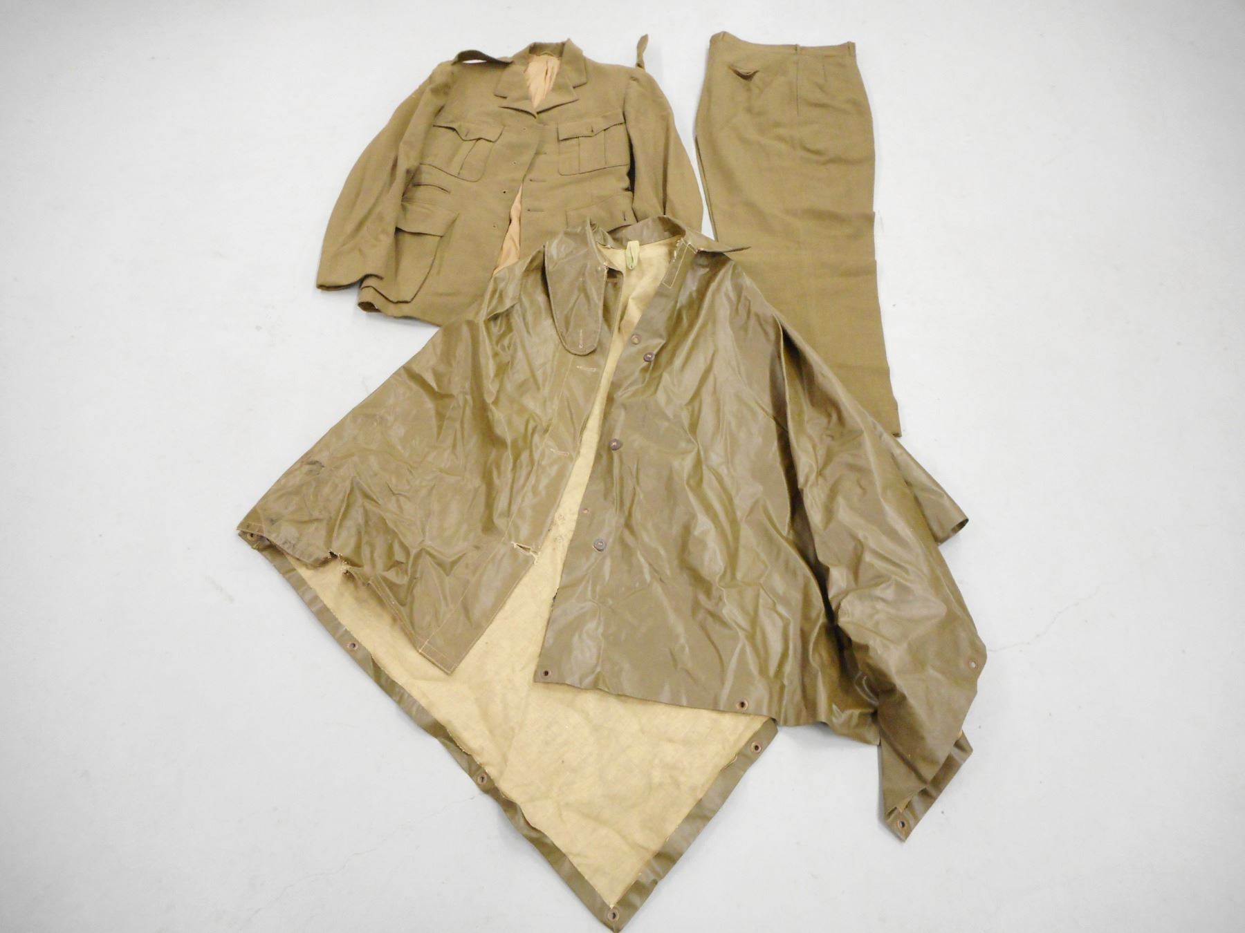UNIFORM WITH WWII RAINCOAT/ GROUND COVER, (1) RAIN COAT/RAIN COVER WITH CANADIAN BROAD ARROW MARK, (1) JACKET & TROUSERS SET UNMARKED
