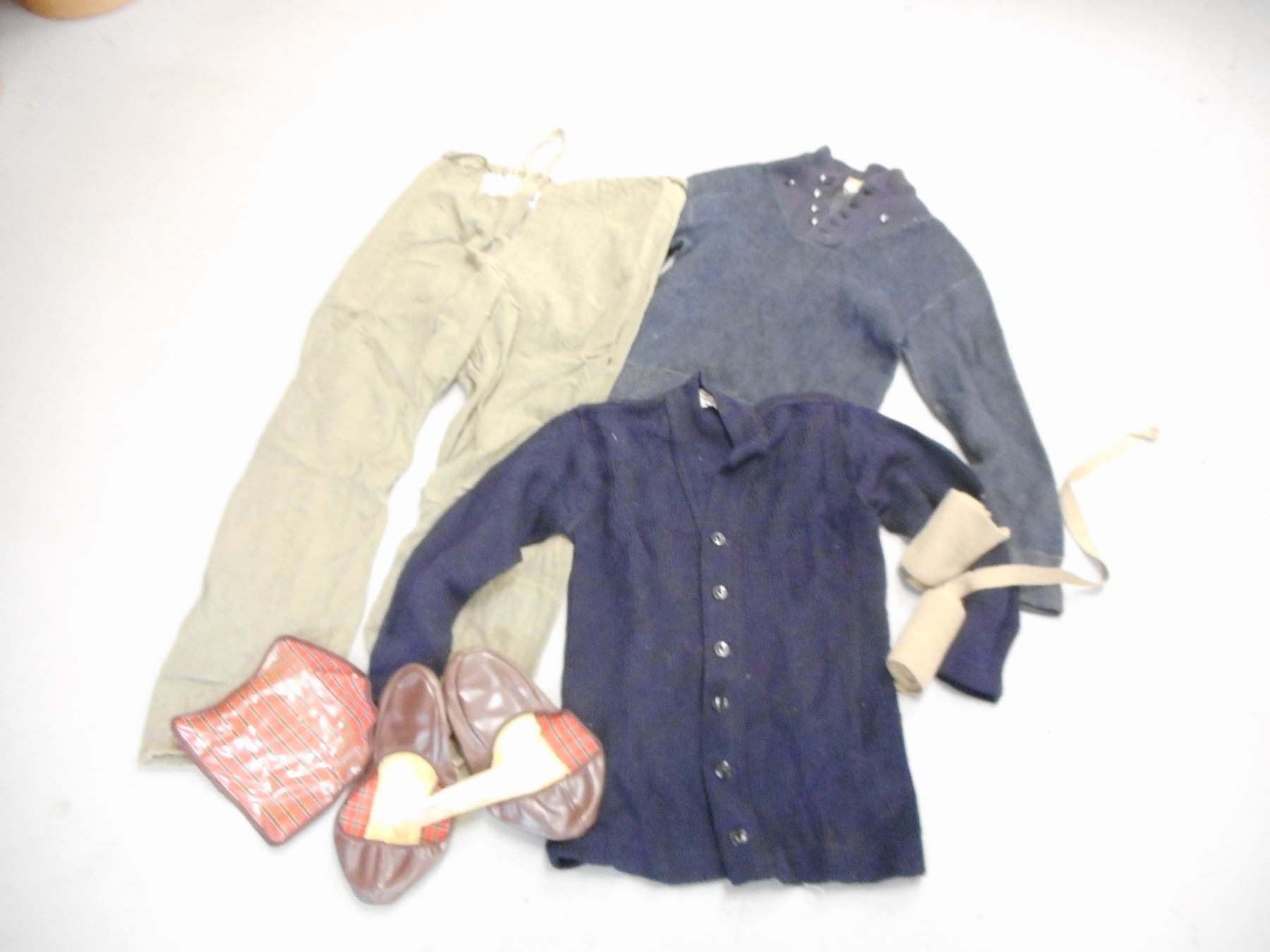 ASSORTED KNITTED AND FLANNEL MILITARY WEAR, (1) KNITTED BLUE R.C.A.F. HIGH NECK SWEATER SIZE M, (1) KNITTED BLUE CARDIGAN SIZE 1, (1) GREEN FLANNEL PANTS SIZE 8, (1) PAIR OF PUTTIES, (1) POUCH WITH FOLDED SLIPPERS & SHOE HORN