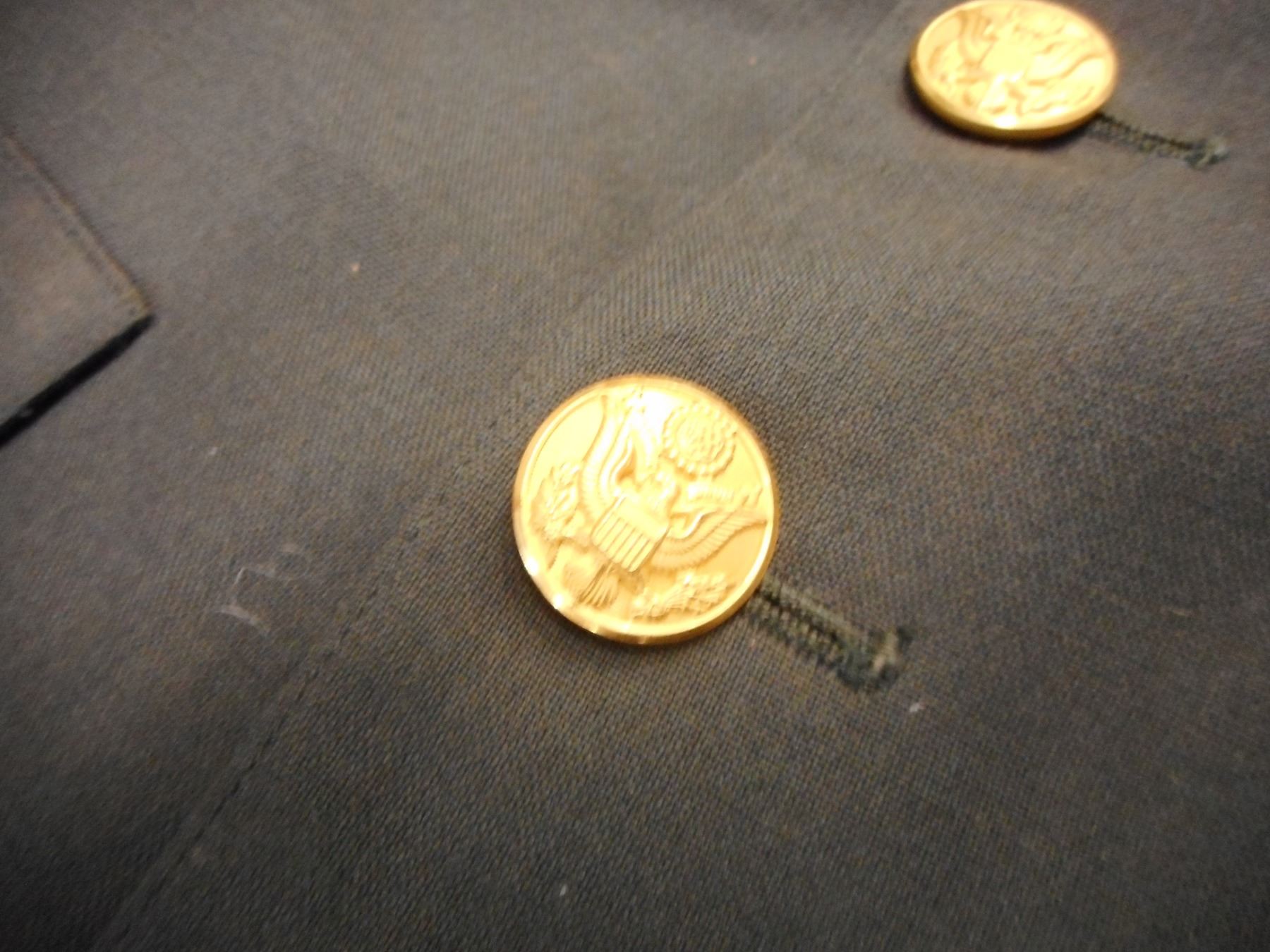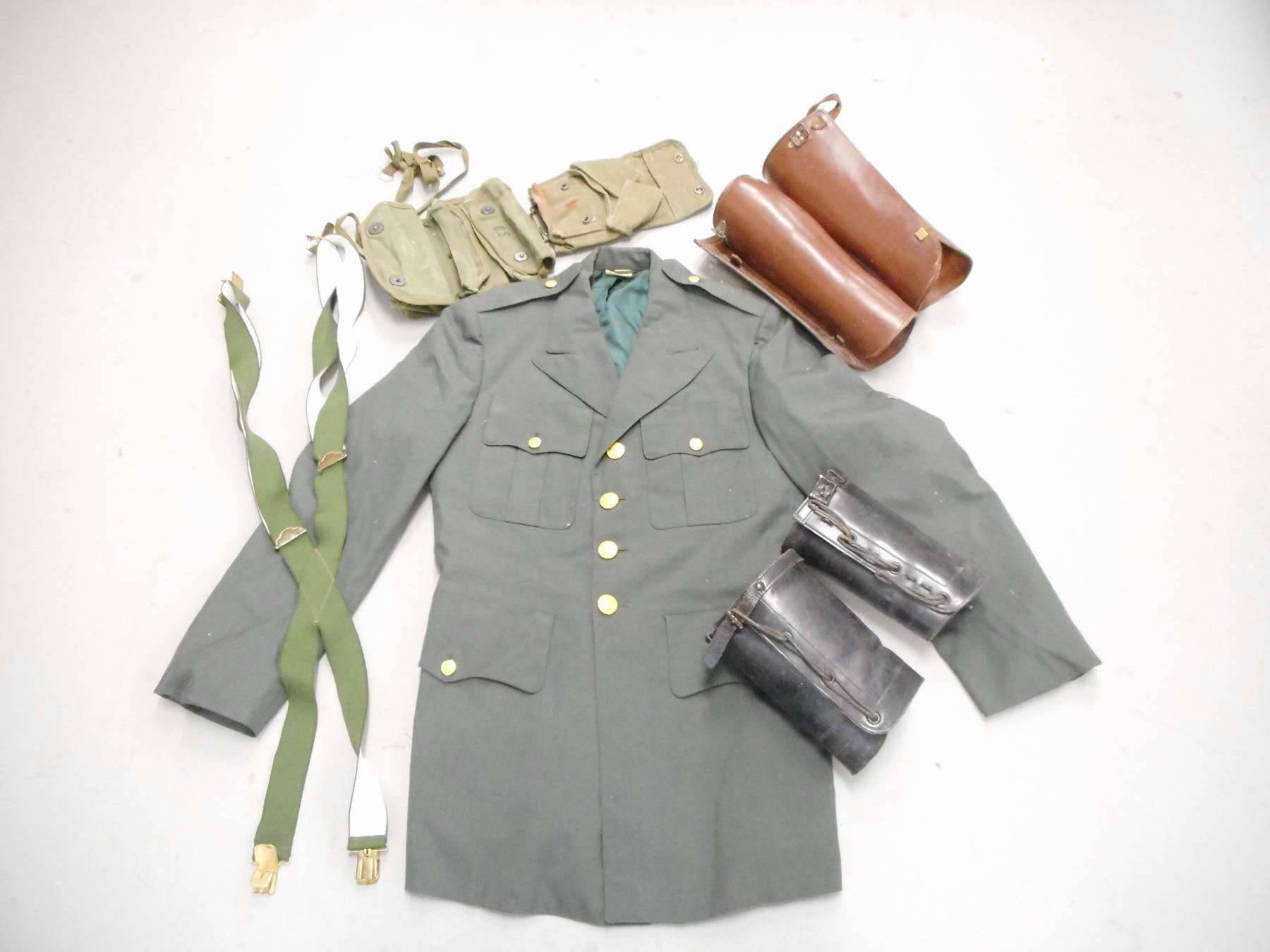 US MILITARY JACKET, LEATHER GAITERS & POUCHES, (1) GREEN JACKET WITH US MILITARY BUTTONS & PADDED SHOULDERS, (1) PAIR BROWN GAIRTERS, (1) PAIR BLACK GAITERS, (2) POUCHES STAMPED U.S.