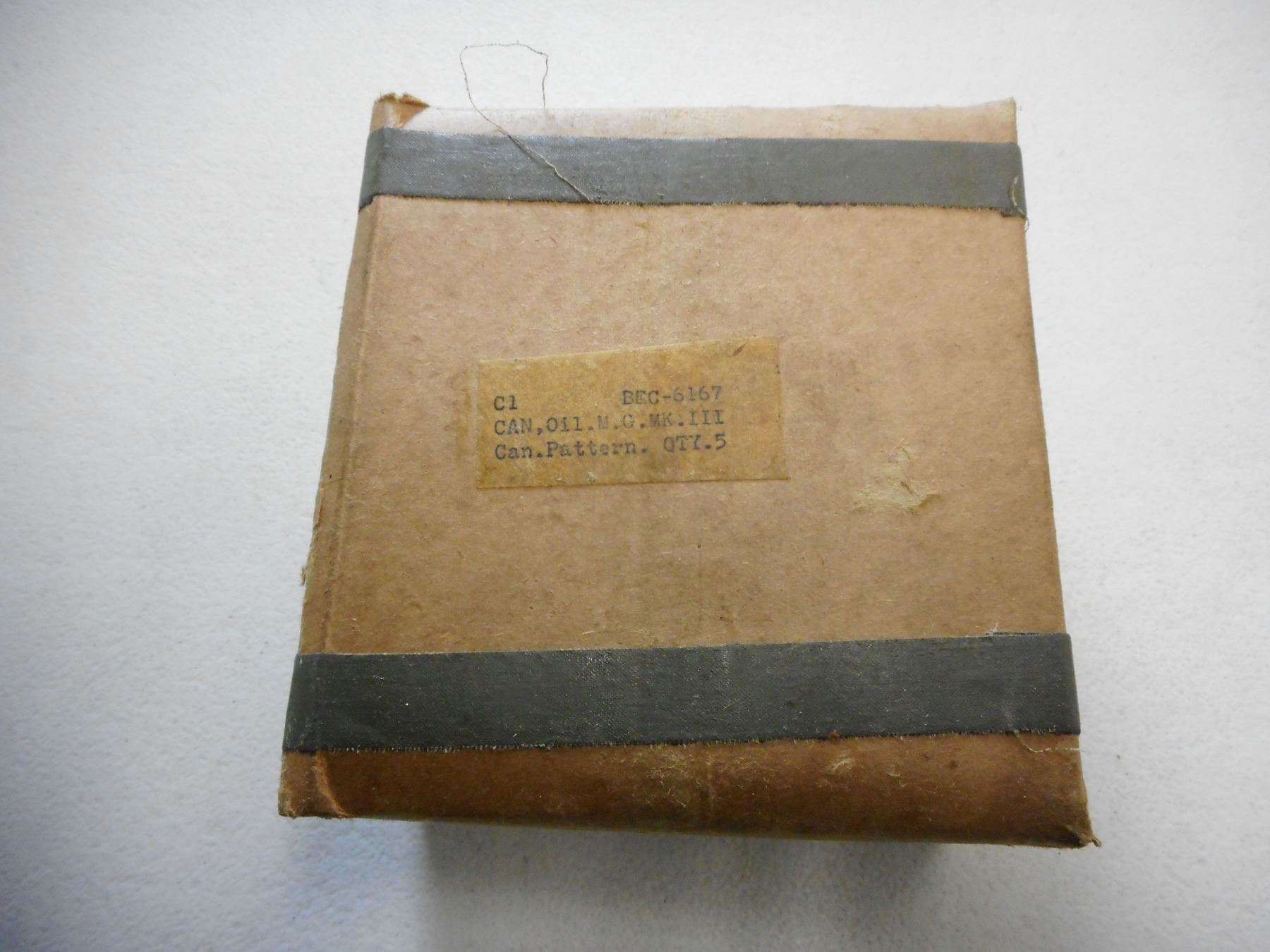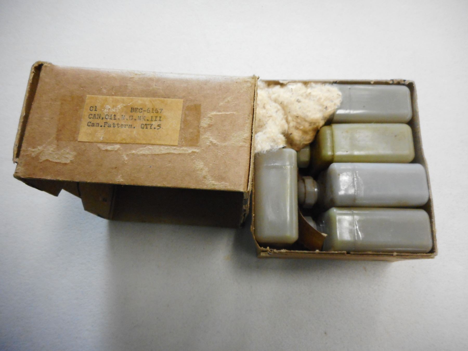 CANADIAN M.G. MK II OILERS IN BOX, BOX LABELED CAN. OIL. M.G. MKIII CAN. PATTERN. QTY. 5, FOR BREN GUN