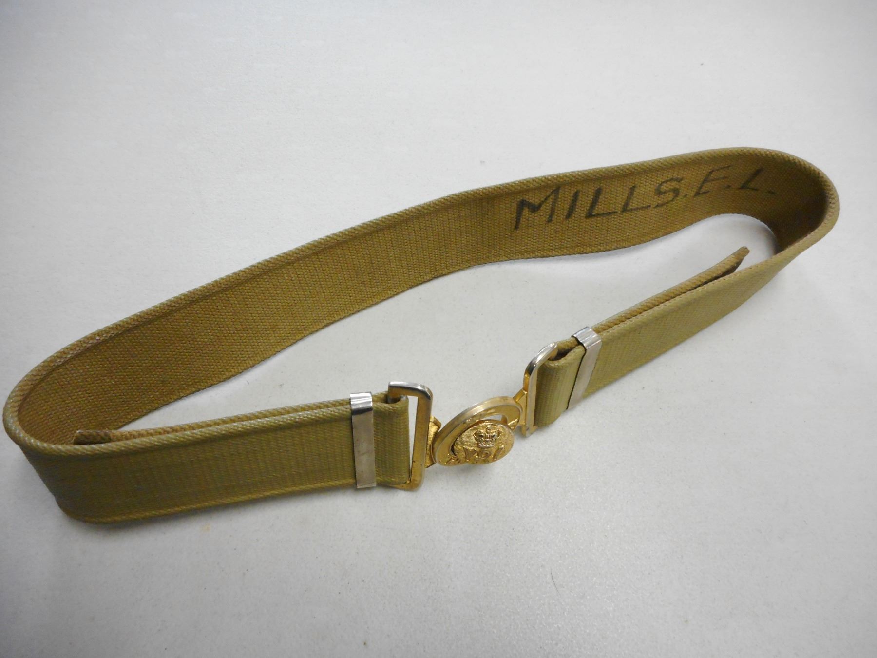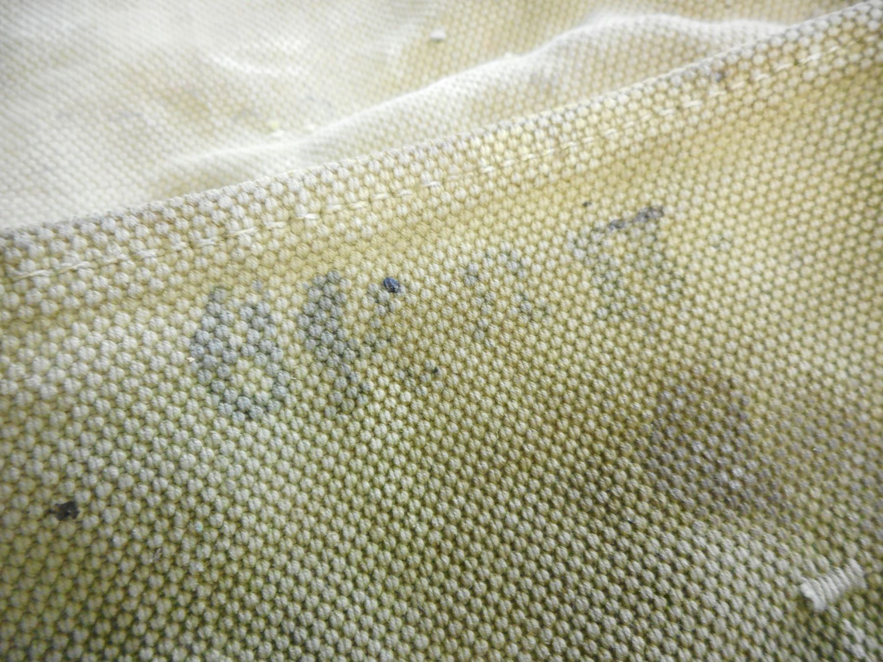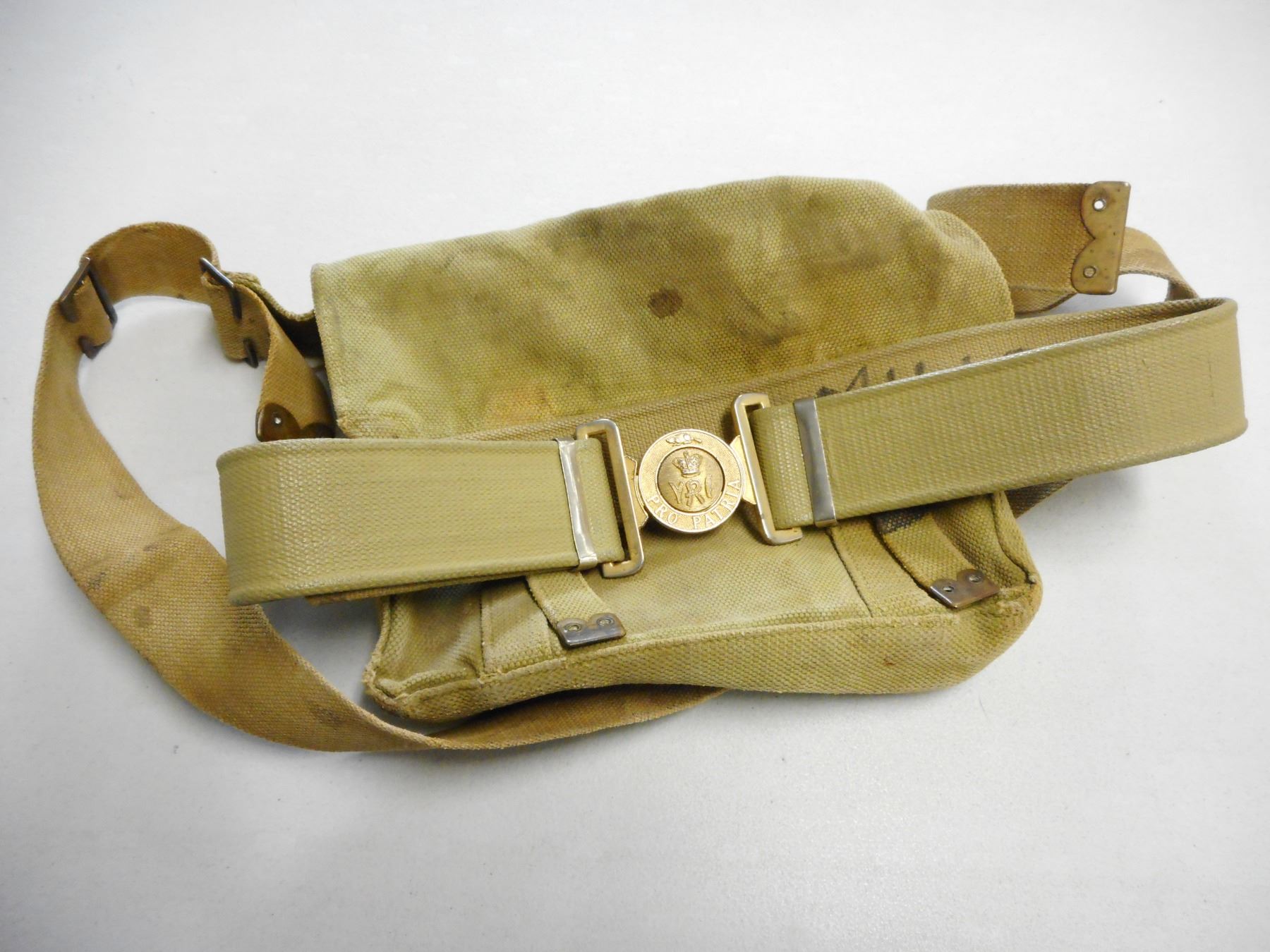 WWI CANVAS SATCHEL & CANADIAN BELT WITH BUCKLE, (1) SATCHEL BROAD ARROW MARKED M W & S LTD 1915 WITH VERY FAINT STAMP ON STRAP M.F.CO, (1) CANADIAN WAXED CANVAS BELT WITH ROYAL CANADIAN REGIMENT BUCKLE