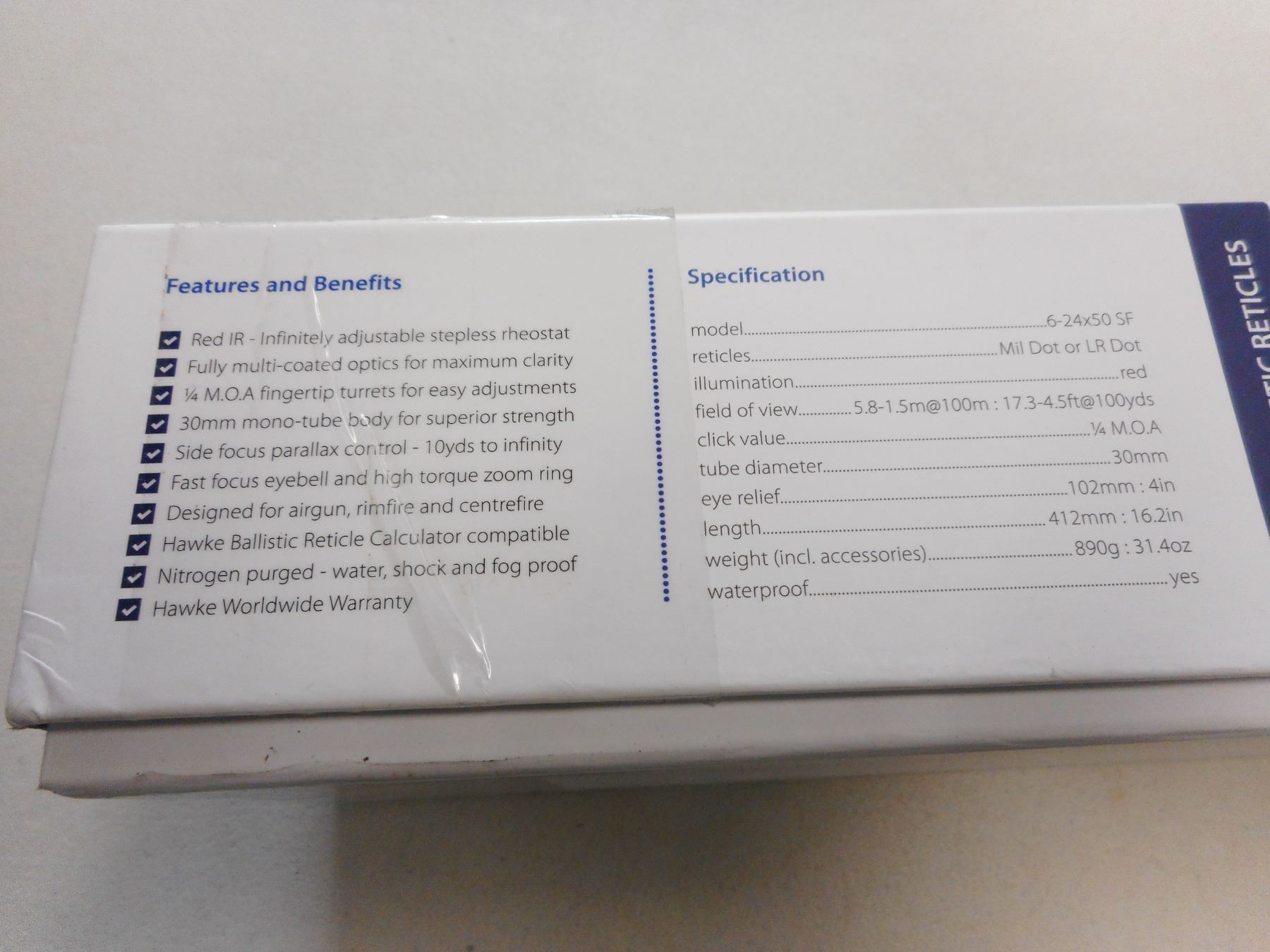 HAWKE ENDURANCE 30 SF 6-24X50 SCOPE , VERY CLEAR VISIBILITY WITH FLIP OPEN LENS CAPS & ORIGINAL BOX & MANUAL