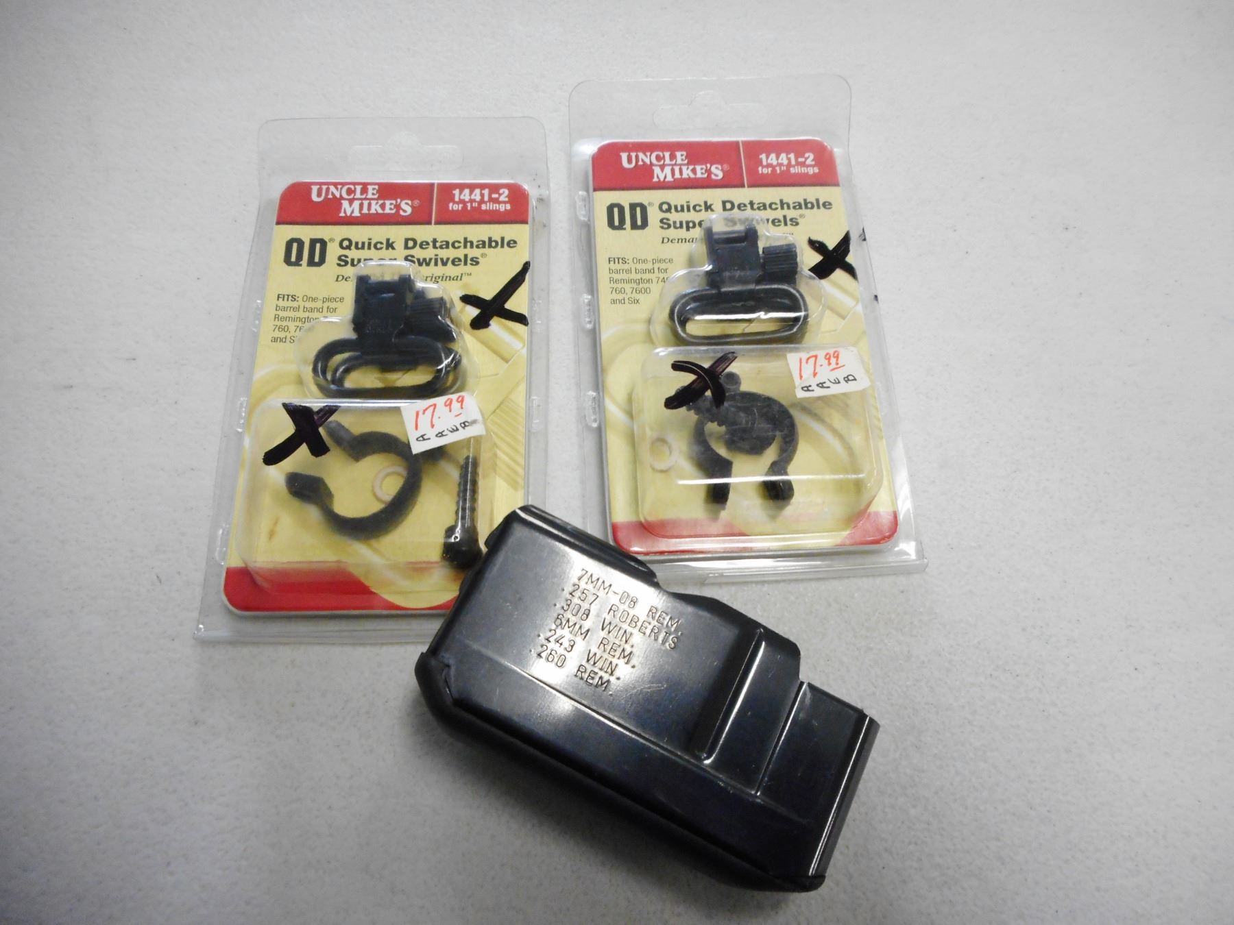 REMINGTON 7600 ACCESSORIES/PARTS, (2) UNCLE MIKE'S QUICK DETACHABLE SUPER SWIVELS FOR REM 740, 760, 7600, AND SIX, (1) .308 MAGAZINE FOR REMINGTON MODEL 7600 SHORT ACTION PLASTIC BOTTOM, LOT OF 3