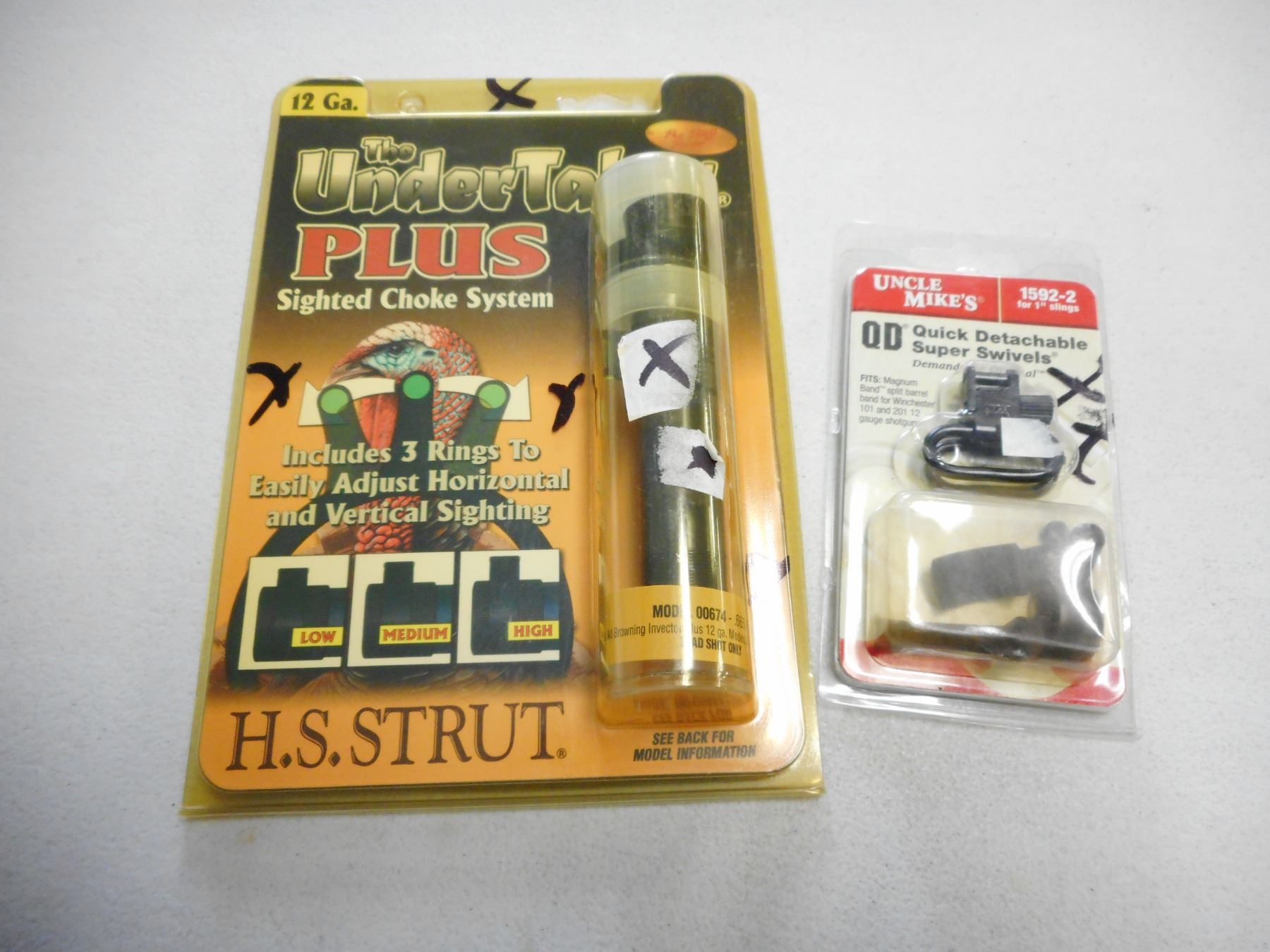 12 GA GUN CHOKE & QUICK DETACH SUPER SWIVELS , (1) H.S. STRUT THE UNDERTAKER PLUS SIGHTED CHOKE SYSTEM, (1) UNCLE MIKE'S QUICK DETACHABLE SUPER SWIVELS, BOTH IN ORIGINAL PACKAGING, LOT OF 2