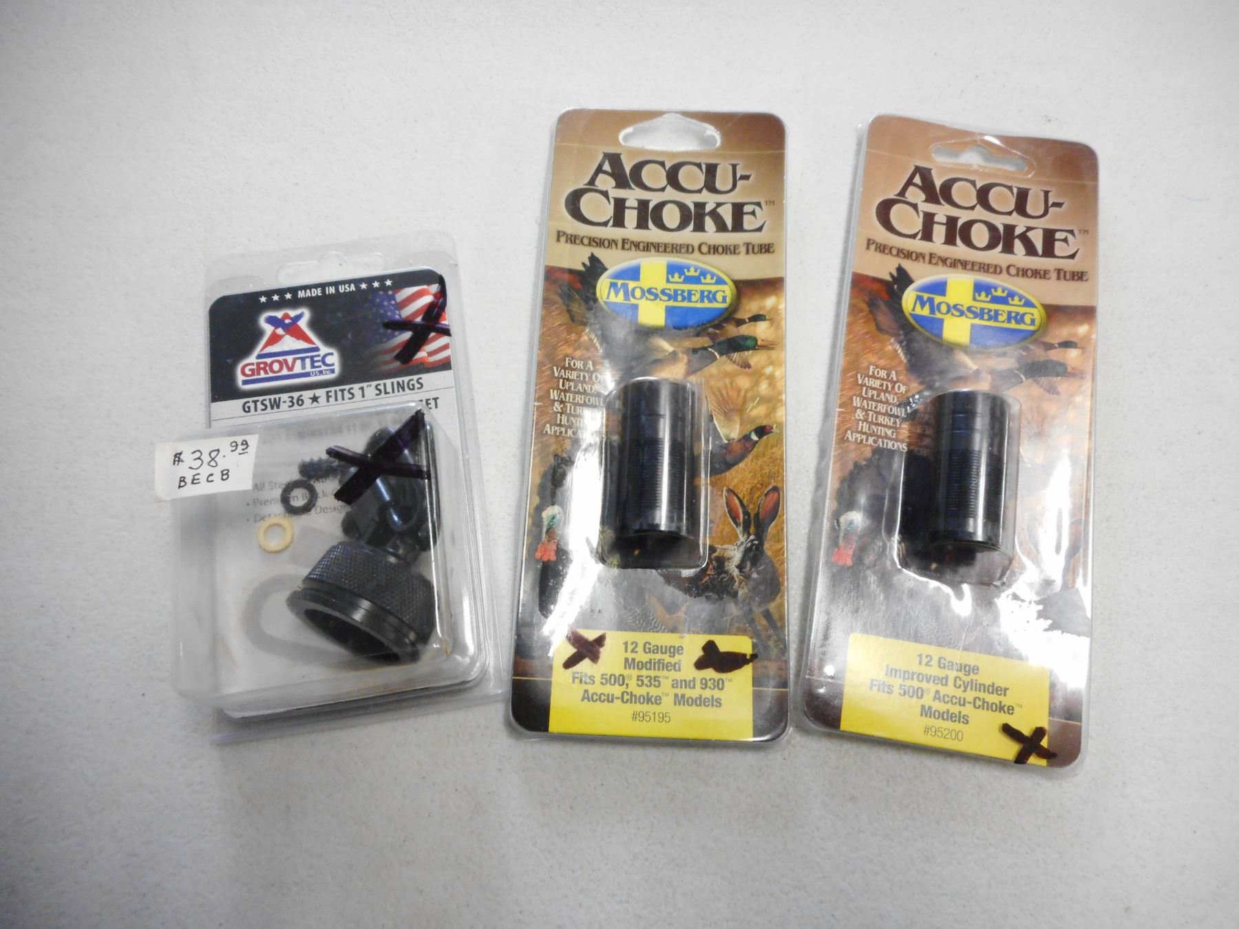 12 GA GUN CHOKE & MAGAZINE CAP SWIVELS SET, (2) ACCU-CHOKE MOSSBERG: IMP. CYL. & MOD., (1) GROVTEC MAGAZINE CAP SWIVEL SET, ALL IN ORIGINAL PACKAGING, LOT OF 3