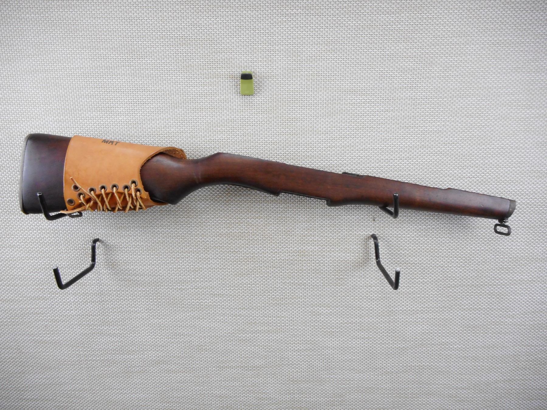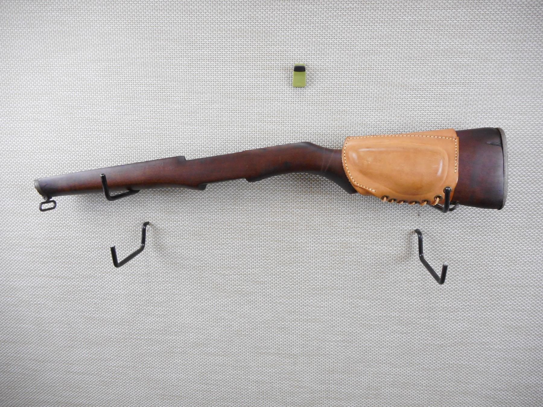 WOODEN GUN STOCK WITH LEATHER BUTT CUFF, FOR M1 GARAND WITH METAL BUTT PLATE AND SLING RINGS, INCLUDES PADDED LEATHER BUTT CUFF