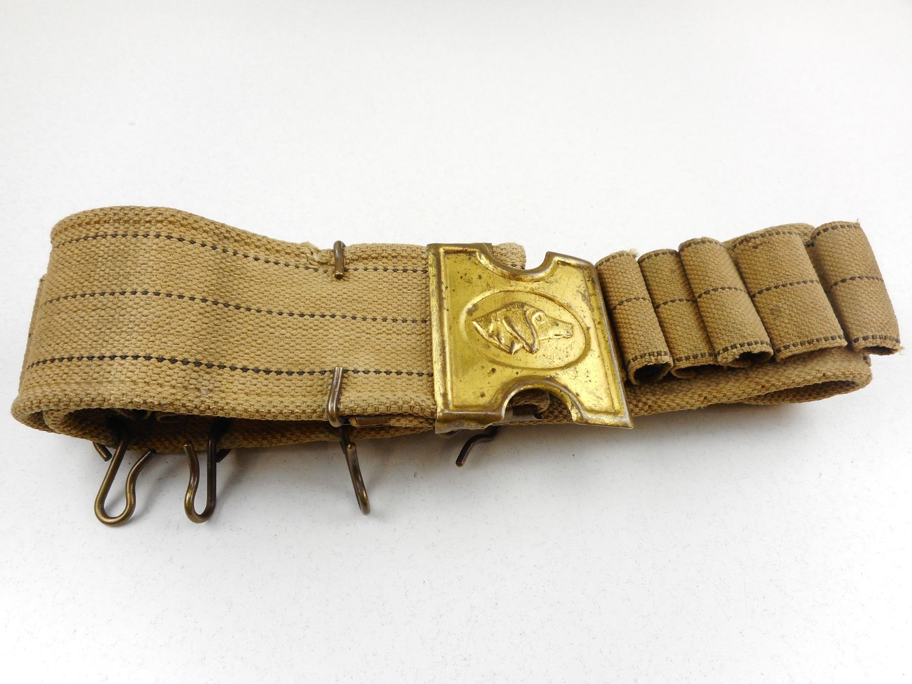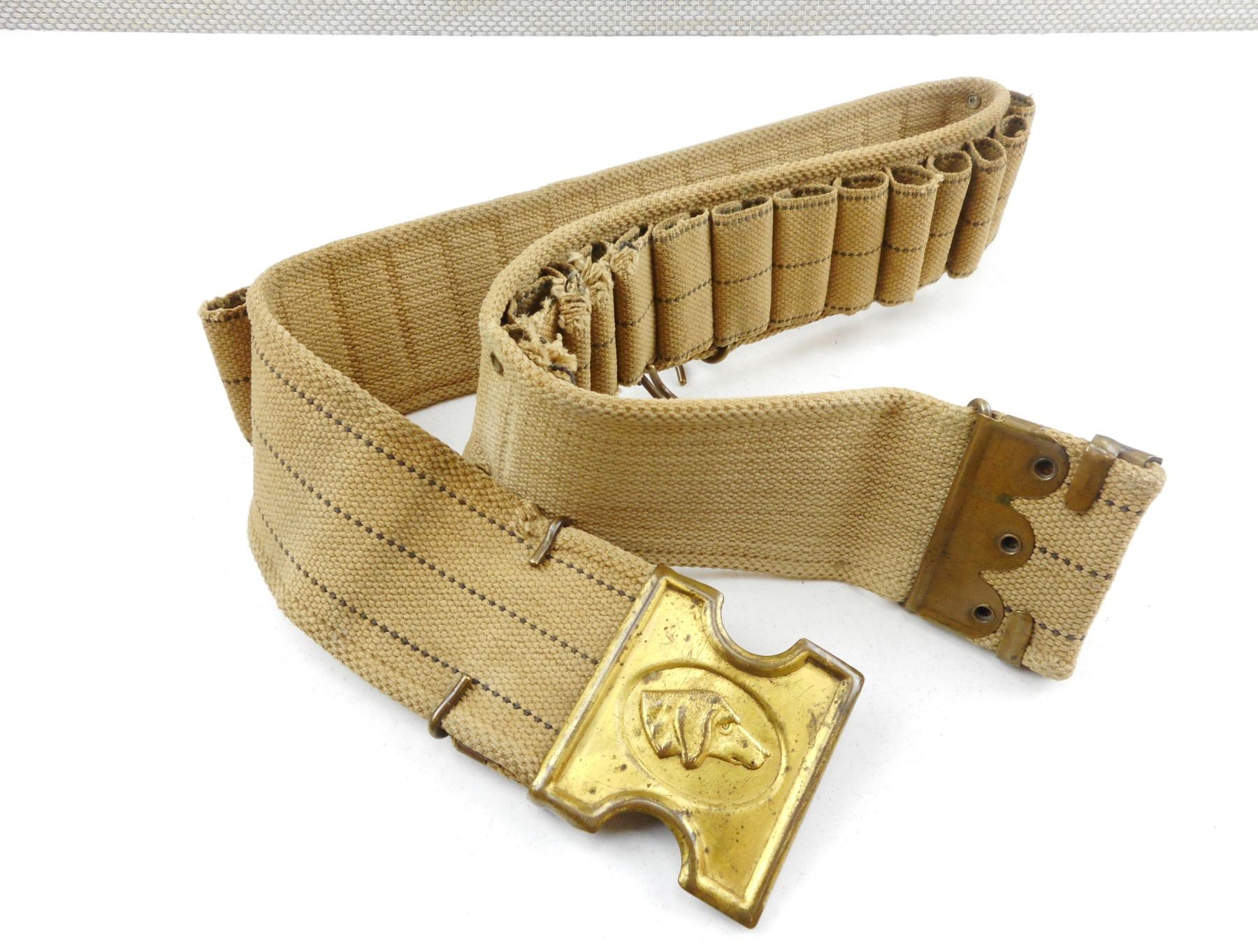 PAT MILLS & ORNDORFF CANVAS BELT & BRASS BUCKLE, DOG BELT BUCKLE MARKED PAT MILLS & ORNFORFF, WITH AMMO SLOTS FOR 12GA & GAME HOOKS