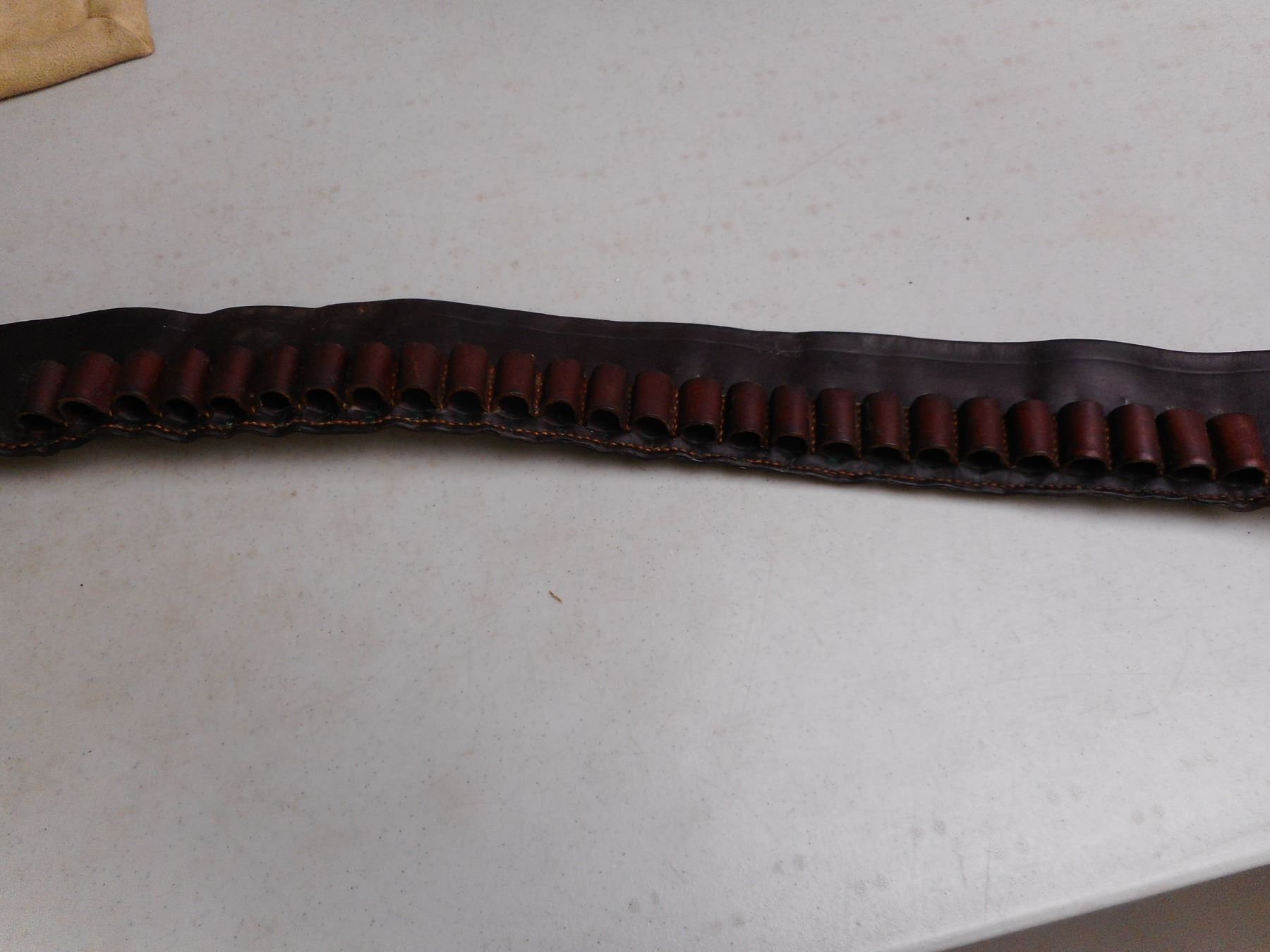 LEATHER AMMO BELT , APPROX SIZE 38", WITH 26 AMMO LOOPS FITS . 45 CAL. CARTRIDGES, SLIT FOR SILVER DOLLARS