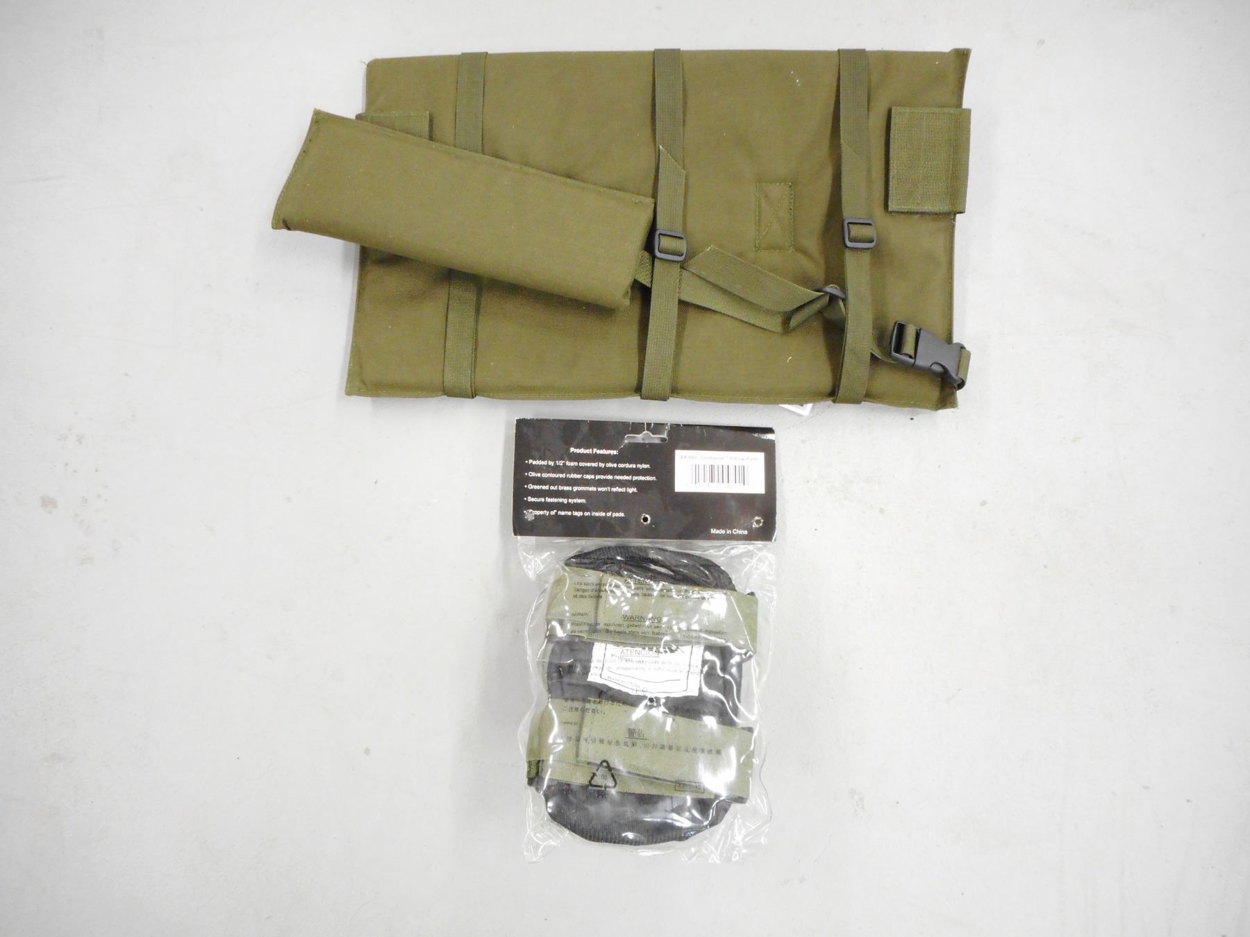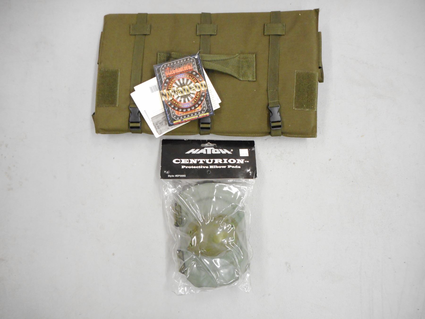 BLACKHAWK SCOPE COVER & CENTURION ELBOW PADS, (1) GREEN CANVAS SCOPE PROTECTOR WITH CROWN COVER WITH ORIGINAL TAGS ATTACHED, (1) PROTECTIVE ELBOW PADS NEW IN PACKAGE, LOT OF 2