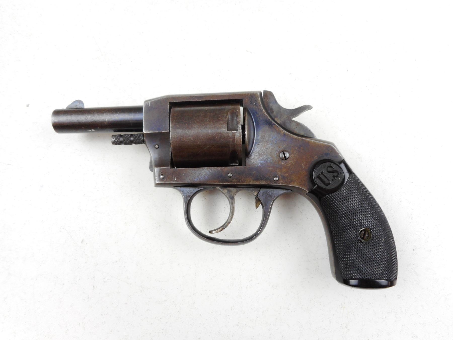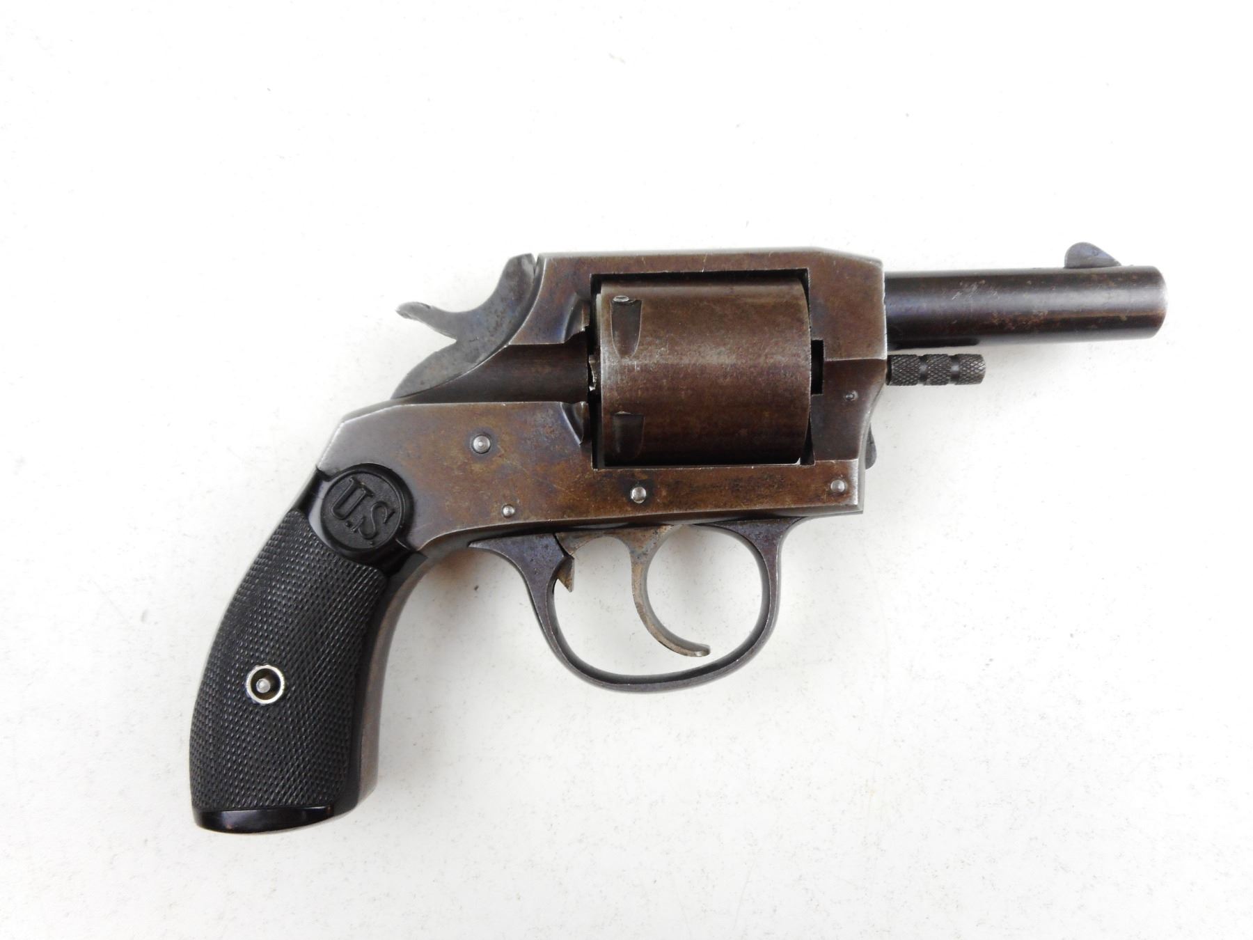US REVOLVER COMPANY , MODEL: DOUBLE ACTION , CALIBER: 38 S&W , GREY PATINA, HARD RUBBER CHECKERED GRIPS, NOTCH & BLADE SIGHTS, NOT INDEXING, GOOD BORE , ACTION: REVOLVER , BARREL LENGTH:63MM , CONDITION: 4/10 , SERIAL # 9811 , CANADIAN CLASS PROHIBITED