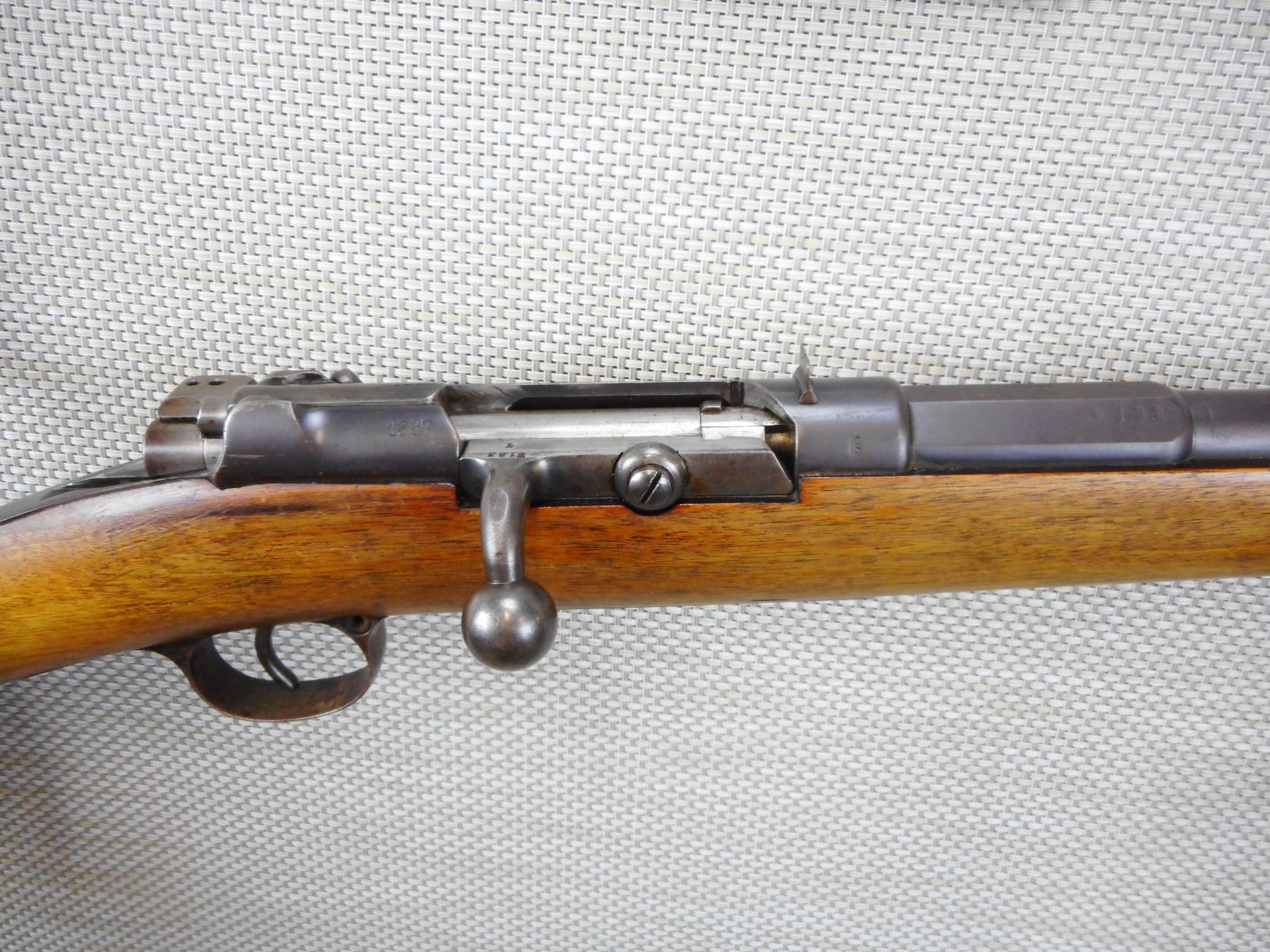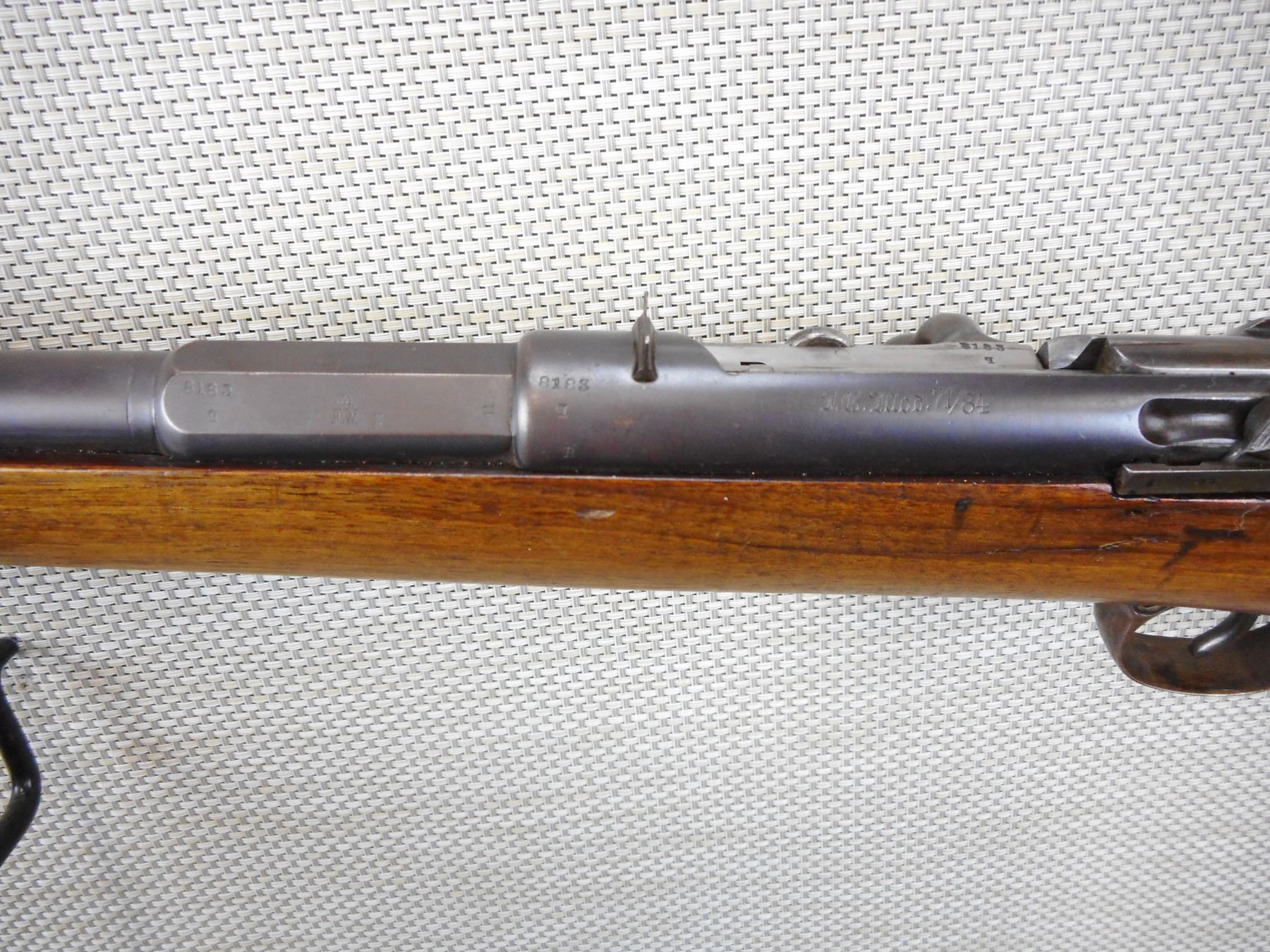 J.G. , MODEL: 71-84 SPORTER , CALIBER: 43 MAUSER , DATED 1887, SPORTERIZED MILITARY RIFLE , DANZIG, VERY GOOD BORE, MATCHING BOLT AND RECEIVER, SHOWS SOME HANDLING MARKS, STEEL BUTT PLATE , ACTION: BOLT ACTION RIFLE , BARREL LENGTH:20" , CONDITION: 5/10 , SERIAL # 8183 , CANADIAN CLASS NON RESTRICTED