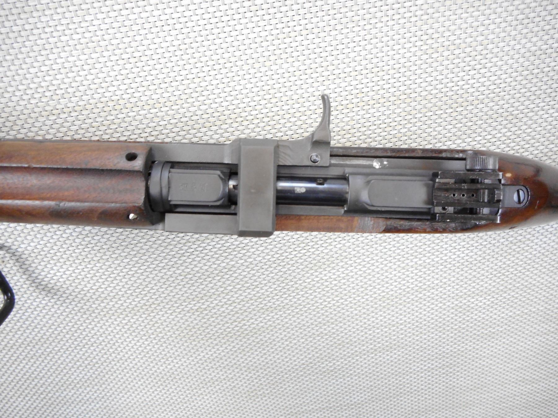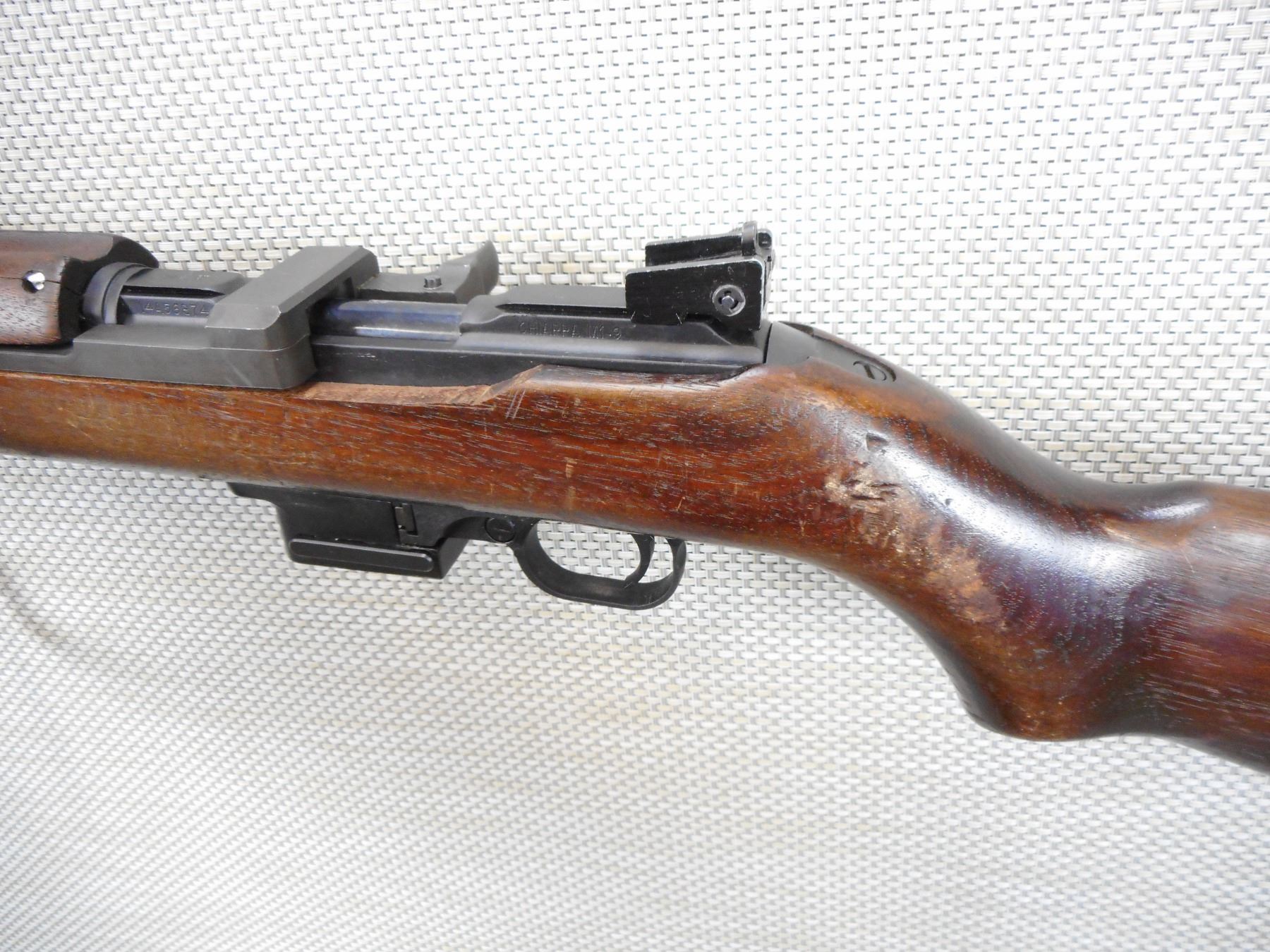 CHIAPPA , MODEL: M1-9 , CALIBER: 9MM LUGER , DOES NOT COME WITH A MAGAZINE, EXCELLENT BORE, BARLEY CORN FRONT AND PEEP APERTURE REAR SIGHT, SLING SWIVEL LOOPS, FOREND TOP WOOD IS CRACKED, STOCK SHOWS EXTENSIVE HANDLING MARKS, STEEL BUTT PLATE , ACTION: SEMI AUTOMATIC RIFLE , BARREL LENGTH:19" , CONDITION: 6/10 , SERIAL # 14A56874 , CANADIAN CLASS NON RESTRICTED