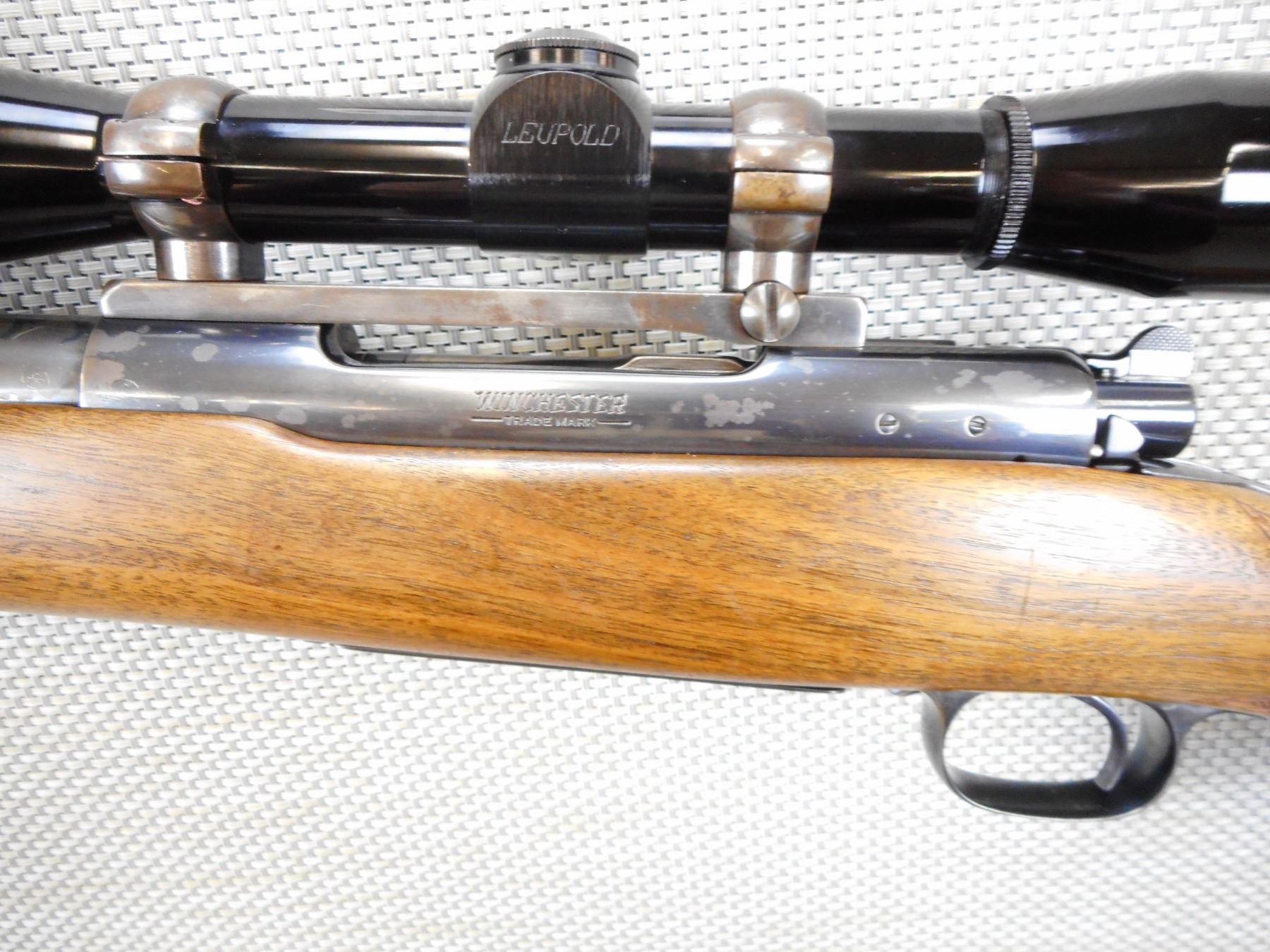 WINCHESTER , MODEL: 70 , CALIBER: 220 SWIFT , BORE IS EXCELLENT, HOODED FRONT AND NO REAR SIGHT, HAS A LEUPOLD 12X SCOPE, CHECKERED FOREND AND SEMI PISTOL GRIP BUTT STOCK WITH STEEL BUTT PLATE, SHOWS SOME HANDLING MARKS , ACTION: BOLT ACTION RIFLE , BARREL LENGTH:26" , CONDITION: 7/10 , SERIAL # 43568 , CANADIAN CLASS NON RESTRICTED