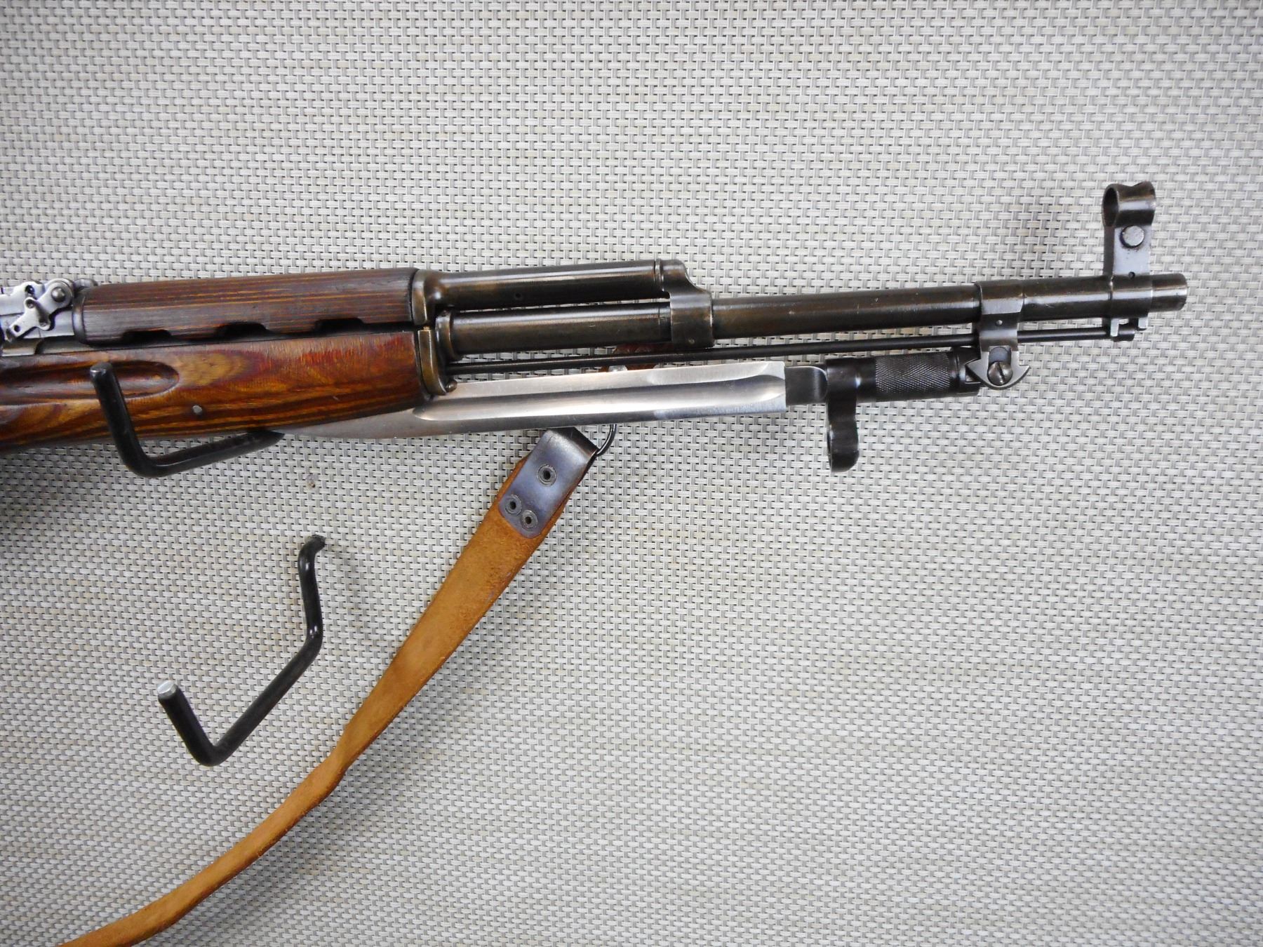 SIMINOV , MODEL: SKS , CALIBER: 7.62 X 39 , DATED 1955, FEATURES THE FOLIDING BAYONET, TULA ARSENAL, HOODED FRONT AND ADJUSTABLE REAR SIGHTS, VERY GOOD BORE, LAMINATED STOCK, SOME LIGHT RUST ON THE RECEIVER, BOLT AND RECEIVER MATCH BY SERIAL #, LEATHER SLING, SHOWS SOME HANDLING MARKS , ACTION: SEMI AUTOMATIC RIFLE , BARREL LENGTH:20 1/4" , CONDITION: 6/10 , SERIAL # PK6664 , CANADIAN CLASS NON RESTRICTED