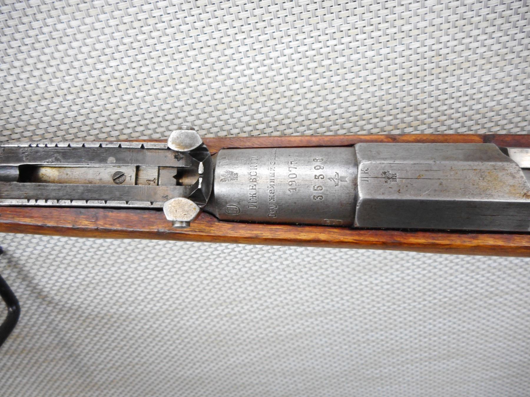 MOISIN NAGANT , MODEL: 1891 , CALIBER: 7.62 X 54R , DATED 1907, BOLT AND RECEIVER MATCH BY SERIAL #, IZHEVSK STATE ARSENAL, GOOD BORE, SHOWS SOME HANDLING MARKS, BLADE FRONT AND ADJUSTABLE REAR SIGHTS, HAS SLING LOOPS AND CLEANING ROD, STEEL BUTT PLATE , ACTION: BOLT ACTION RIFLE , BARREL LENGTH:32" , CONDITION: 6/10 , SERIAL # 35396 , CANADIAN CLASS NON RESTRICTED