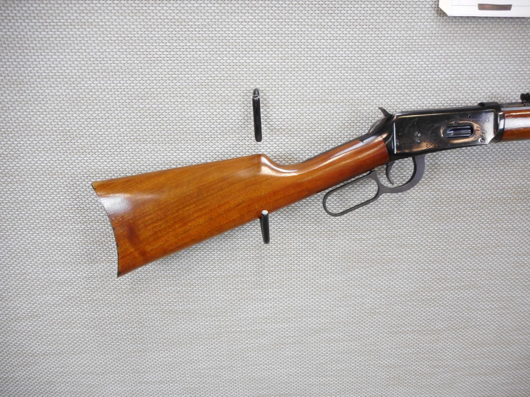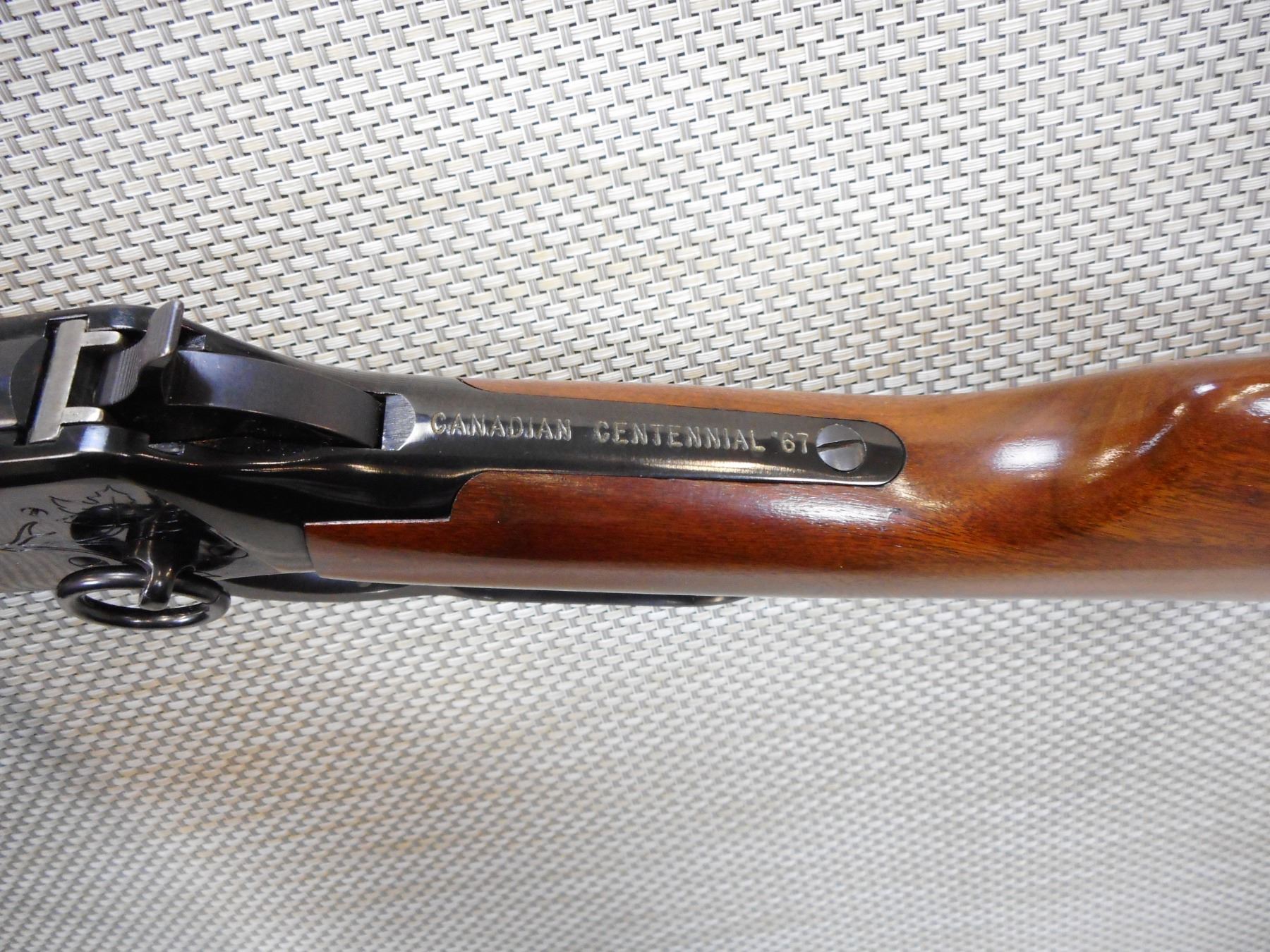 WINCHESTER , MODEL: 94 CANADIAN CENTENNIAL , CALIBER: 30-30 WIN , OCTAGONAL BARREL, EXCELLENT BORE, SADDLE RING, STEEL BUTT PLATE, SHOWS VERY LITTLE HANDLING MARKS , ACTION: LEVER ACTION RIFLE , BARREL LENGTH:20" , CONDITION: 8/10 , SERIAL # 2256 , CANADIAN CLASS NON RESTRICTED