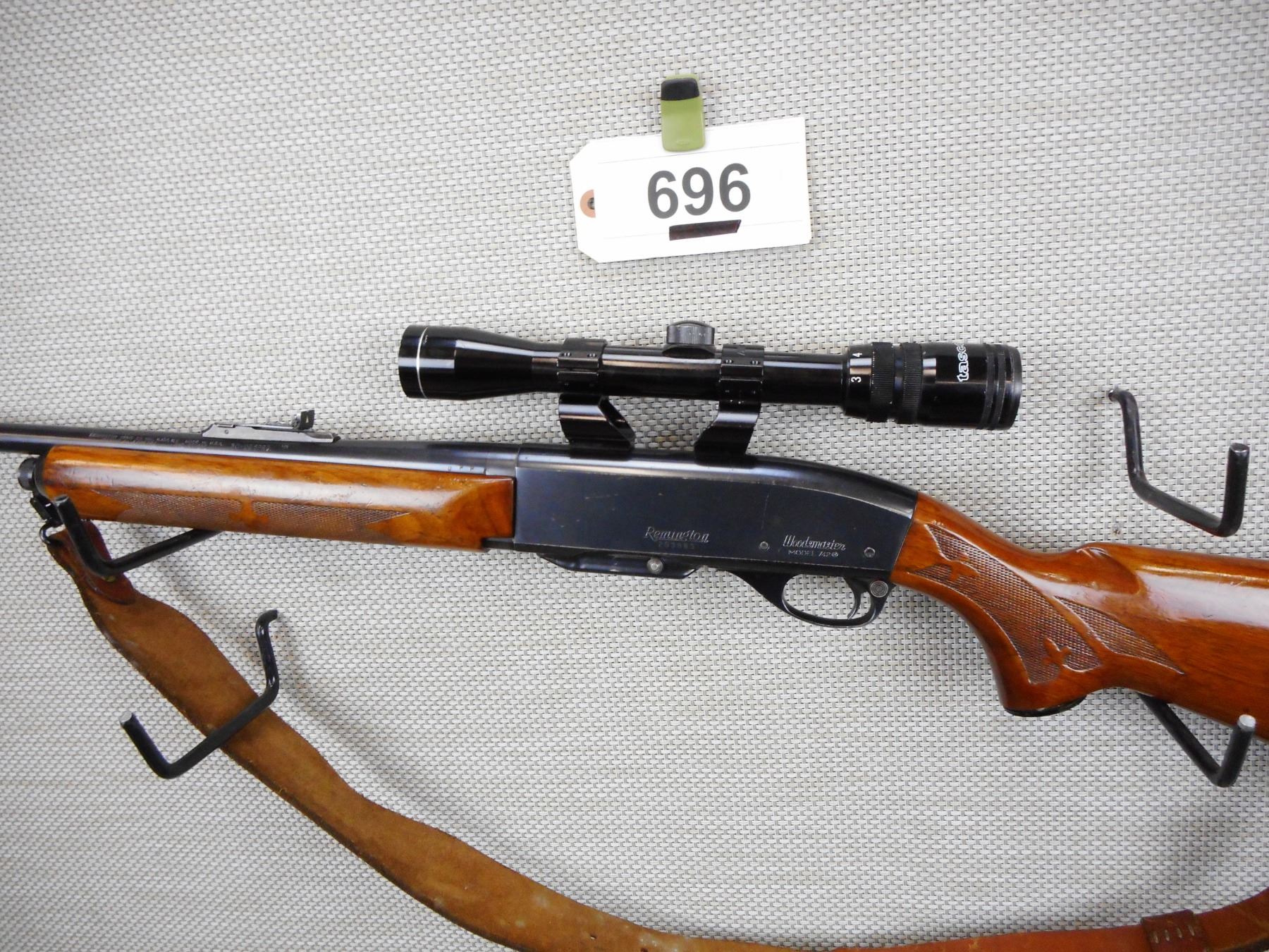 REMINGTON , MODEL: 742 WOODSMASTER , CALIBER: 30-06 SPRG , COMES WITH MAGAZINE, VERY GOOD BORE, RAISED FRONT AND ADJUSTABLE REAR SIGHT, HAS A TASCO 3 - 9 SCOPE, SLING SWIVELS WITH LEATHER SLING, CHECKERED FOREND AND CAPPED PISTOL GRIP BUTT STOCK WITH STEEL BUTT PLATE, SHOWS SOME HANDLING MARKS , ACTION: SEMI AUTOMATIC RIFLE , BARREL LENGTH:22" , CONDITION: 6/10 , SERIAL # 293883 , CANADIAN CLASS NON RESTRICTED
