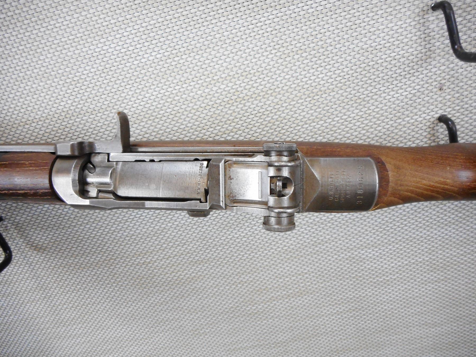 US RIFLE , MODEL: M1 GARAND , CALIBER: 30-06 SPRG , MADE BY SPRINGFIELD, EXCELLENT BORE, BARLEY CORN FRONT AND PEEP REAR SIGHTS, RETAINS FULL MILITARY CONFIGURATION, SLING SWIVEL LOOPS, STEEL BUTT PLATE , ACTION: SEMI AUTOMATIC RIFLE , BARREL LENGTH:24" , CONDITION: 8/10 , SERIAL # 3180625 , CANADIAN CLASS NON RESTRICTED