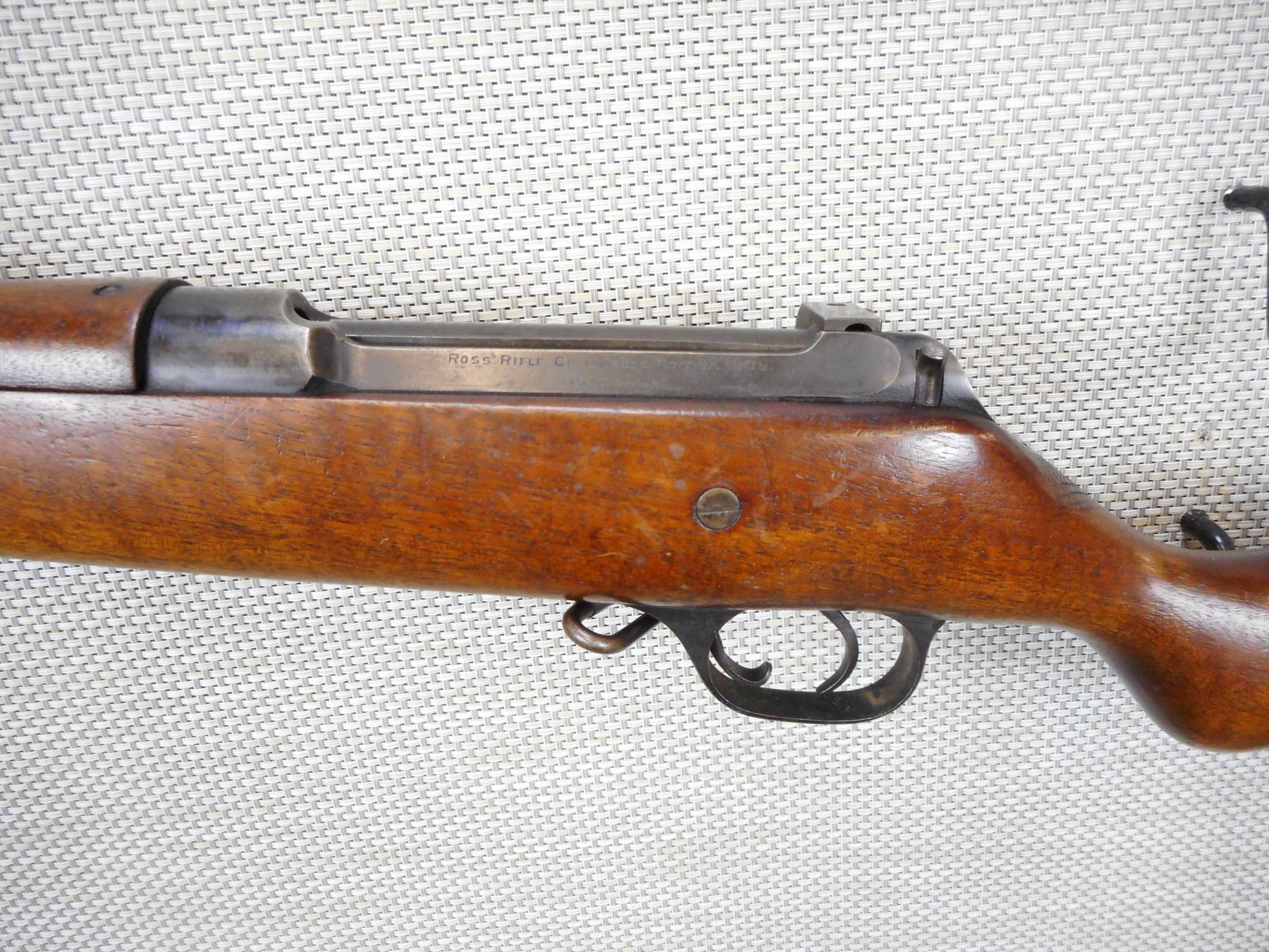 ROSS RIFLE CO , MODEL: 1905 SPORTER , CALIBER: 303BR , BORE IS DARK, RAISED FRONT AND ADJUSTABLE REAR SIGHTS, STEEL BUTT PLATE SHOWS SOME HANDLING MARKS, SLING SWIVEL LOOPS , ACTION: BOLT ACTION RIFLE , BARREL LENGTH:28" , CONDITION: 6/10 , SERIAL # N/A , CANADIAN CLASS NON RESTRICTED