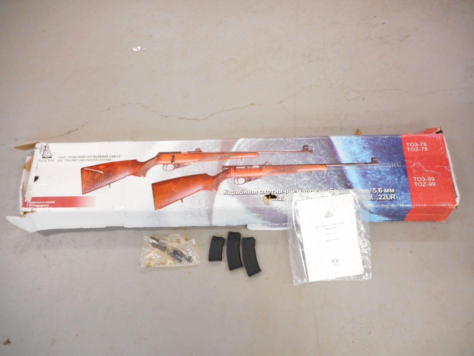 TOZ , MODEL: 99 CARBINE , CALIBER: 22 LR , COMES WITH BOX, 4 MAGAZINES, ACCESSORIES AND MANUAL, EXCELLENT BORE, CAPPED THREADED MUZZLE, HOODED FRONT AND FLIP ADJUSTABLE REAR SIGHTS, CHECKERED FOREND WITH SEMI PISTOL GRIP BUTT STOCK, SLING SWIVELS, PLASTIC BUTT PLATE , ACTION: SEMI AUTOMATIC RIFLE , BARREL LENGTH:20" , CONDITION: 9+/10 , SERIAL # 1000187 , CANADIAN CLASS NON RESTRICTED