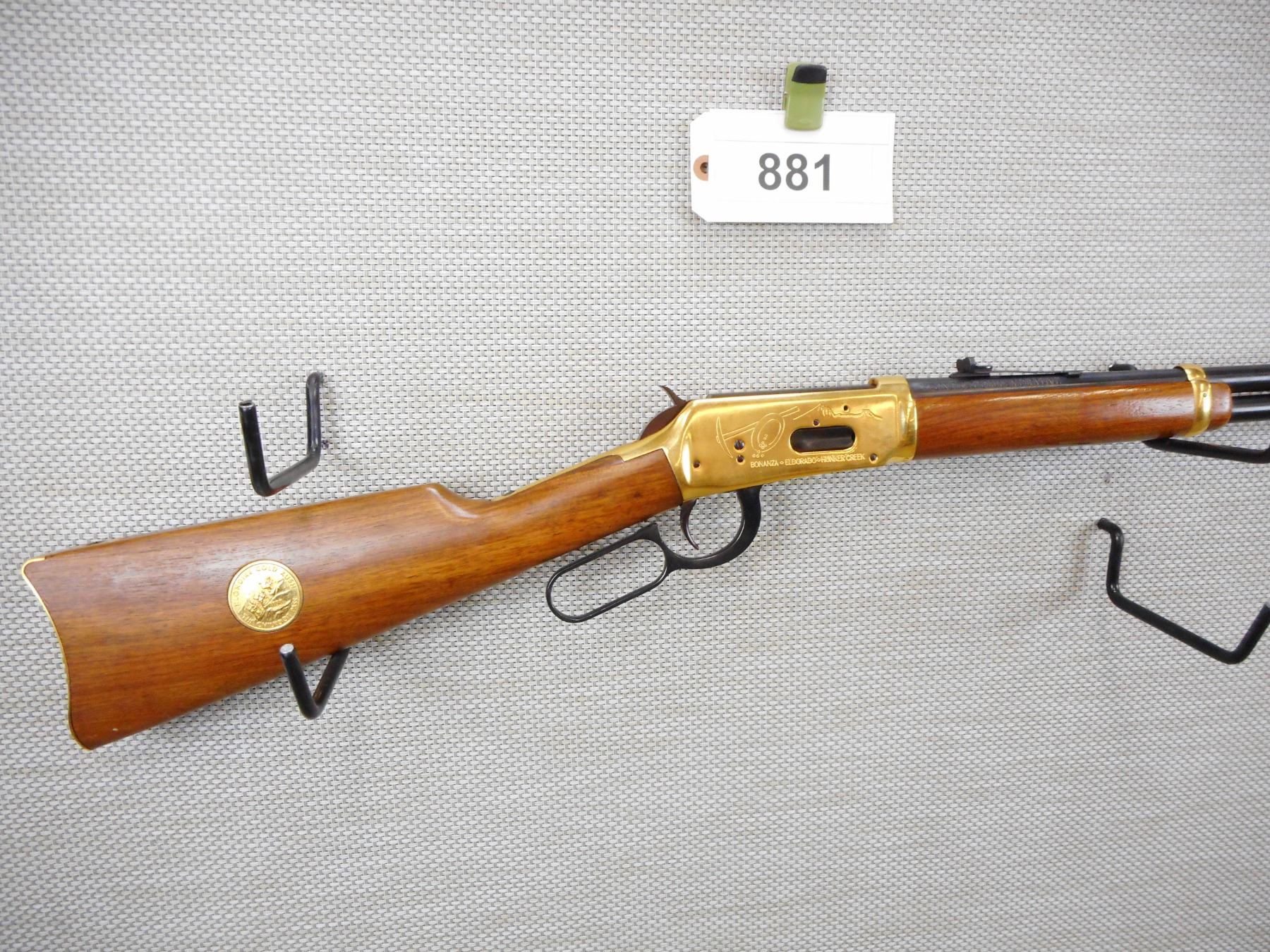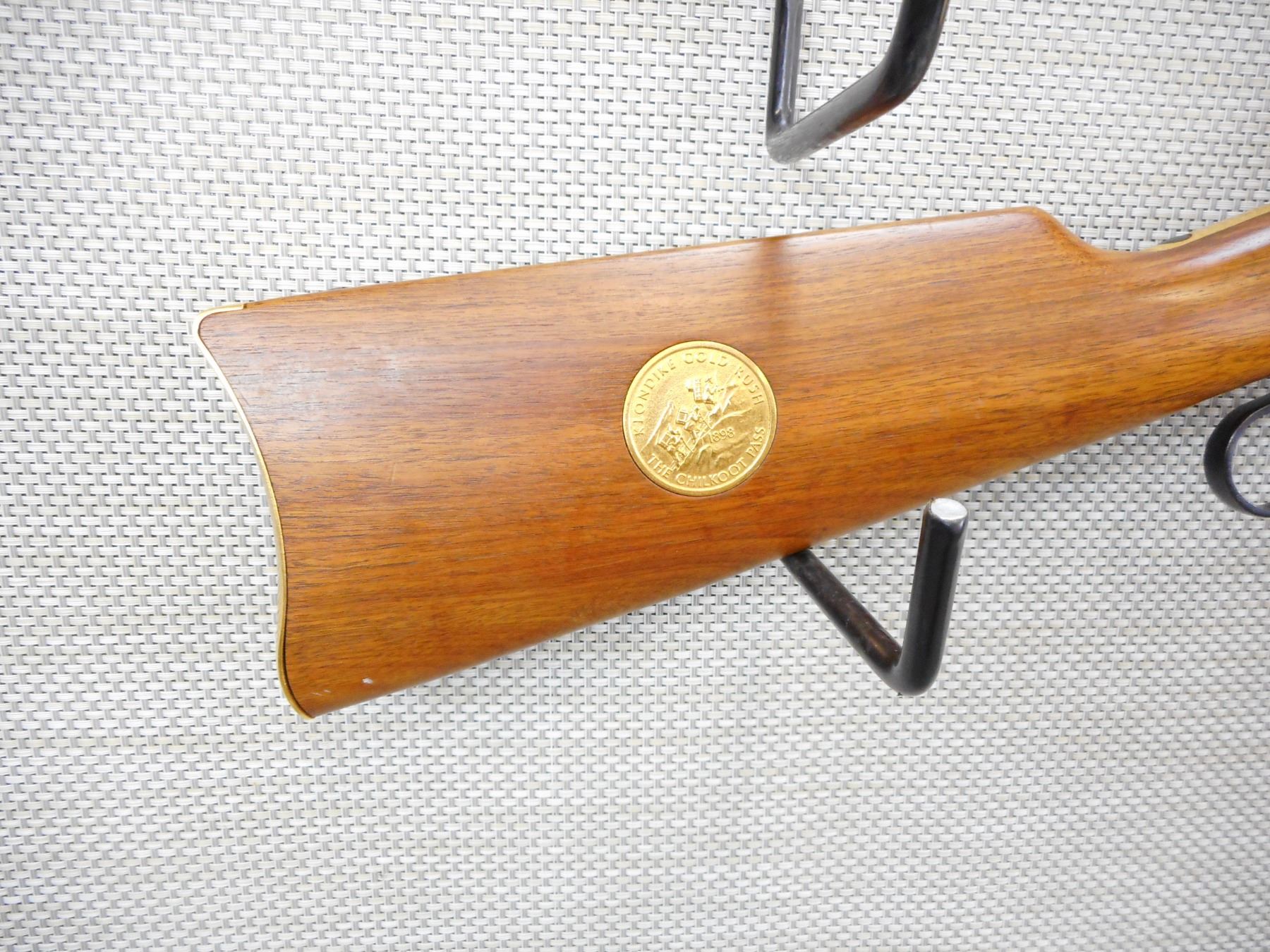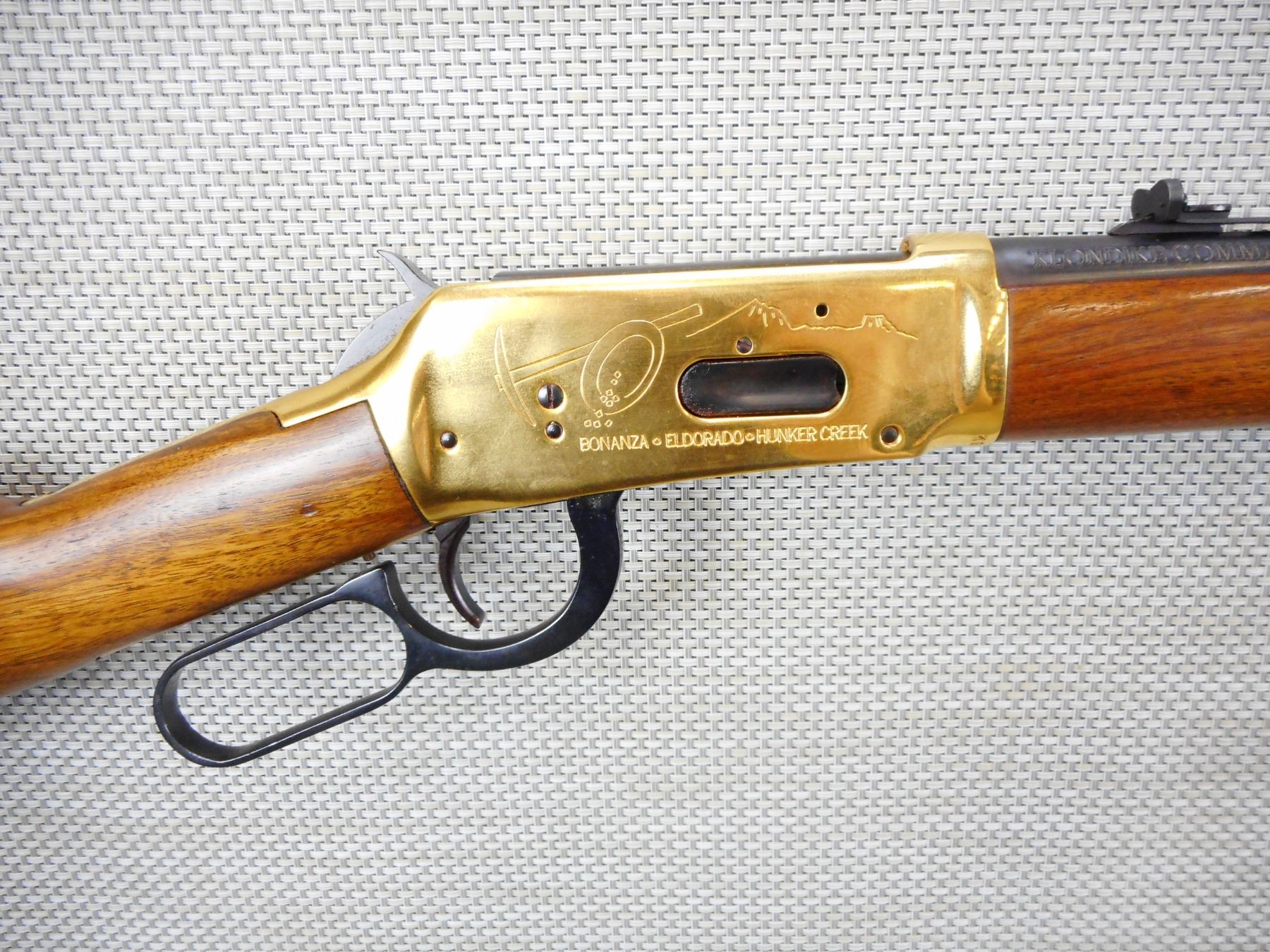 WINCHESTER , MODEL: 1894 GREAT GOLD STRUCK OF 1896 COMMEMORATIVE , CALIBER: 30-30 WIN , BORE IS EXCELLENT, HOODED FRONT SIGHT, ADJSUTABLE REAR SIGHT, BRASS FURNITURE AND BUTT PLATE, INLAYED KLONDIKE GOLD RUSH DISK IN STOCK, SHOWS VERY LITTLE HANDLING MARKS , ACTION: , BARREL LENGTH:20" , CONDITION: 8/10 , SERIAL # KGR2610 , CANADIAN CLASS NON RESTRICTED