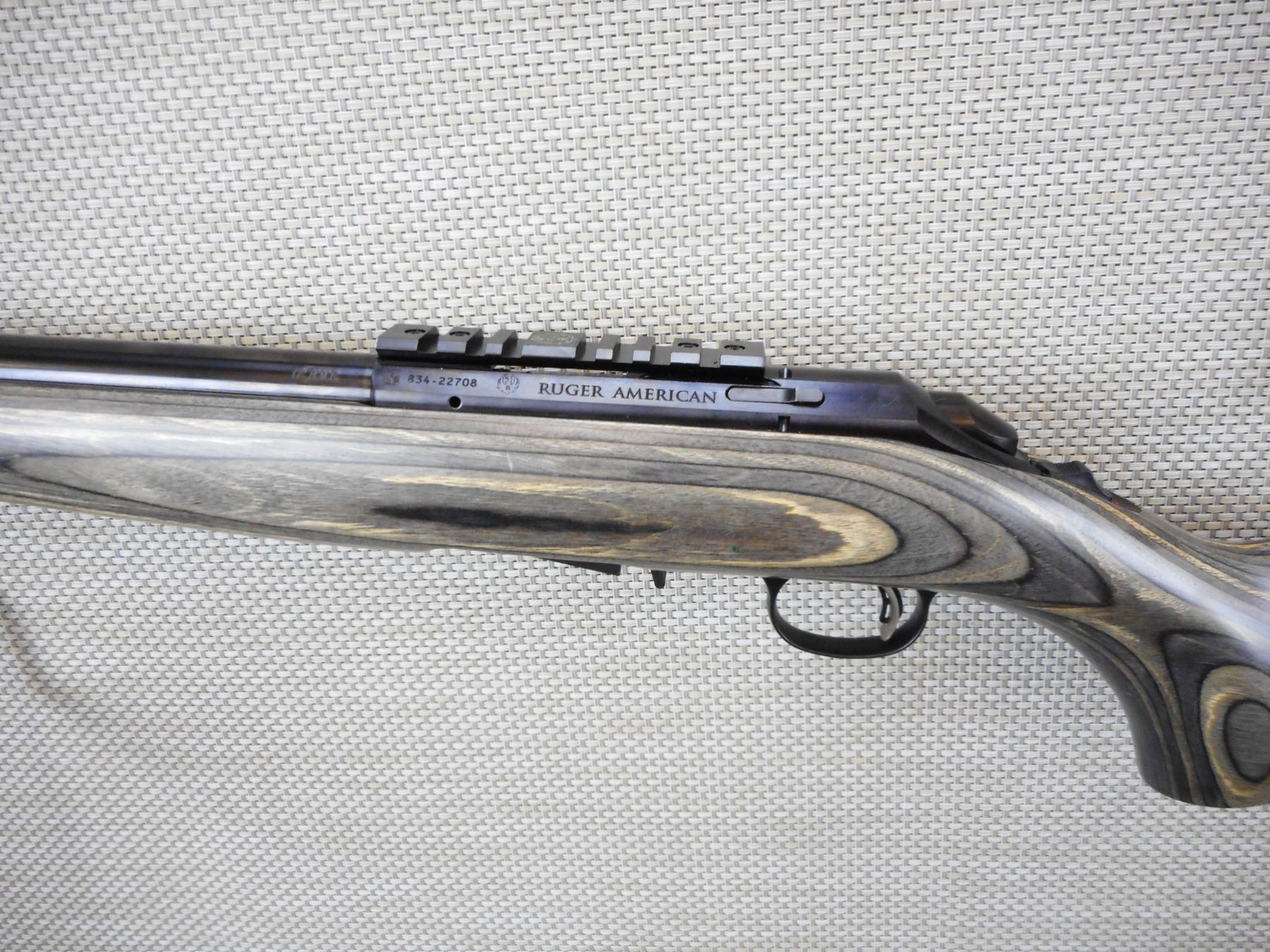 RUGER , MODEL: AMERICAN, CALIBER: 17 HMR , COMES WITH 2 MAGAZINES AND MANUAL, NO SIGHTS, CAPPED THREADED MUZZLE, GREY LAMINATED STOCK WITH SLING SWIVEL LOOPS, VENTED RUBBER RECOIL PAD, SHOWS VERY LITTLE HANDLING MARKS, EXCELLENT BORE, HAS A SCOPE RAIL , ACTION: BOLT ACTION RIFLE , BARREL LENGTH:18" , CONDITION: 9/10 , SERIAL # 83422708 , CANADIAN CLASS NON RESTRICTED
