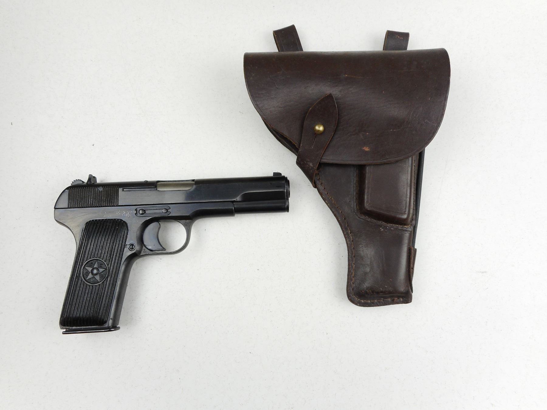 TOKAREV , MODEL: TT33 , CALIBER: 7.62MM TOKAREV , COMES WITH MAGAZINE AND HOLSTER WITH CLEANING TOOL, DATED 1947, SLIDE AND BARREL MATCH BY SERIAL #, VERY GOOD BORE, BLADE FRONT AND FIXED REAR SIGHT, PLASTIC GRIPS MARKED CCCP, SHOWS SOME HANDLING MARKS , ACTION: SEMI-AUTOMATIC , BARREL LENGTH: 115MM , CONDITION: 7/10 , STOCK # R2889 , SERIAL # 444 , CLASS: CANADIAN RESTRICTED CLASS