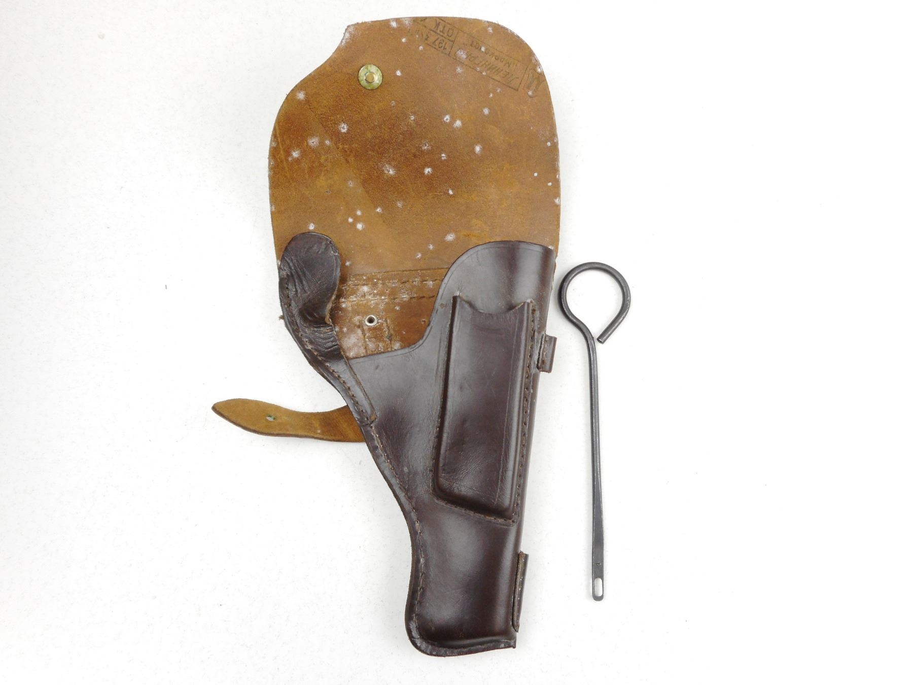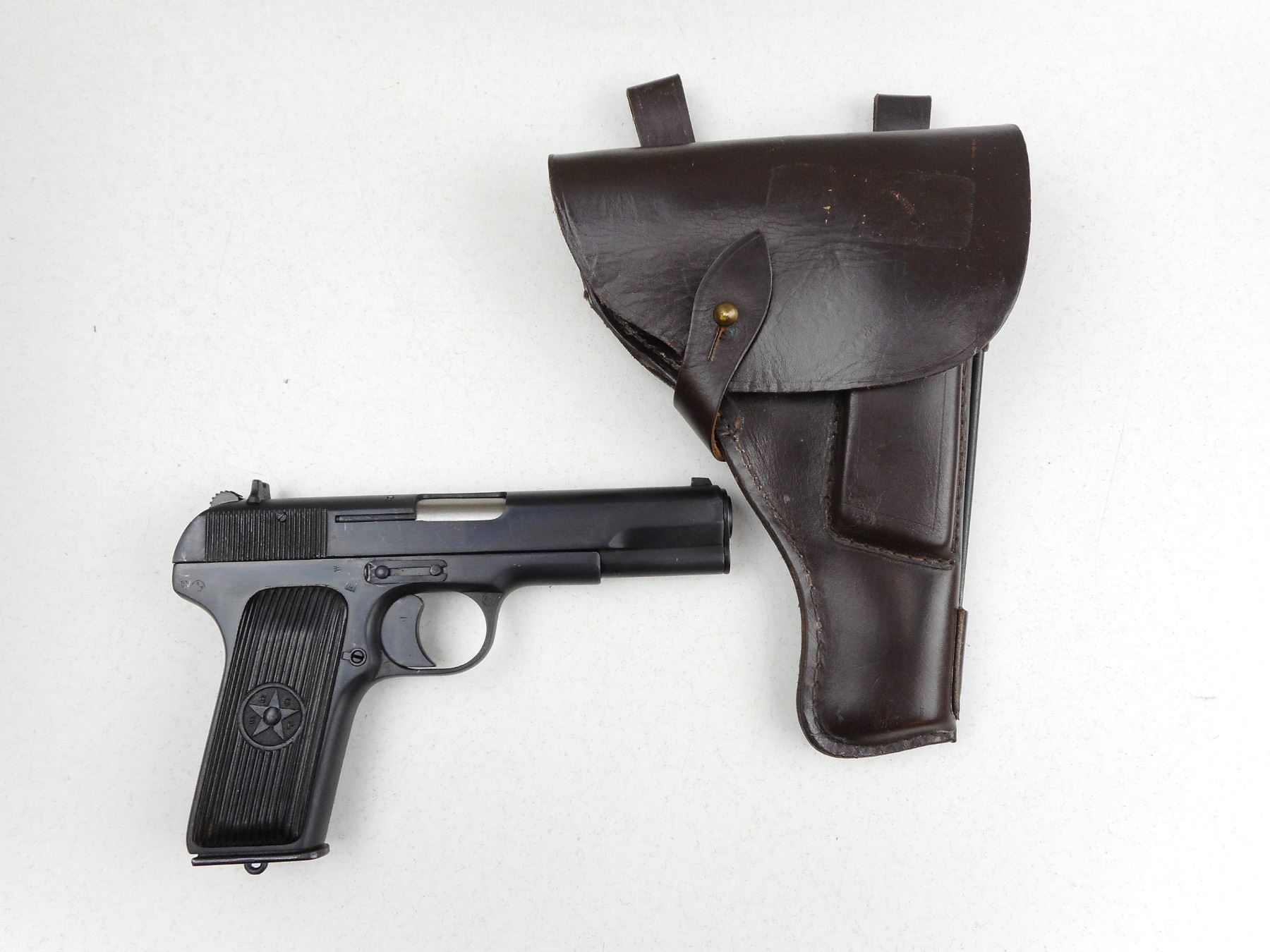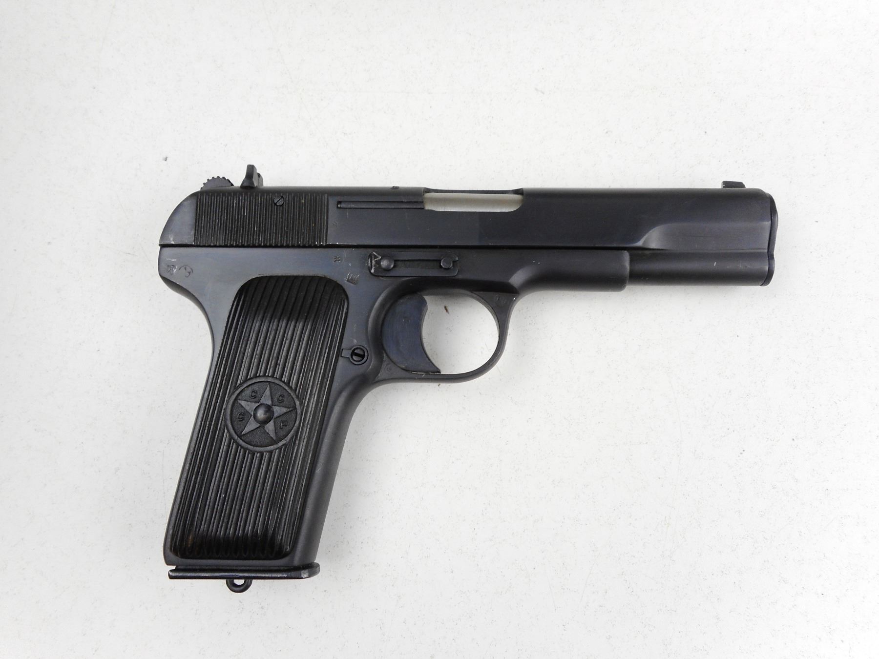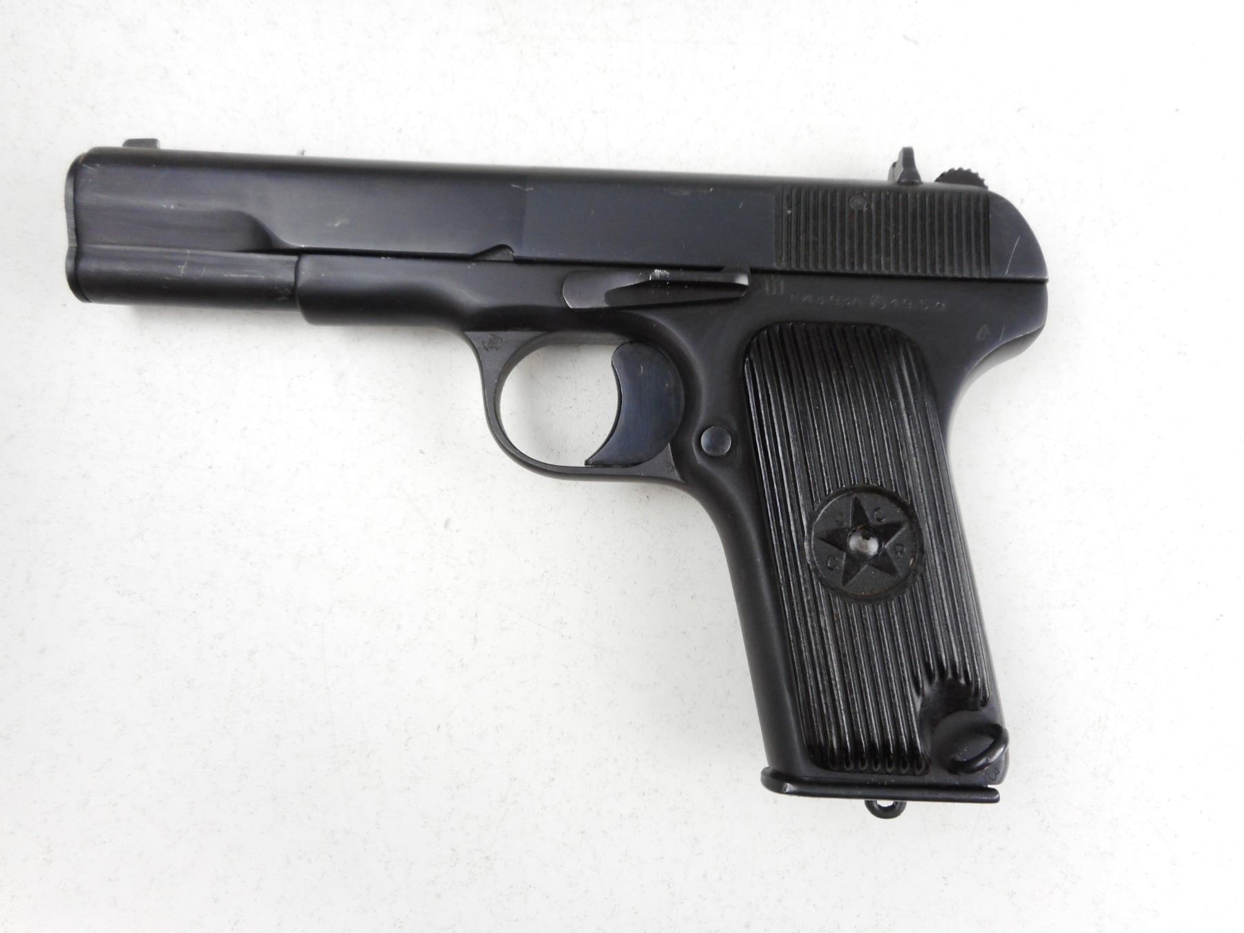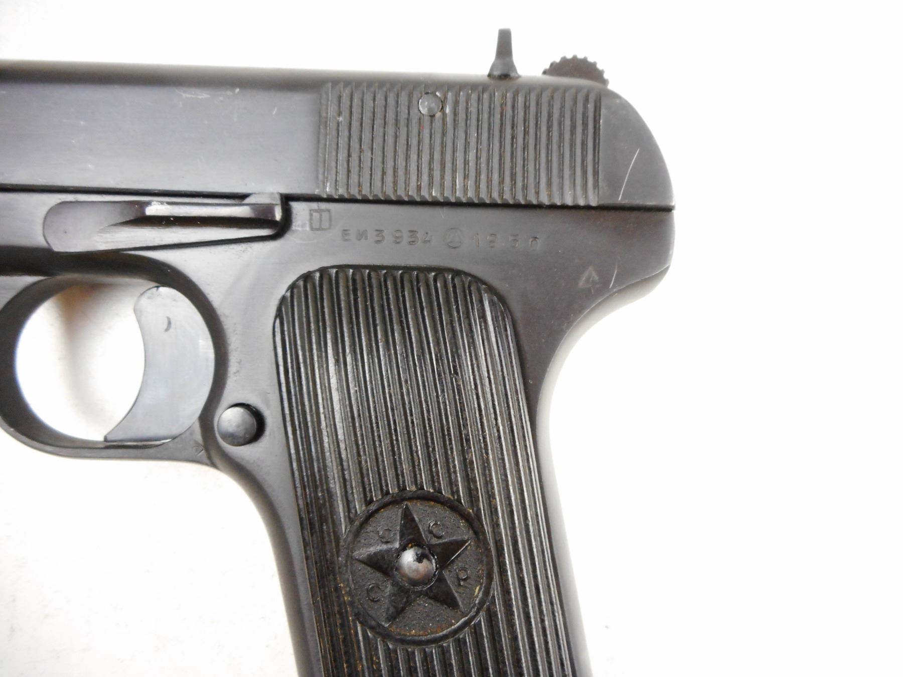 TOKAREV , MODEL: TT33 , CALIBER: 7.62MM TOKAREV , COMES WITH MAGAZINE AND HOLSTER WITH CLEANING TOOL, DATED 1950, RUSSIAN STATE ARSENAL IZHEVSK, VERY GOOD BORE, BLADE FRONT AND FIXED REAR SIGHTS, PLASTIC GRIPS MARKED CCCP, MATCHING SLIDE AND RECEIVER BY SERIAL #, MAGAZINE DOES NOT MATCH BY SERIAL #, SHOWS SOME HANDLING MARKS , ACTION: SEMI-AUTOMATIC , BARREL LENGTH: 115MM , CONDITION: 7/10 , STOCK # R2893 , SERIAL # EZ3934 , CLASS: CANADIAN RESTRICTED CLASS