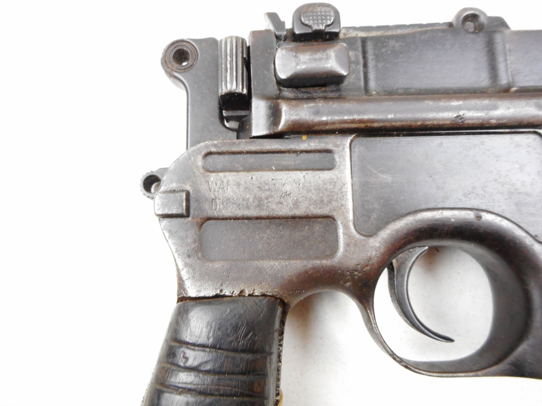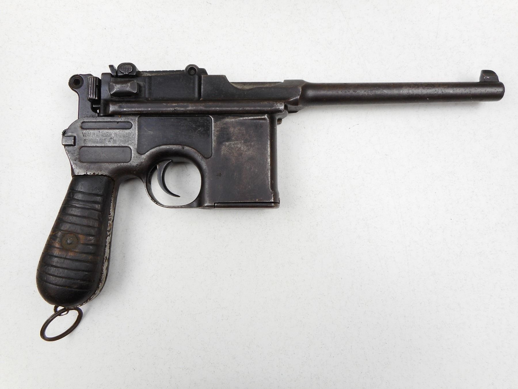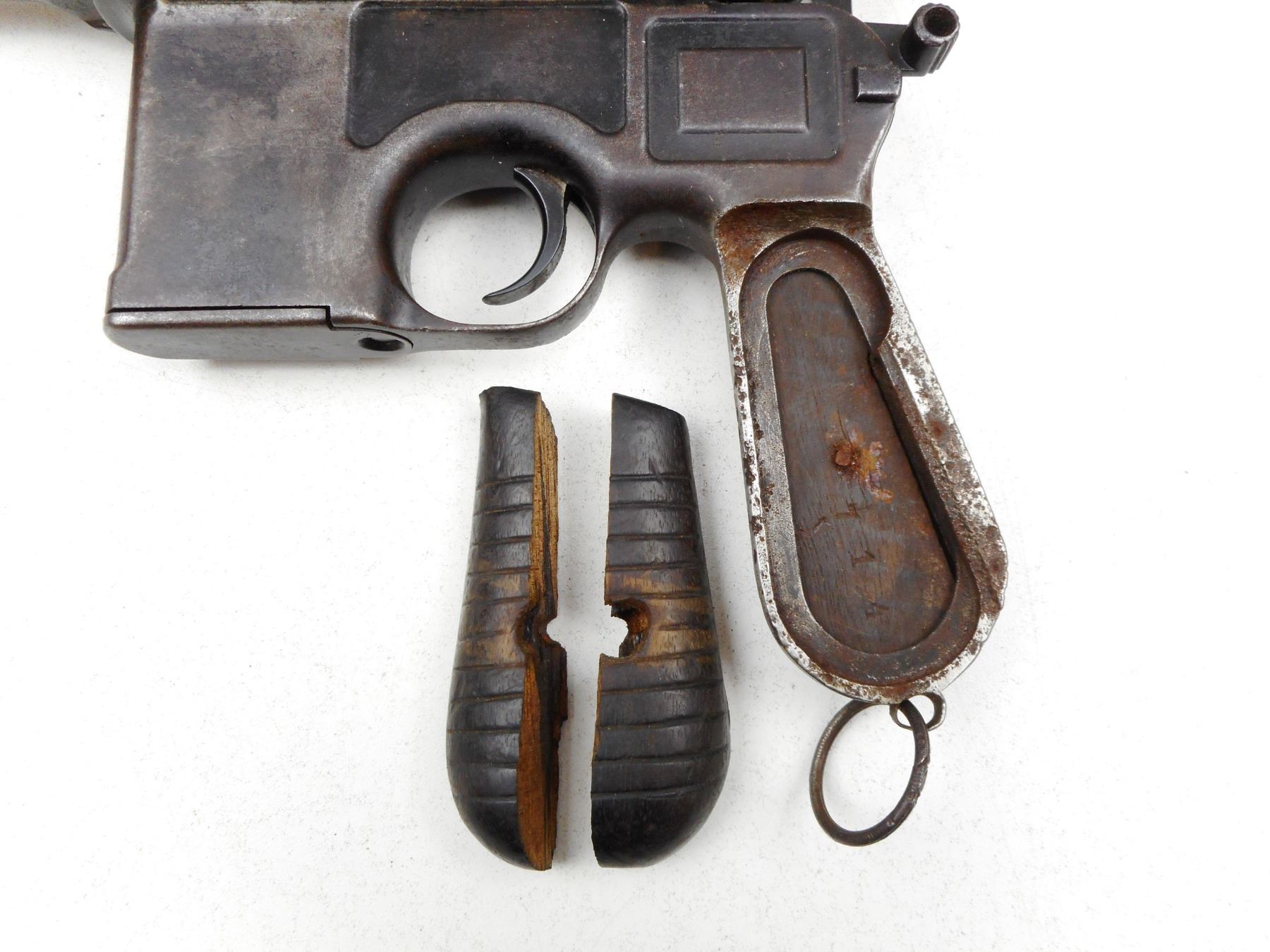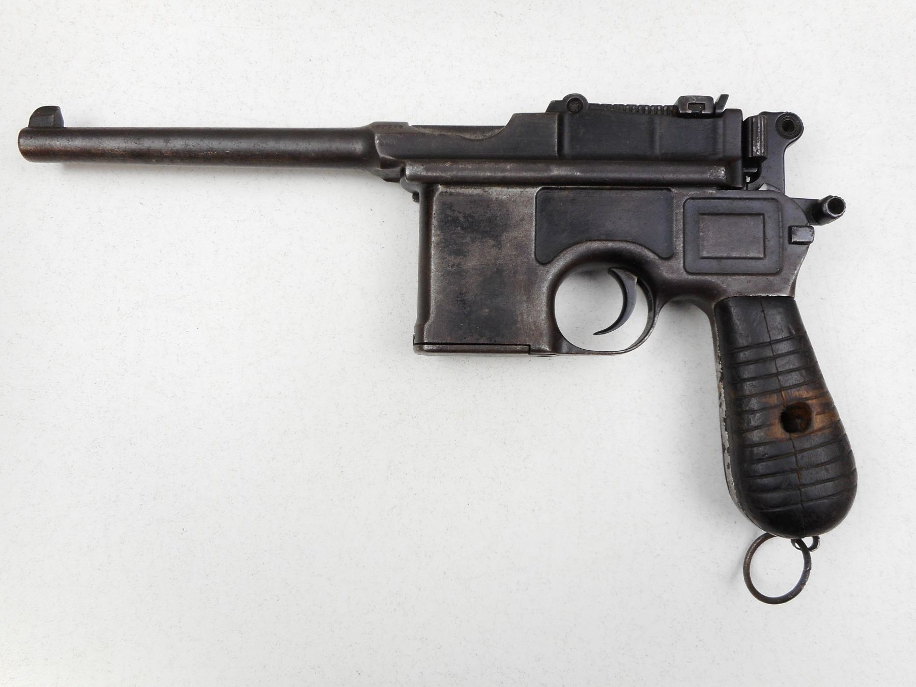 PRE WWI ERA, MAUSER , MODEL: C96 STANDARD BROOMHANDLE , CALIBER: 7.63MM MAUSER , BROKEN GRIP, MISSING THE GRIP RETAINING SCREW, BLADE FRONT AND ADJUSTABLE REAR SIGHTS, ALL COMPONENTS APPEAR TO MATCH, RETAINS 5% OF ORIGINAL BLUE, COMPLETE WITH THE LANYARD RING, SMALL RING HAMMER, WELL WORN BORE WITH CORROSSION , ACTION: SEMI-AUTOMATIC HANDGUN , BARREL LENGTH: 140MM , CONDITION: 3/10 , STOCK # R2897 , SERIAL # 67714 , CLASS: CANADIAN RESTRICTED CLASS