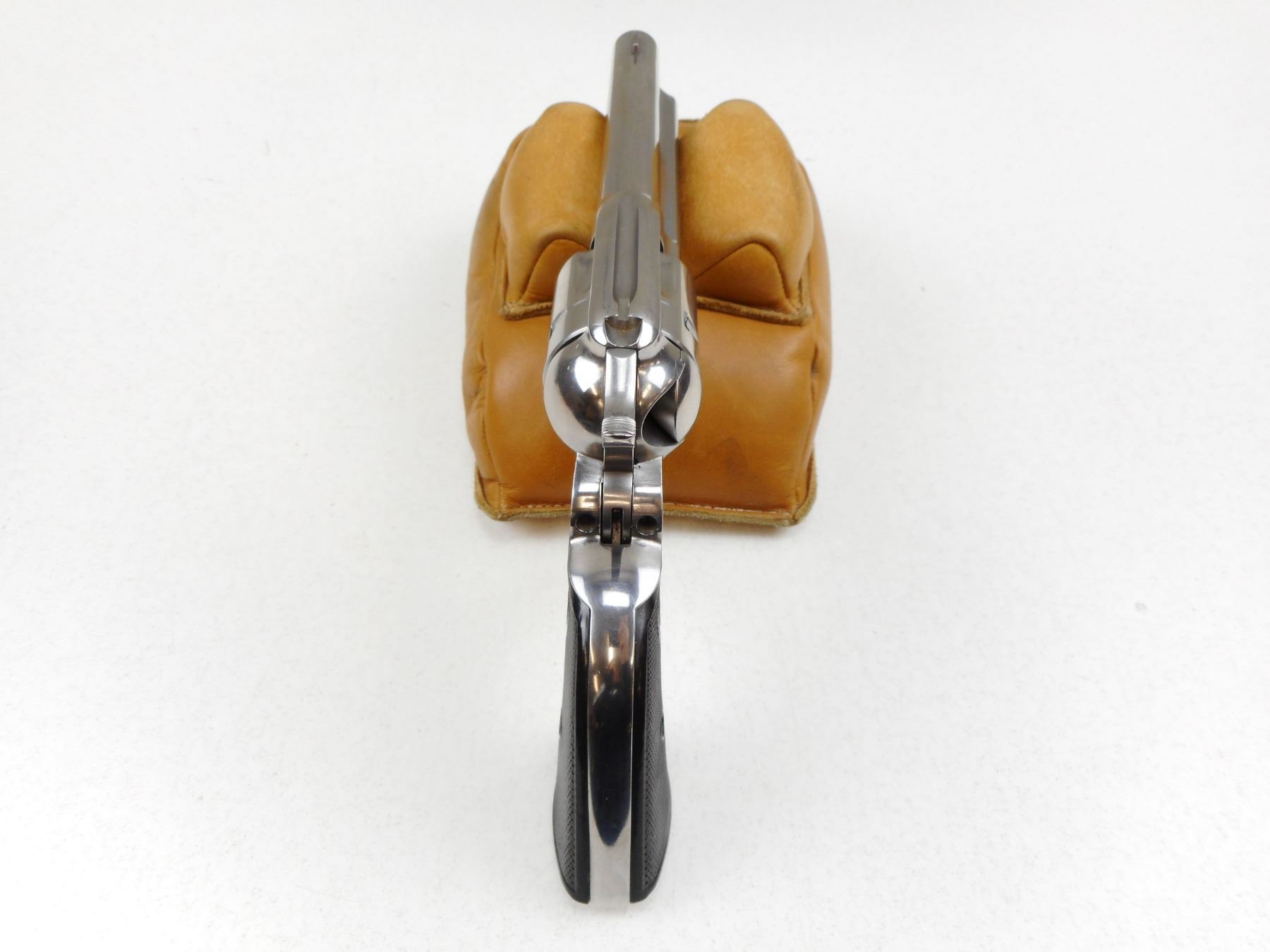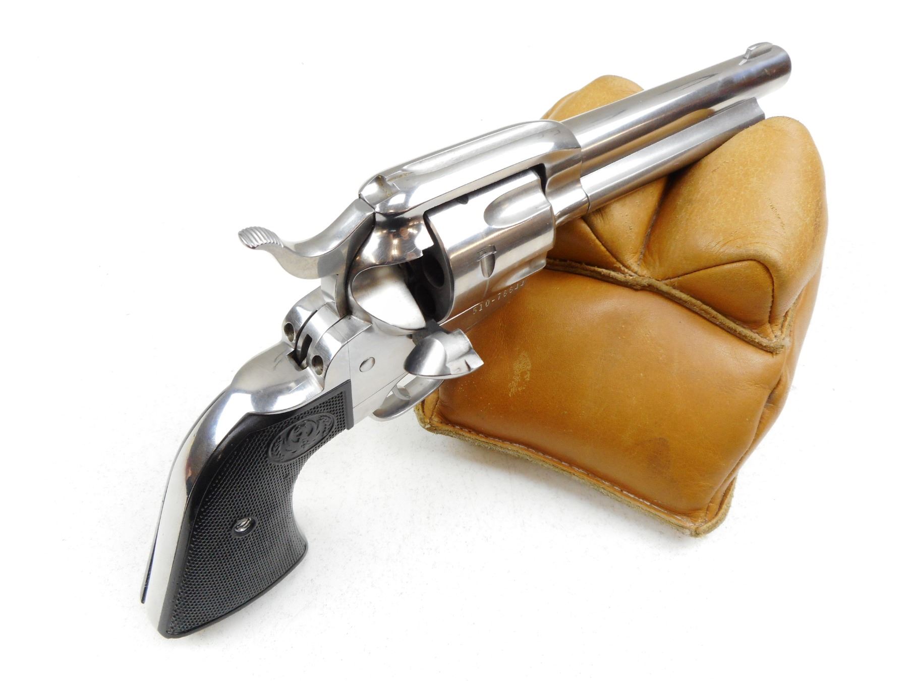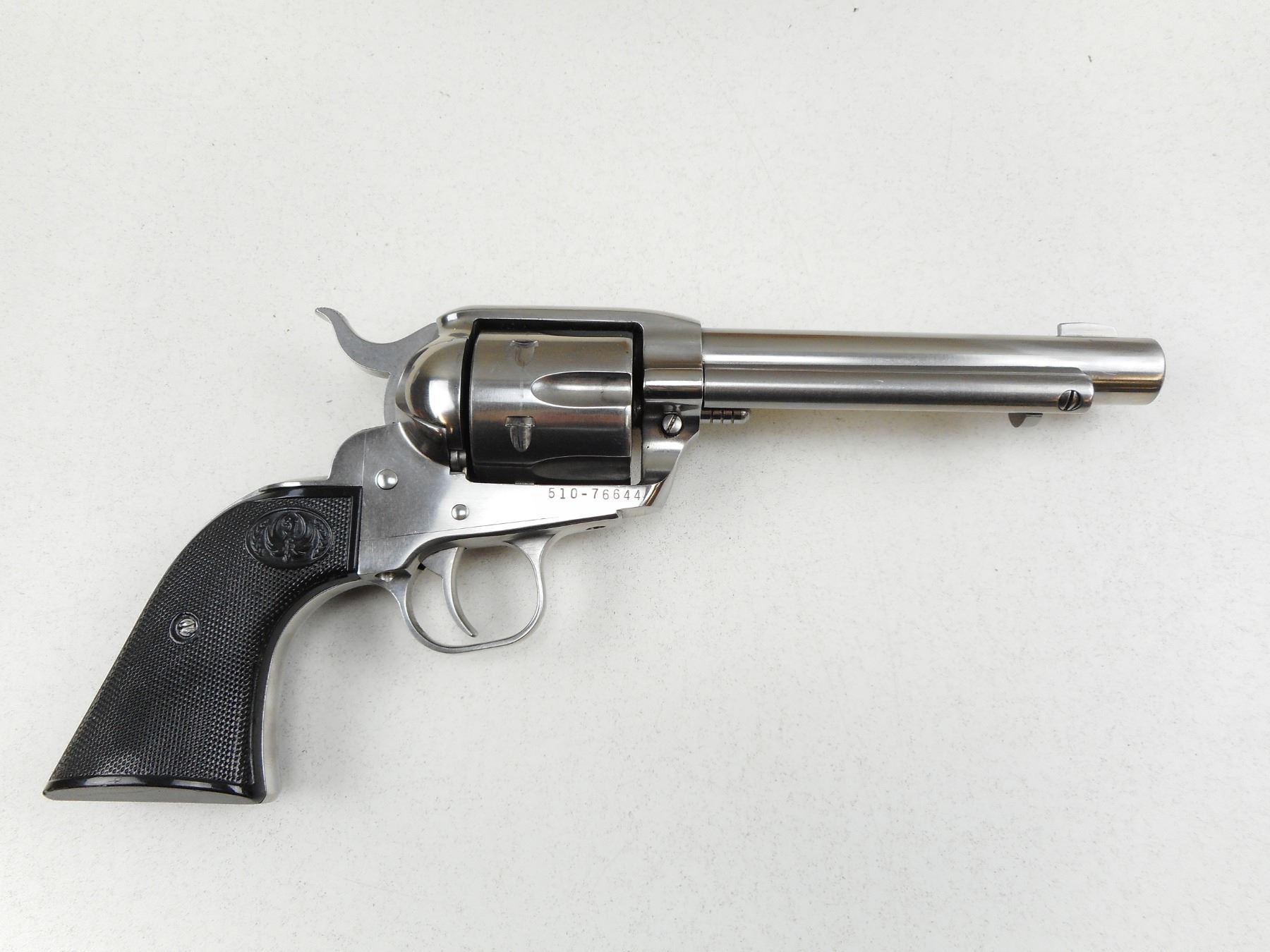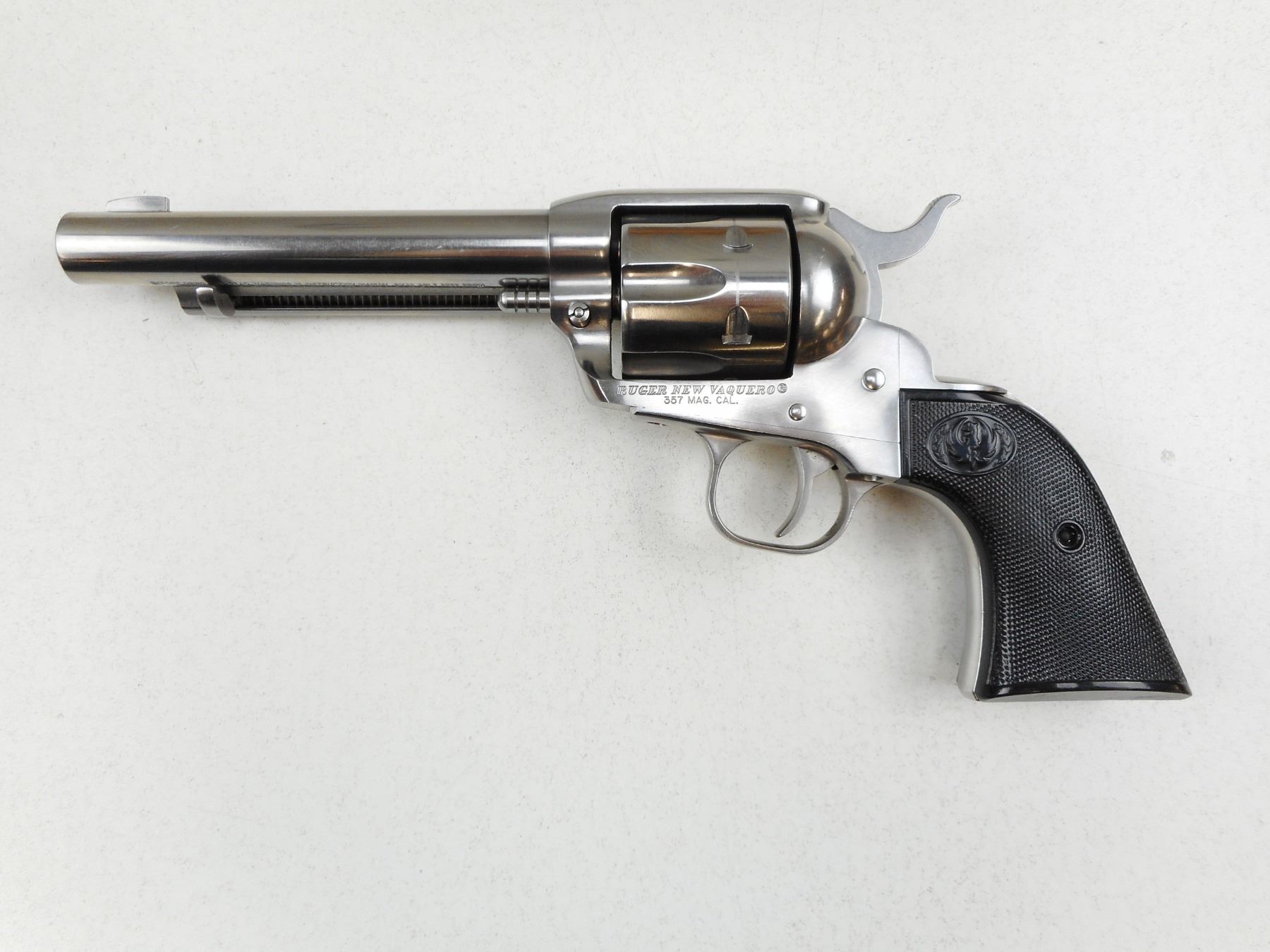 RUGER , MODEL: NEW VAQUERO , CALIBER: 357 MAG , BLADE FRONT AND NOTCH REAR SIGHT, BLACK CHECKERED PLASTIC GRIPS, STAINLESS STEEL CONSTRUCTION, SHOWS VERY LITTLE HANDLING MARKS, VERY GOOD BORE , ACTION: REVOLVER , BARREL LENGTH: 140MM , CONDITION: 8/10 , STOCK # R2917 , SERIAL # 51076644 , CLASS: CANADIAN RESTRICTED CLASS