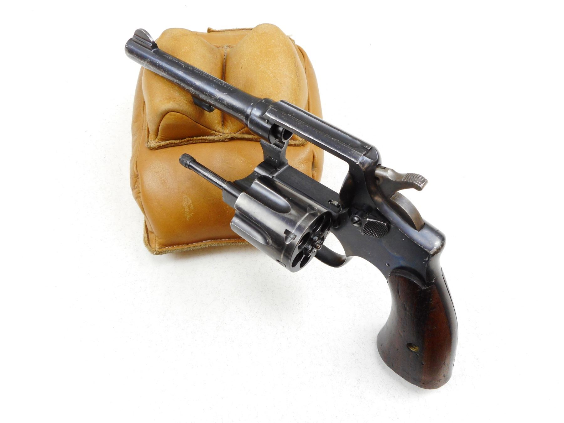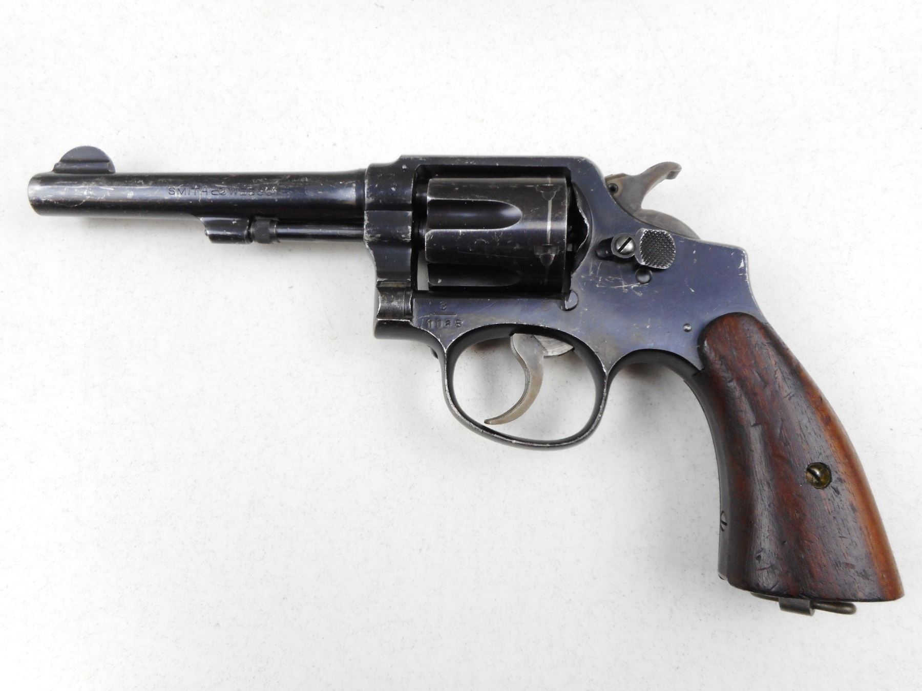SMITH & WESSON , MODEL: HAND EJECTOR 38 MILITARY & POLICE MOD. 3 OF 1905 CHANGE 4 , CALIBER: 38 S&W , BLADE FRONT AND NOTCH REAR SIGHTS, PLAIN HARDWOOD GRIPS, LANYARD LOOP, SHOWS EXTENSIVE HANDLING MARKS, VERY GOOD BORE, ACTION IS TIGHT , ACTION: REVOLVER , BARREL LENGTH: 127MM , CONDITION: 6/10 , STOCK # R2921 , SERIAL # 835298 , CLASS: CANADIAN RESTRICTED CLASS