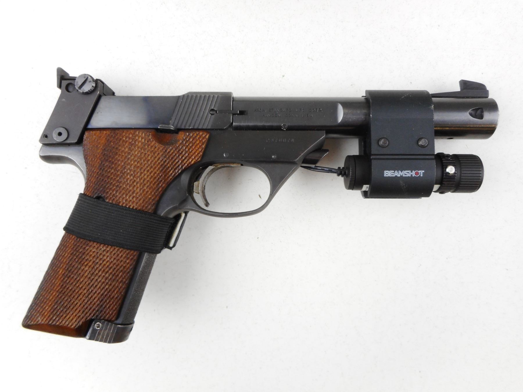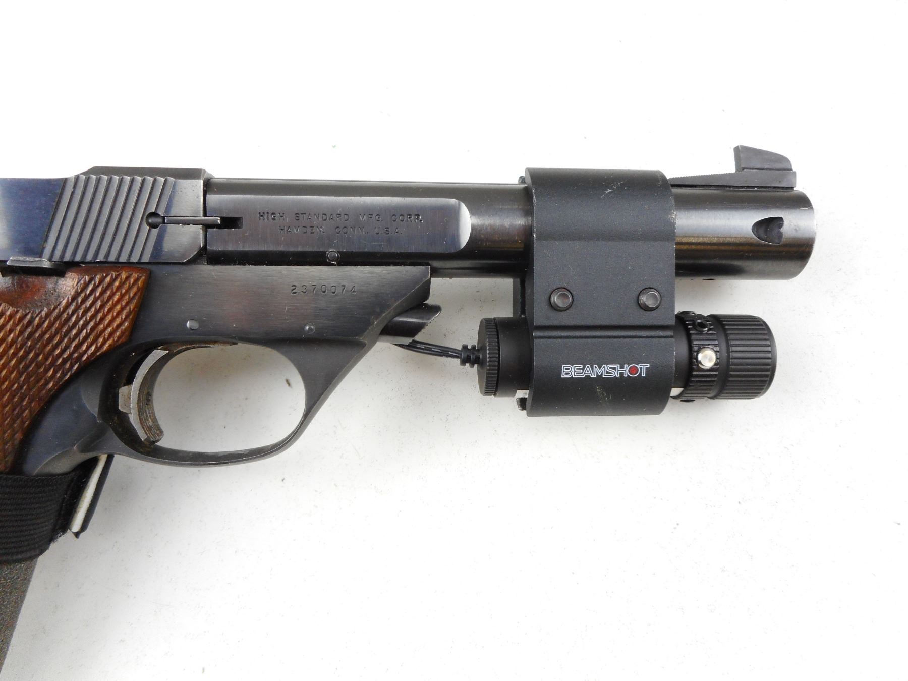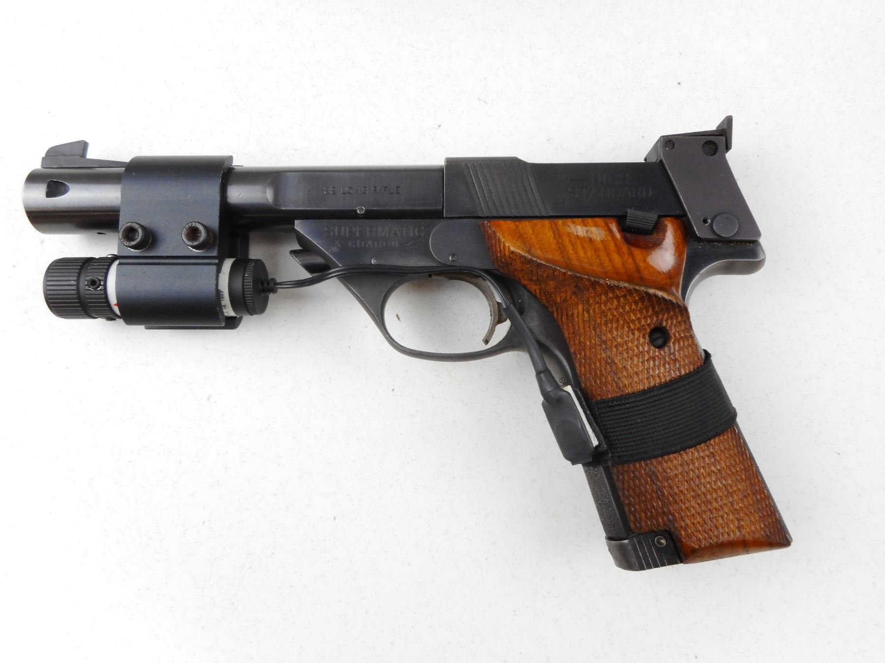 HIGH STANDARD , MODEL: SUPERMATIC CITATION , CALIBER: 22 LR , COMES WITH 2 MAGAZINES, SECOND BARREL 184MM WITH EXCELLENT BORE, OPERATIONAL LASER SIGHT MOUNTED ON GUN, BLADE FRONT AND ADJUSTABLE REAR SIGHT, EXCELLENT BORE ON MOUNTED BARREL, SHOWS VERY LITTLE HANDLING MARKS, CHECKERED WOOD GRIP PANELS, STIPPLED FRONT AND REAR GRIP STRAPS , ACTION: SEMI-AUTOMATIC HANDGUN , BARREL LENGTH: 140MM ATTACHED/ 184MM INCLUDED , CONDITION: 8/10 , STOCK # R2943 , SERIAL # 2370074 , CLASS: CANADIAN RESTRICTED CLASS