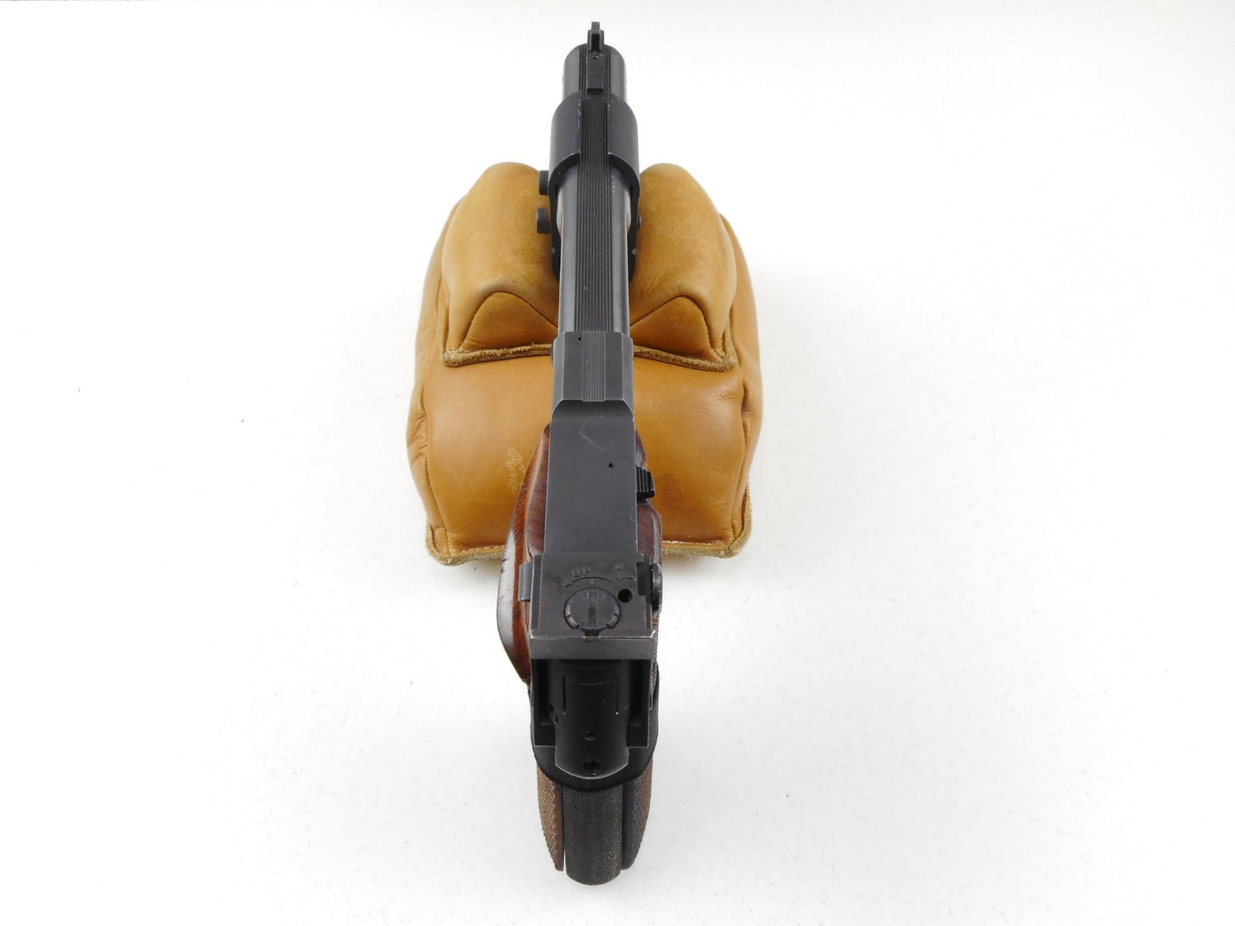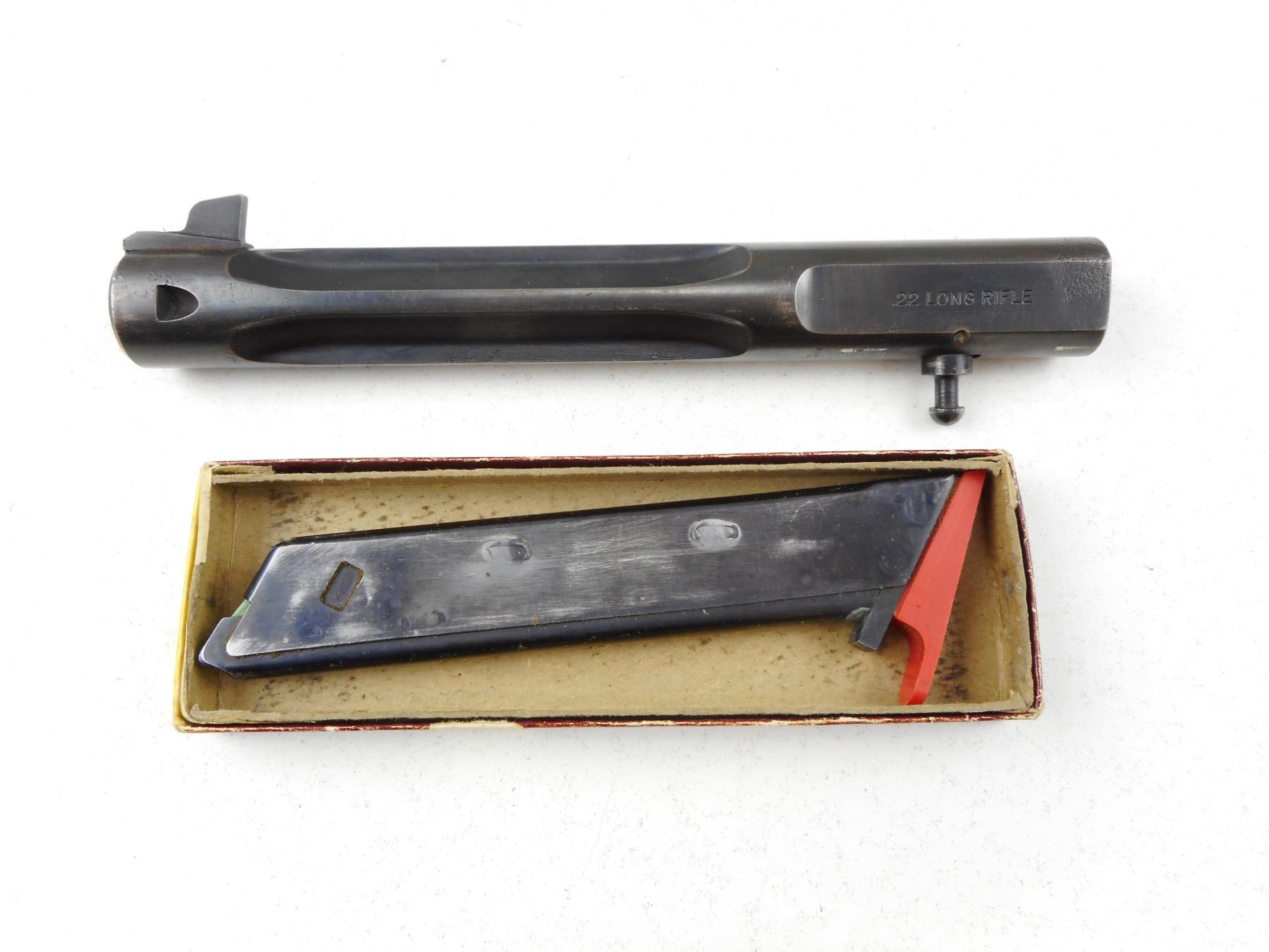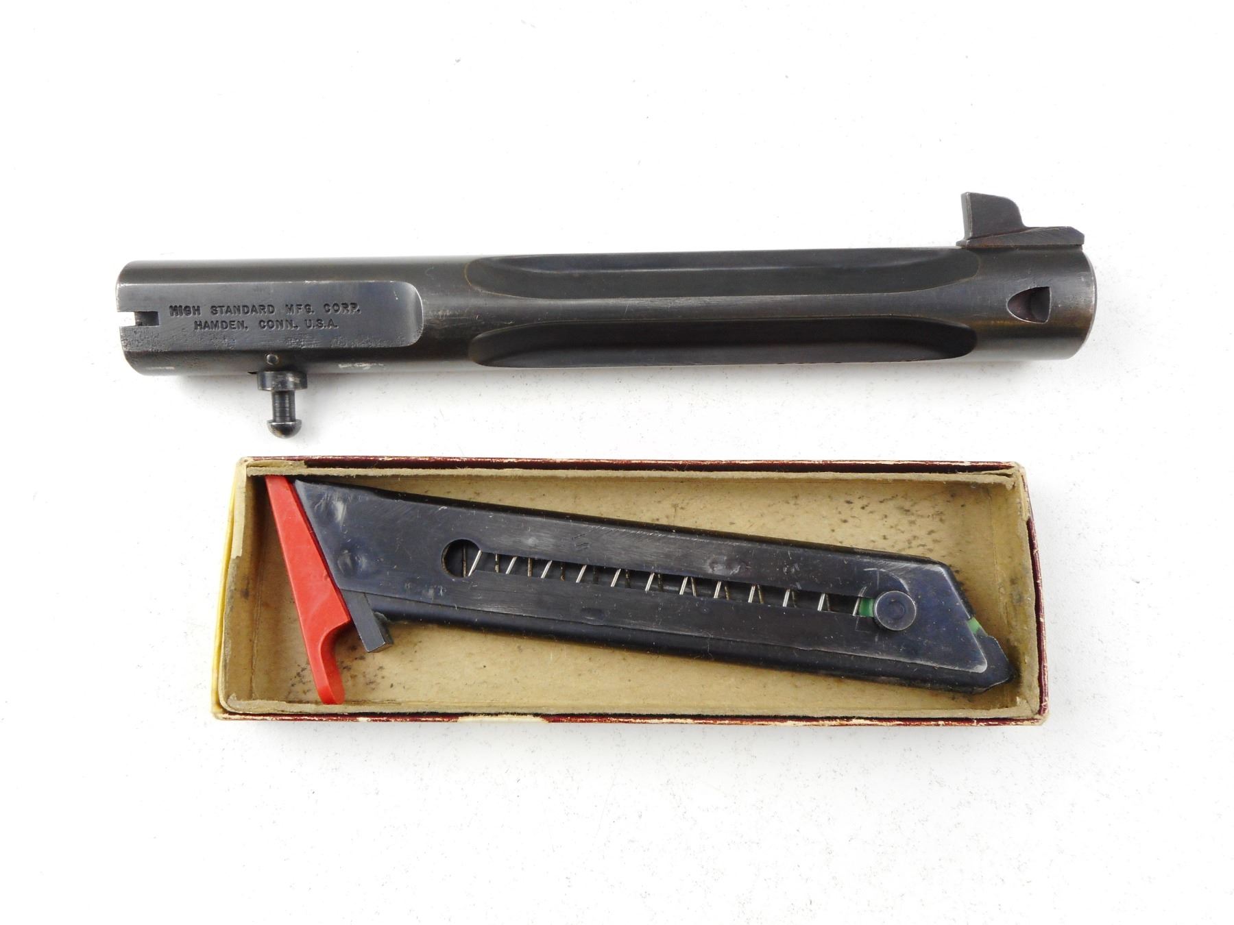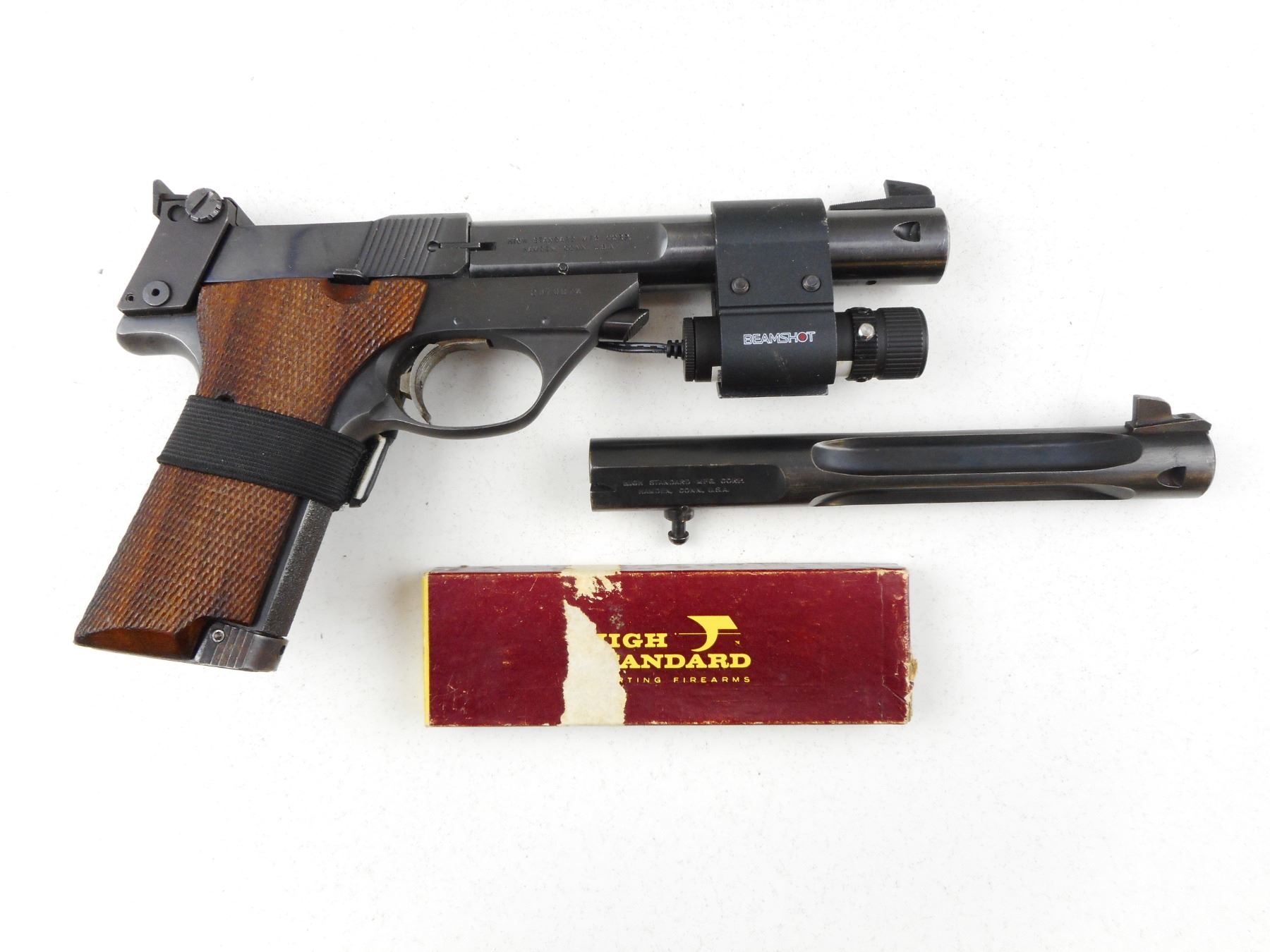 HIGH STANDARD , MODEL: SUPERMATIC CITATION , CALIBER: 22 LR , COMES WITH 2 MAGAZINES, SECOND BARREL 184MM WITH EXCELLENT BORE, OPERATIONAL LASER SIGHT MOUNTED ON GUN, BLADE FRONT AND ADJUSTABLE REAR SIGHT, EXCELLENT BORE ON MOUNTED BARREL, SHOWS VERY LITTLE HANDLING MARKS, CHECKERED WOOD GRIP PANELS, STIPPLED FRONT AND REAR GRIP STRAPS , ACTION: SEMI-AUTOMATIC HANDGUN , BARREL LENGTH: 140MM ATTACHED/ 184MM INCLUDED , CONDITION: 8/10 , STOCK # R2943 , SERIAL # 2370074 , CLASS: CANADIAN RESTRICTED CLASS
