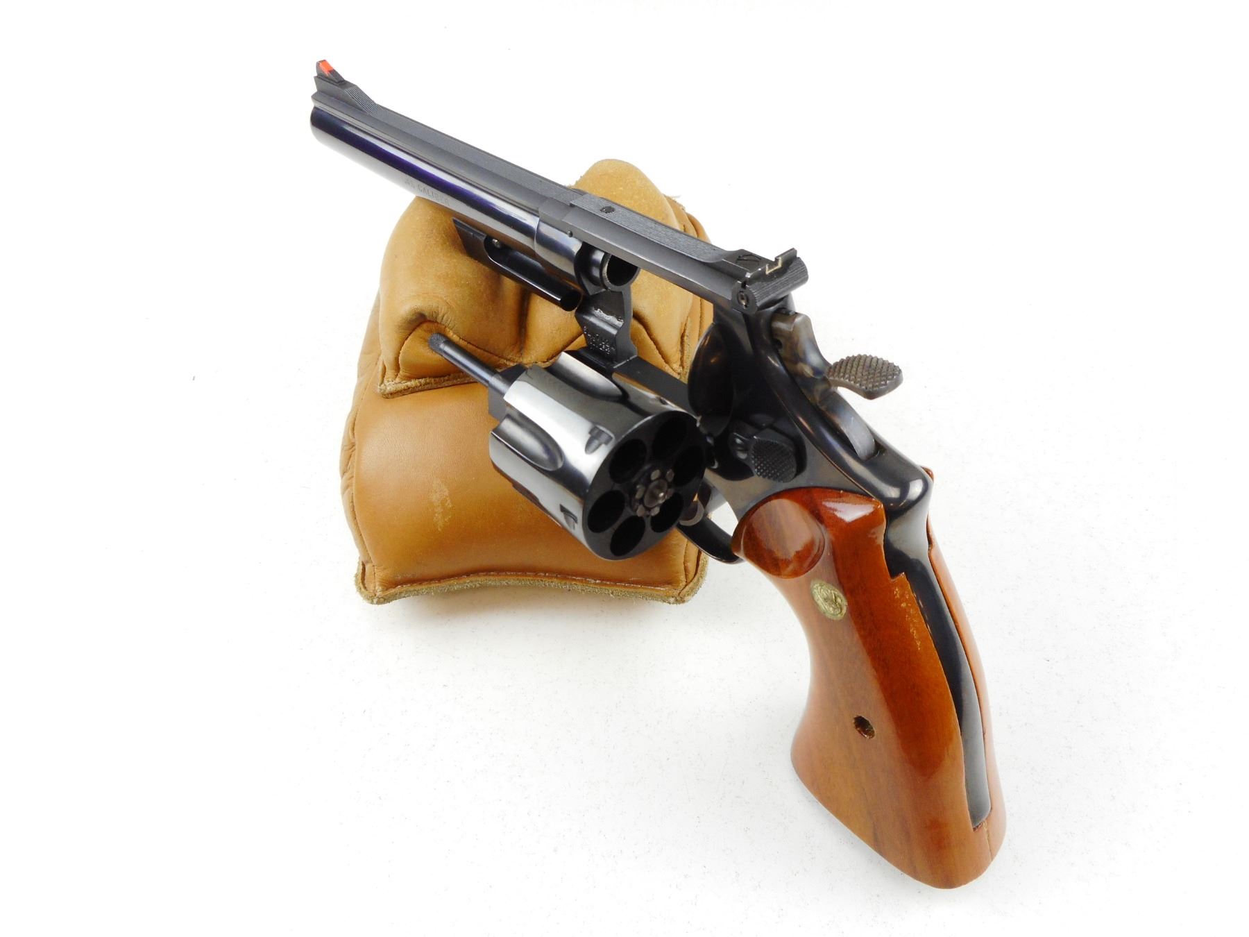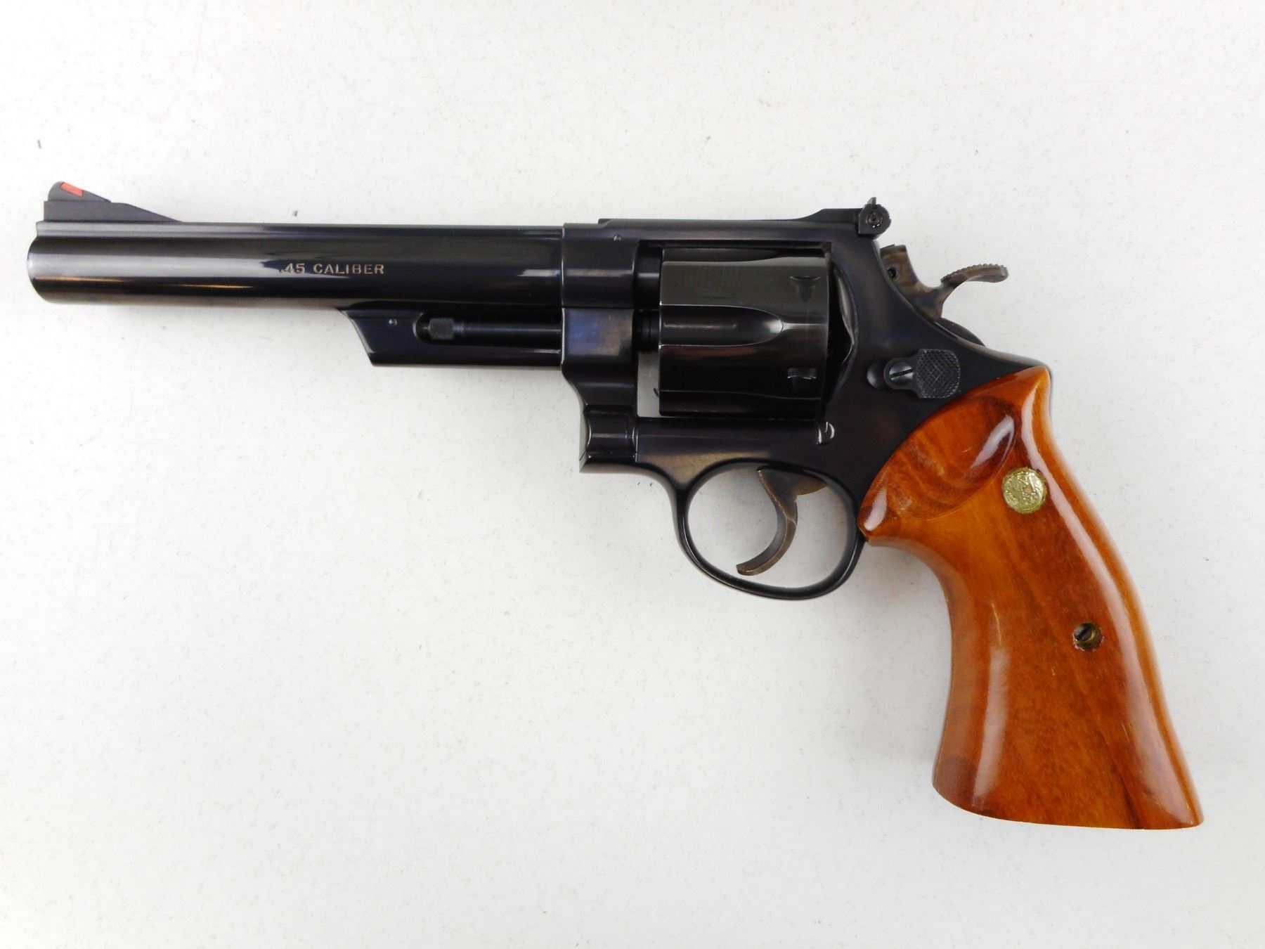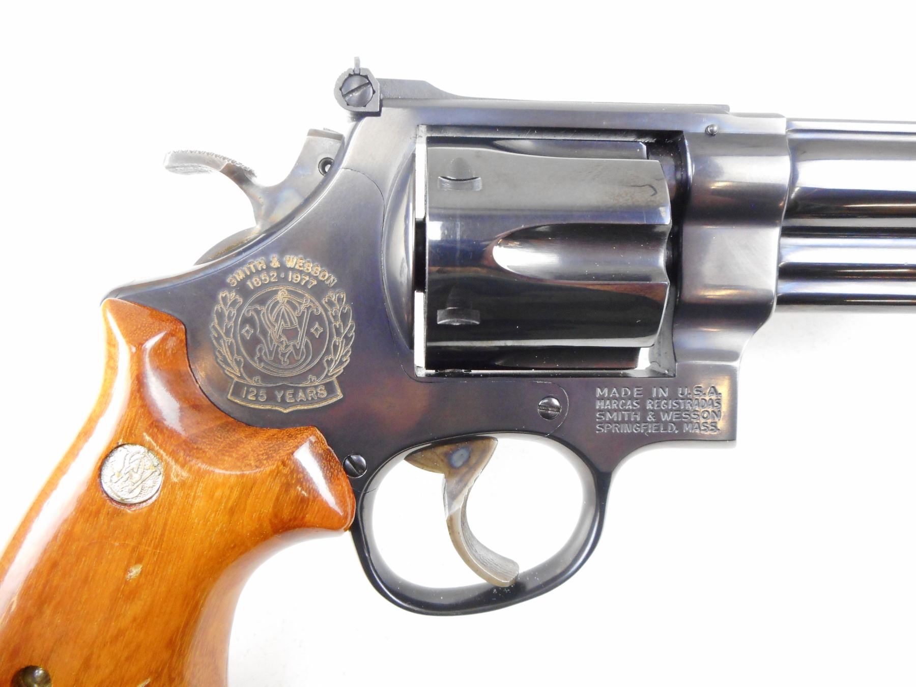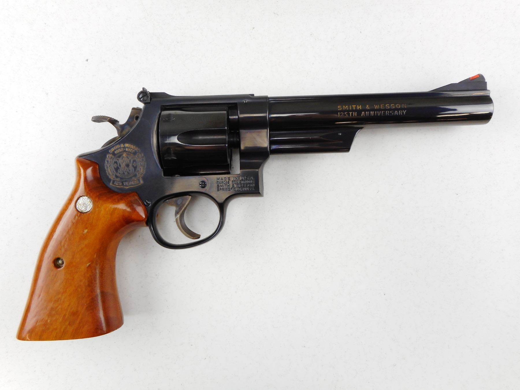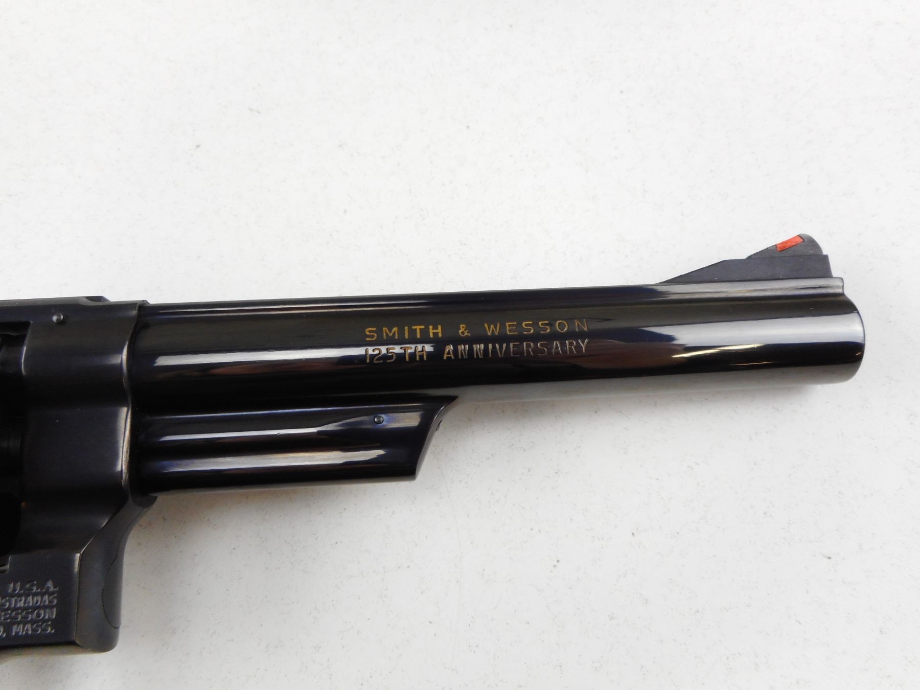 SMITH & WESSON , MODEL: 25-3 S& W 125 ANNIVERSARY COMMEMORATIVE , CALIBER: 45 LONG COLT , 6 SHOT CAPACITY, RED RAMP FRONT SIGHT WITH WHITE OUTLINE REAR SIGHT, GOLD LETTERING FOR THE 125TH ANNIVERSARY OF THE FOUNDING OF S& W,SIDE PLATE MARKED 125TH COMMEMORATIVE SEAL, GONLALOALES TARGET GRIPS WITH NICKEL PLATED S& W MEDALLIONS, , EXCELLENT BORE, BRIGHT BLUE FINISH, SHOWS VERY LITTLE HANDLING MARKS , ACTION: REVOLVER , BARREL LENGTH: 165MM , CONDITION: 9/10 , STOCK # R2945 , SERIAL # SW7624 OF SERIAL # RANGE SW00001-SW10000 , CLASS: CANADIAN RESTRICTED CLASS