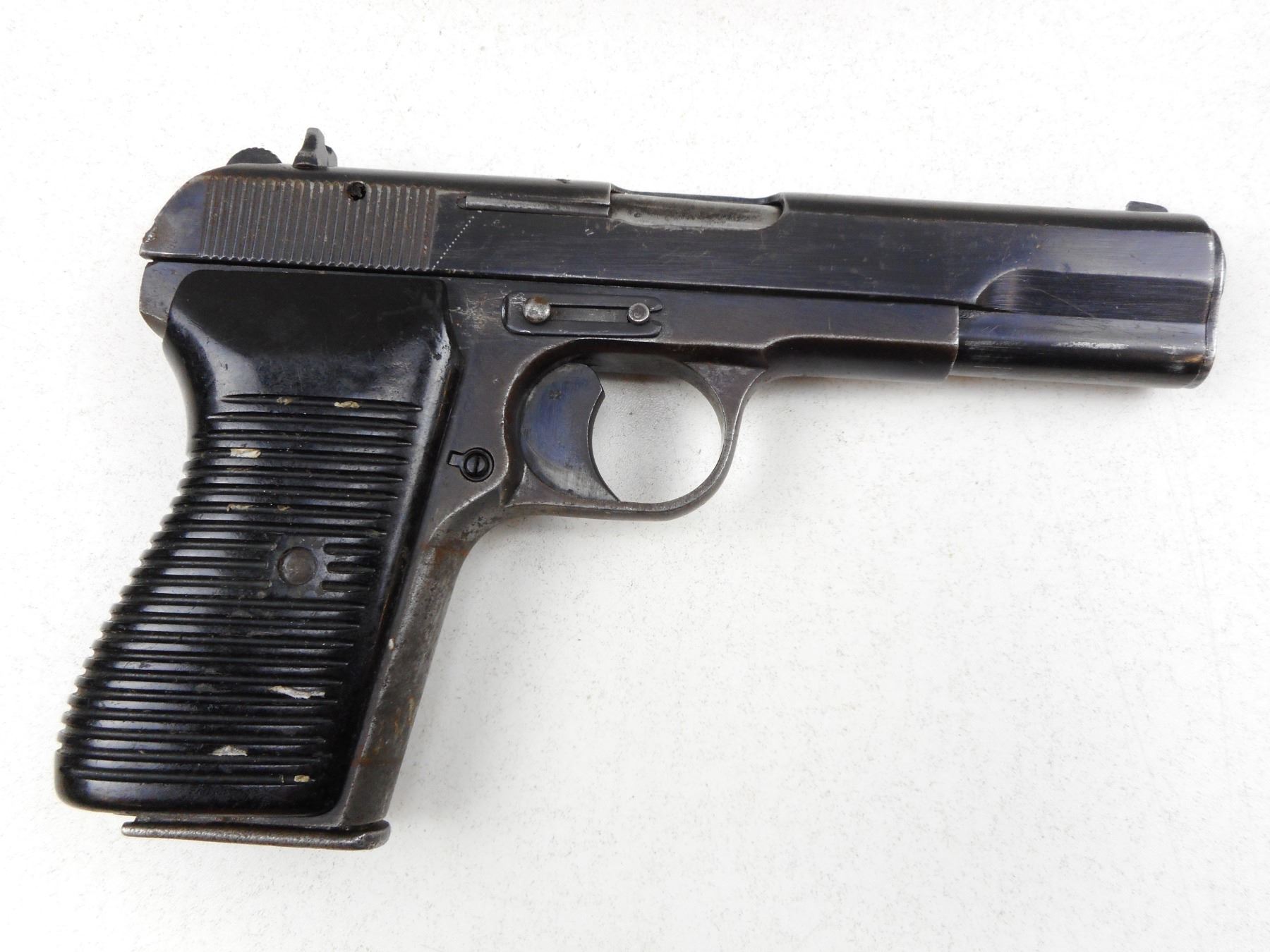 TOKEGYPT , MODEL: 58 , CALIBER: FIRES 9MM LUGER , COMES WITH MAGAZINE 8 SHOT CAPACITY, MISSING FIRING PIN, EQUIPPED WITH A 7.62 X 25 TOKAREV MAG THAT WILL WORK IN 9MM, DARK BORE, SHOWS SOME HANDLING MARKS, FIXED FRONT AND REAR SIGHTS, SLIDE IS CRACKED NEAR THE BREACH, SHOWS EXTENSIVE HANDLING MARKS , ACTION: SEMI-AUTOMATIC HANDGUN , BARREL LENGTH: 115MM , CONDITION: 4/10 , STOCK # R2956 , SERIAL # F01468 , CLASS: CANADIAN RESTRICTED CLASS